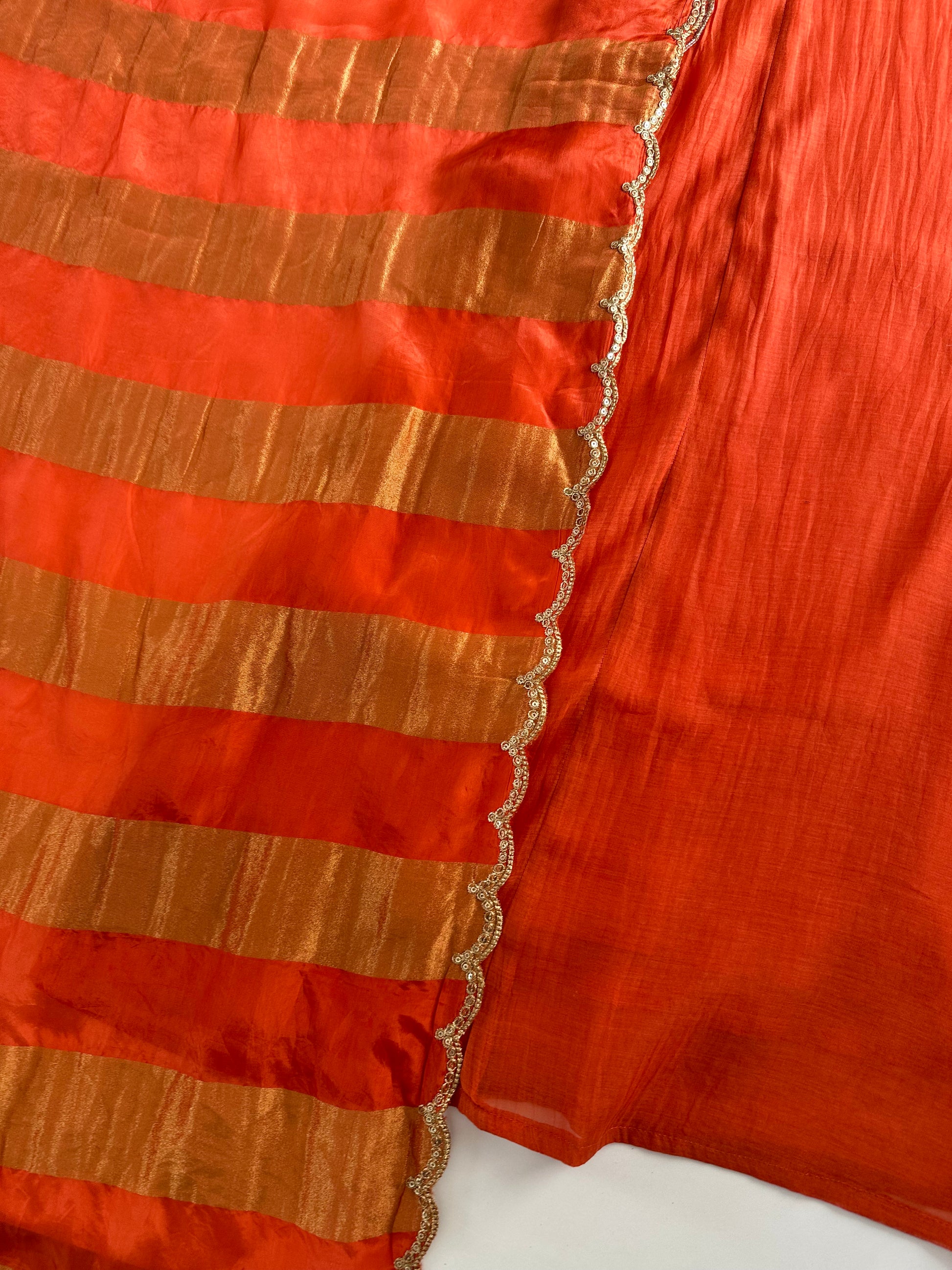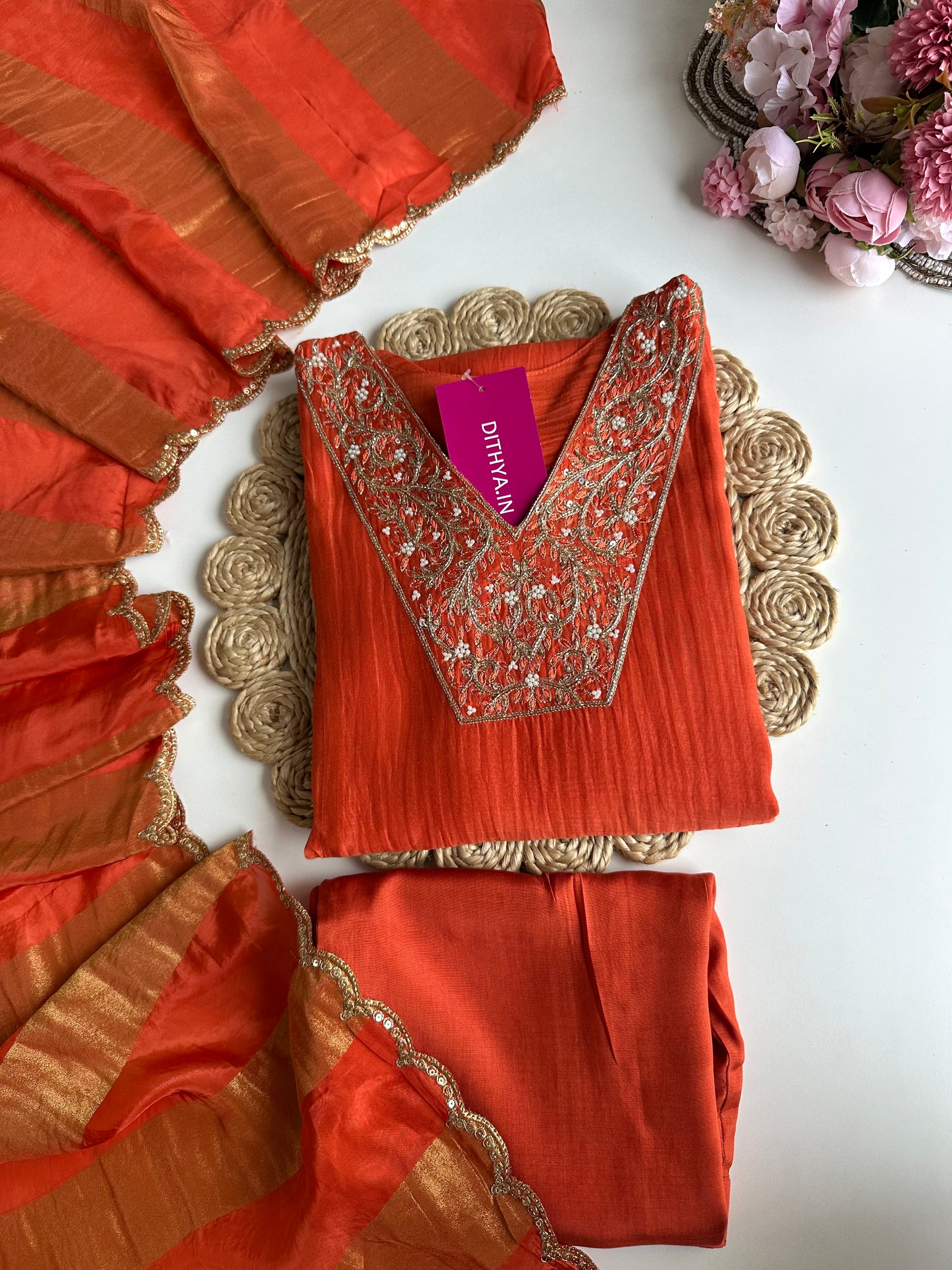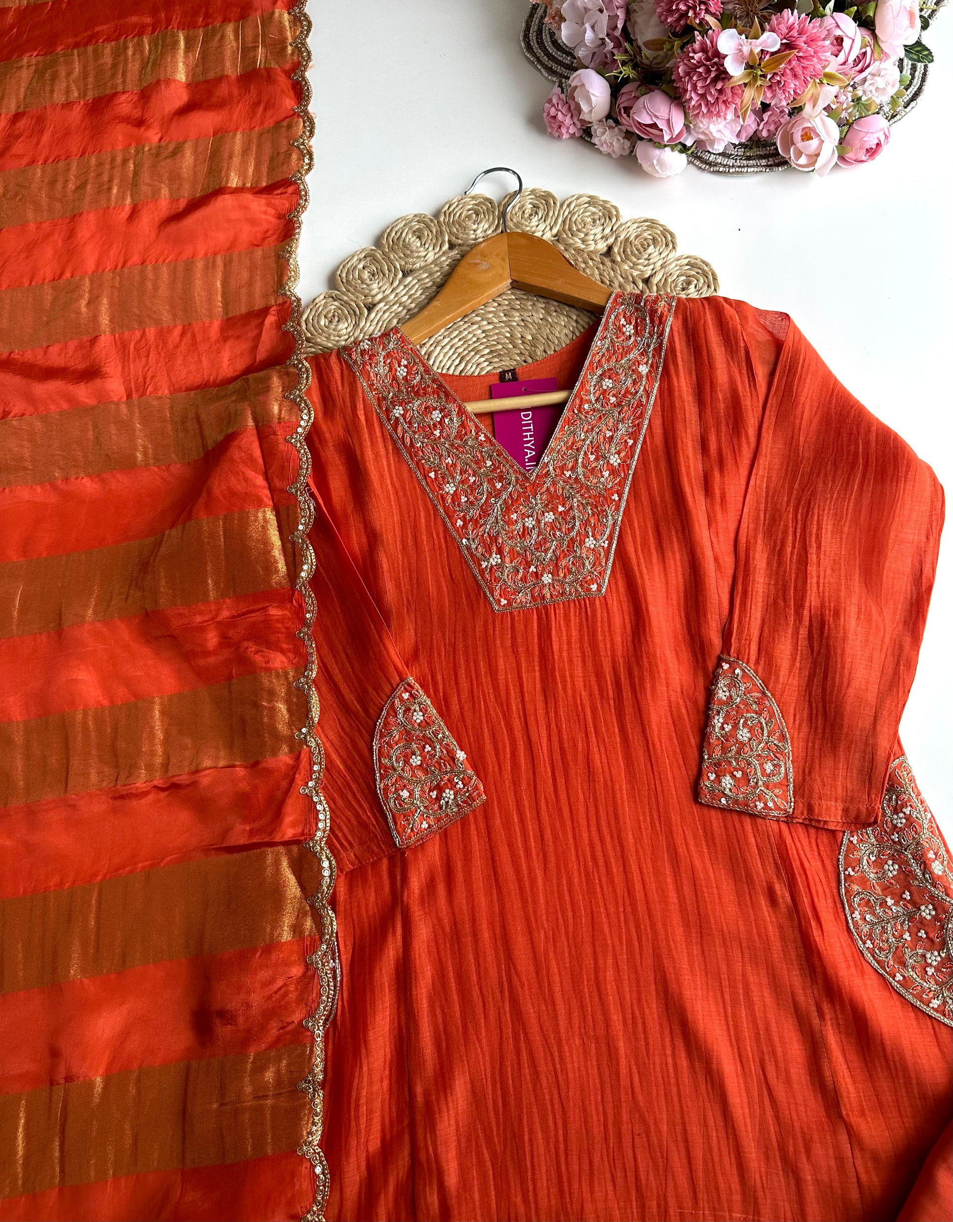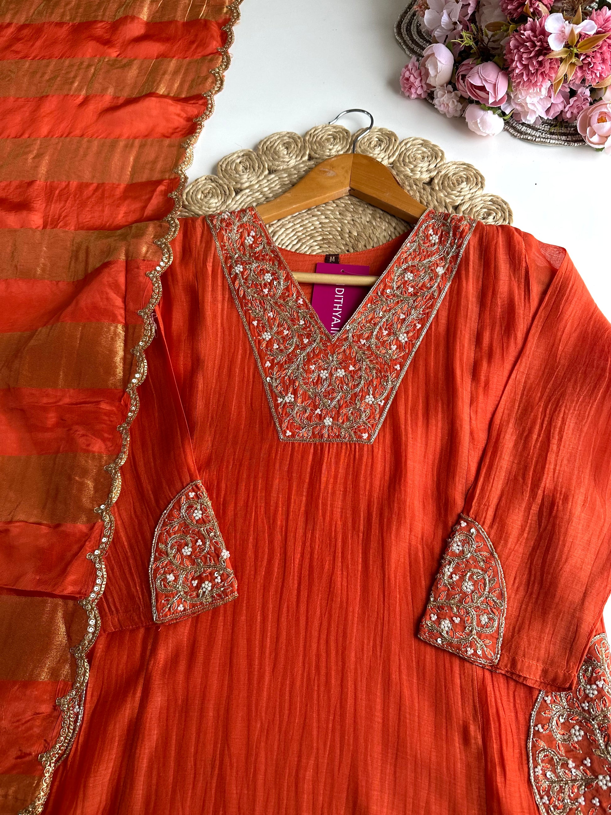 K332 - Mul Chanderi handwork Aline Kurti with pants and gaji organza dupatta