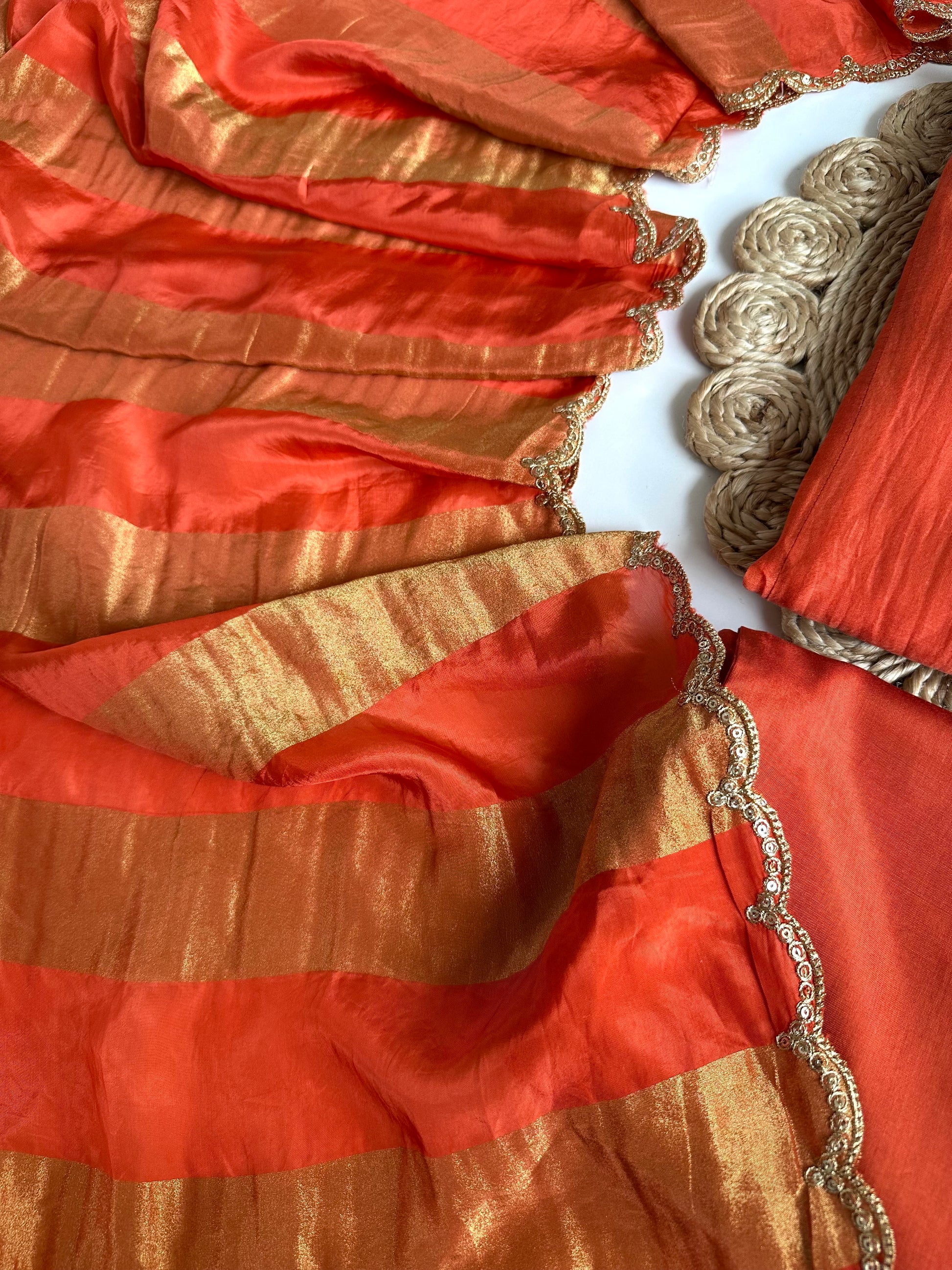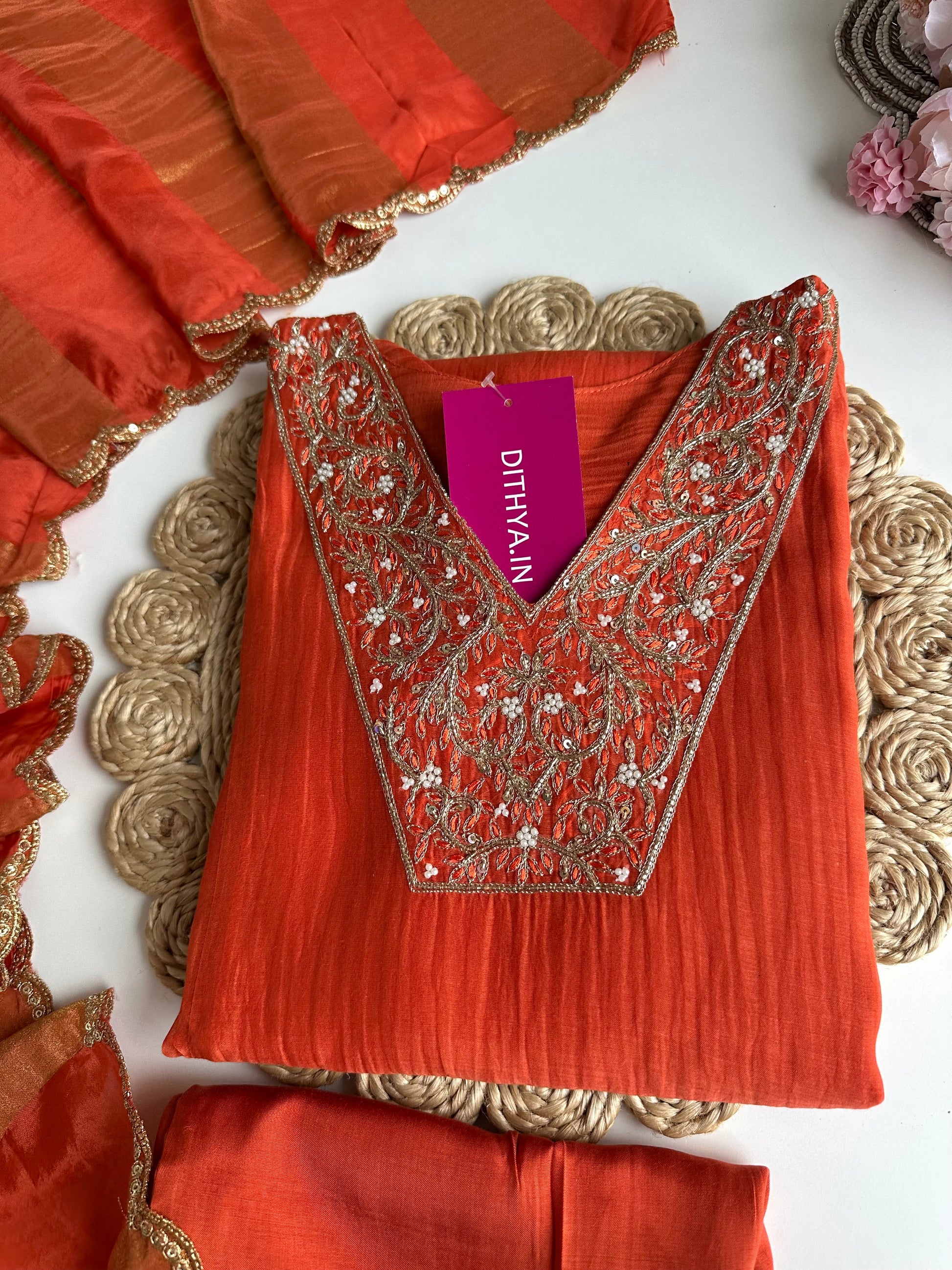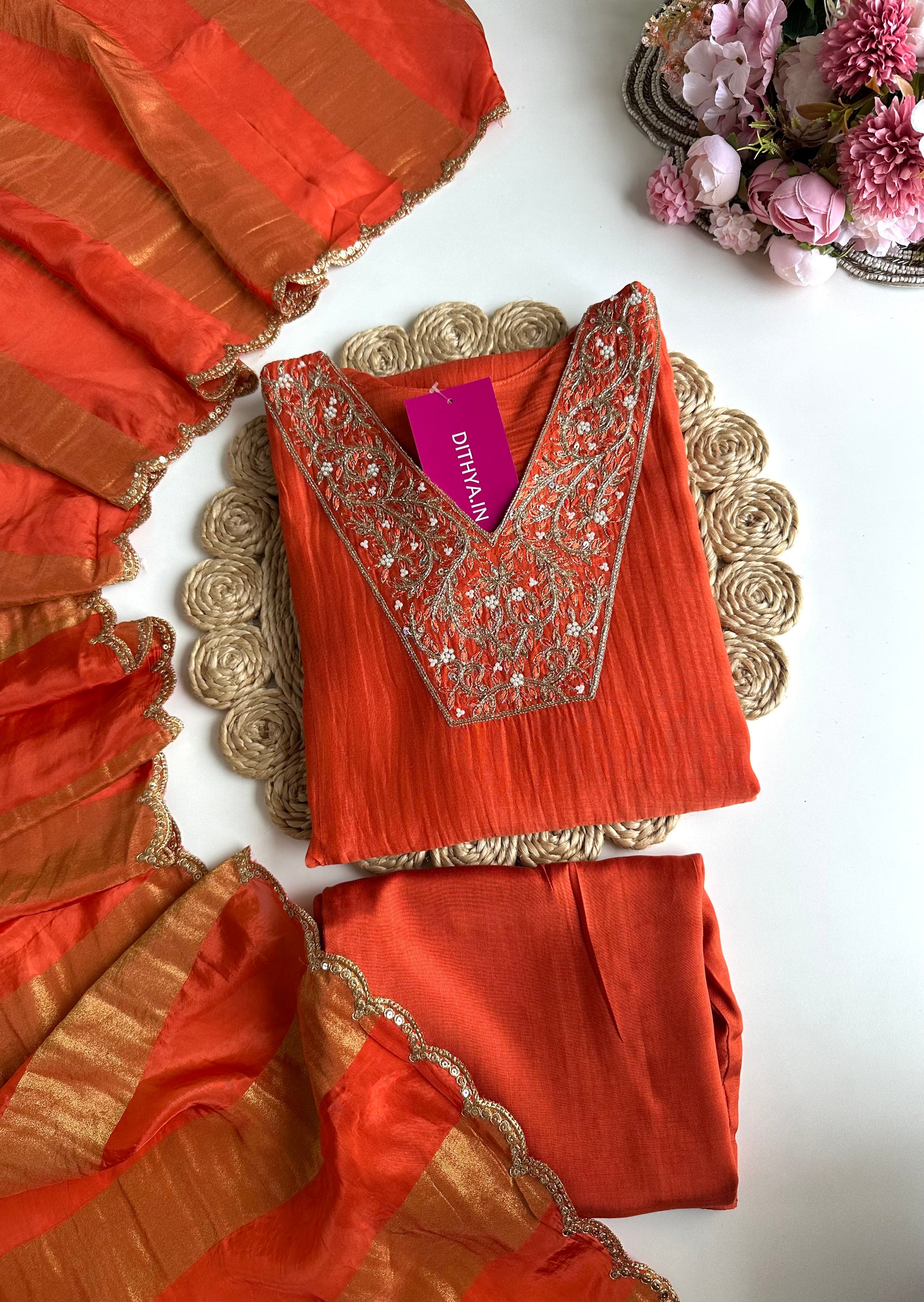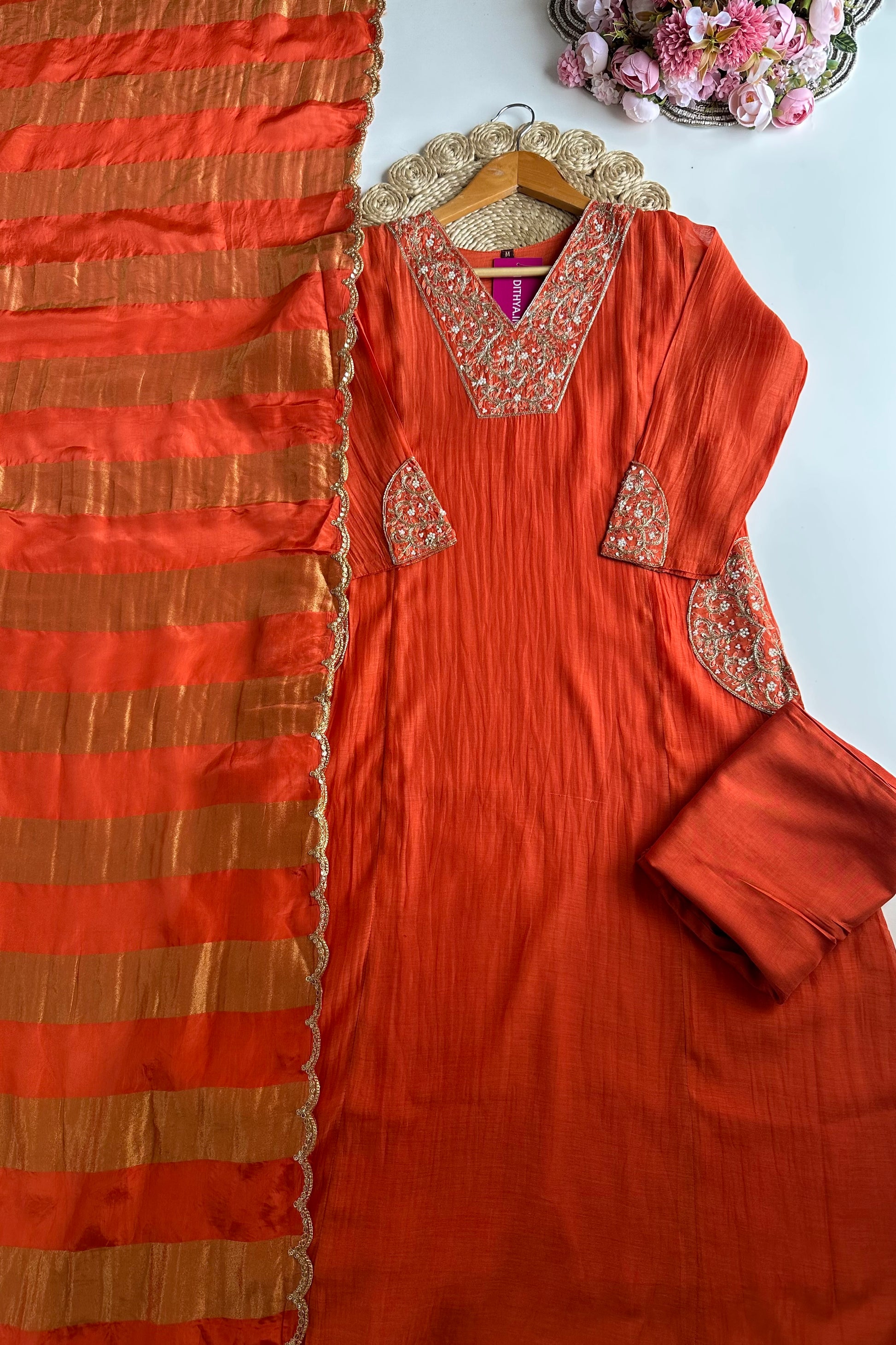 K332 - Mul Chanderi handwork Aline Kurti with pants and gaji organza dupatta