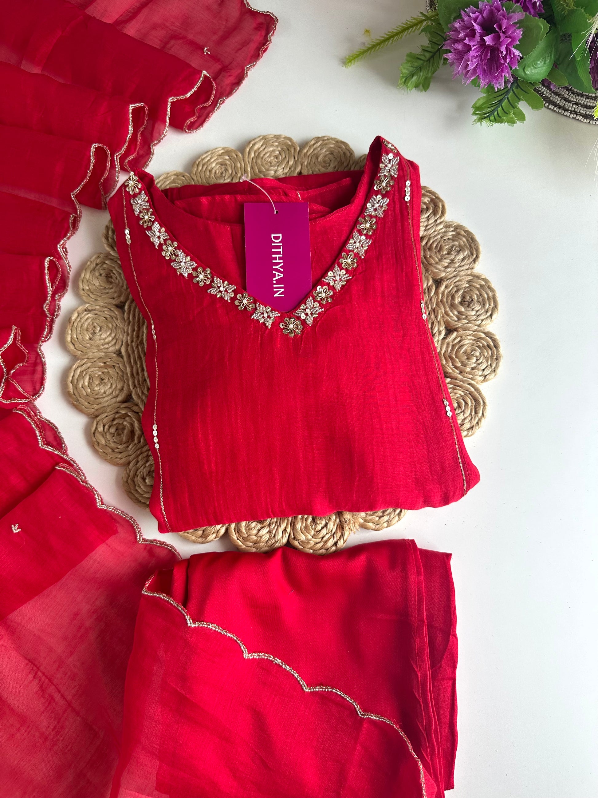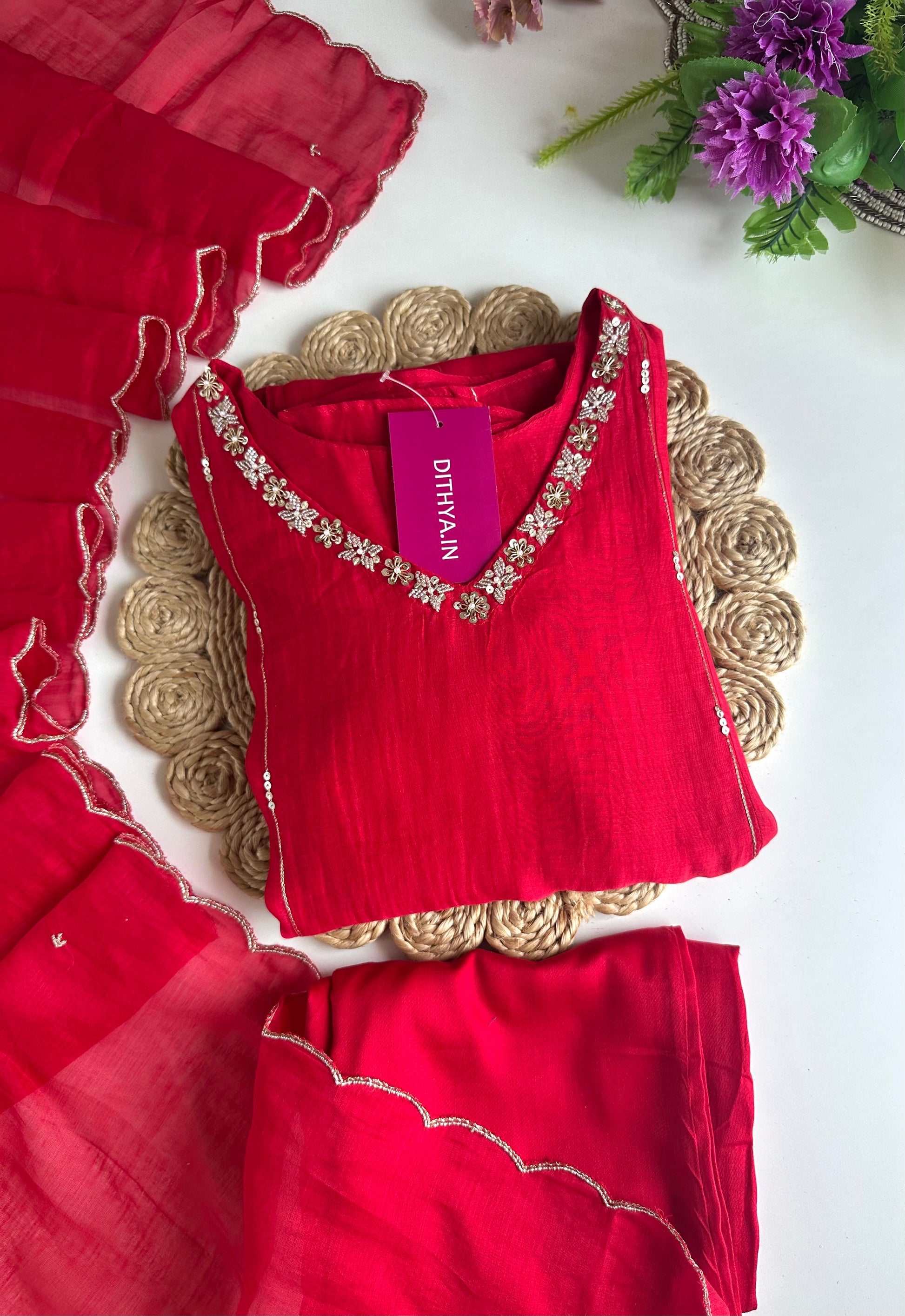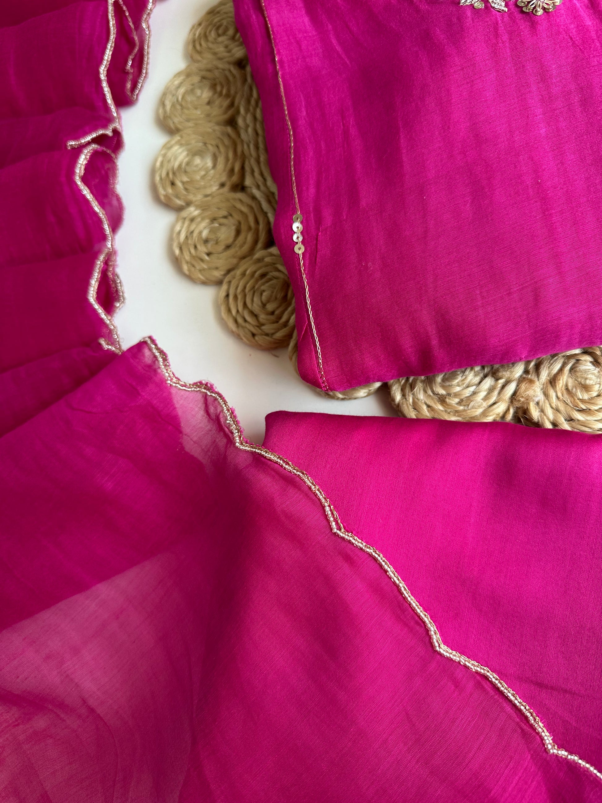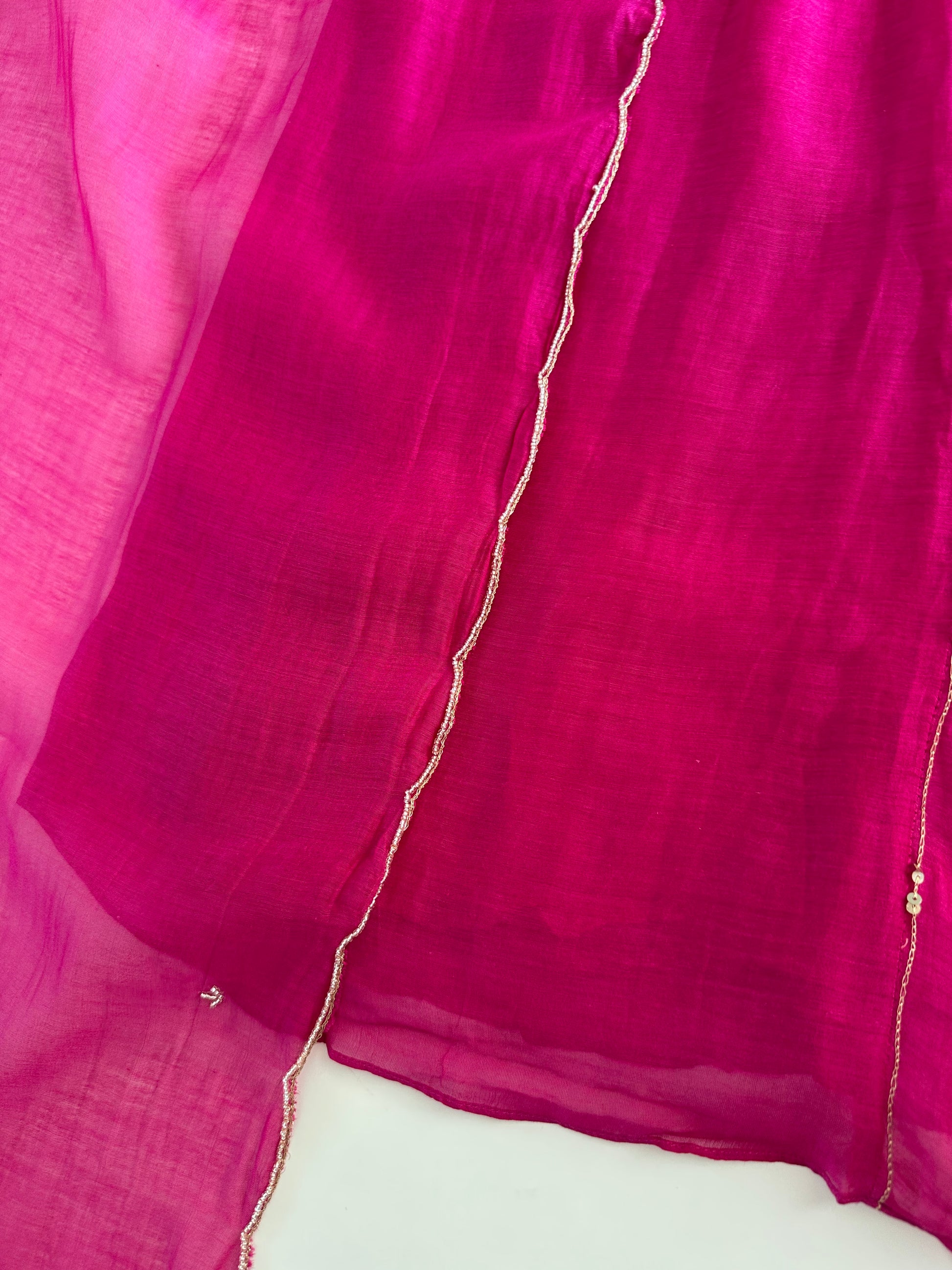 Upgrade your ethnic wardrobe with this stunning Mul Chanderi handwork Anarkali. Made with premium quality fabric, this set comes with a matching pair of pants and a dupatta. Perfect for any special occasion, the intricate handwork adds a touch of elegance to your look. Experience the comfort and style of Mul Chanderi with this timeless piece.