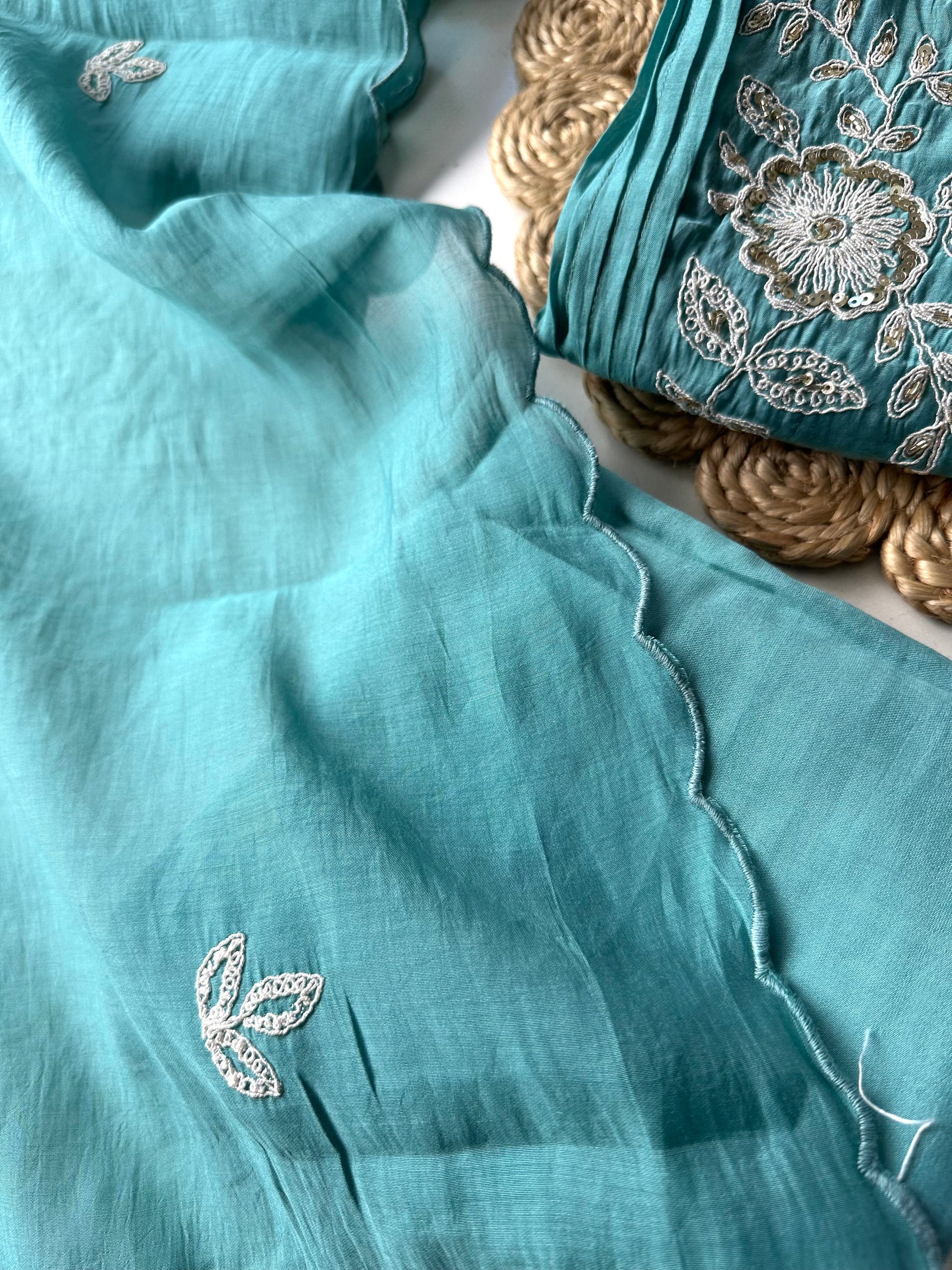 This Mul Chanderi handwork Anarkali set includes a beautifully crafted Anarkali dress, matching pants, and a dupatta. Made with luxurious Mul Chanderi fabric, the handwork adds an elegant touch. Perfect for any special occasion, this set offers versatility and style.