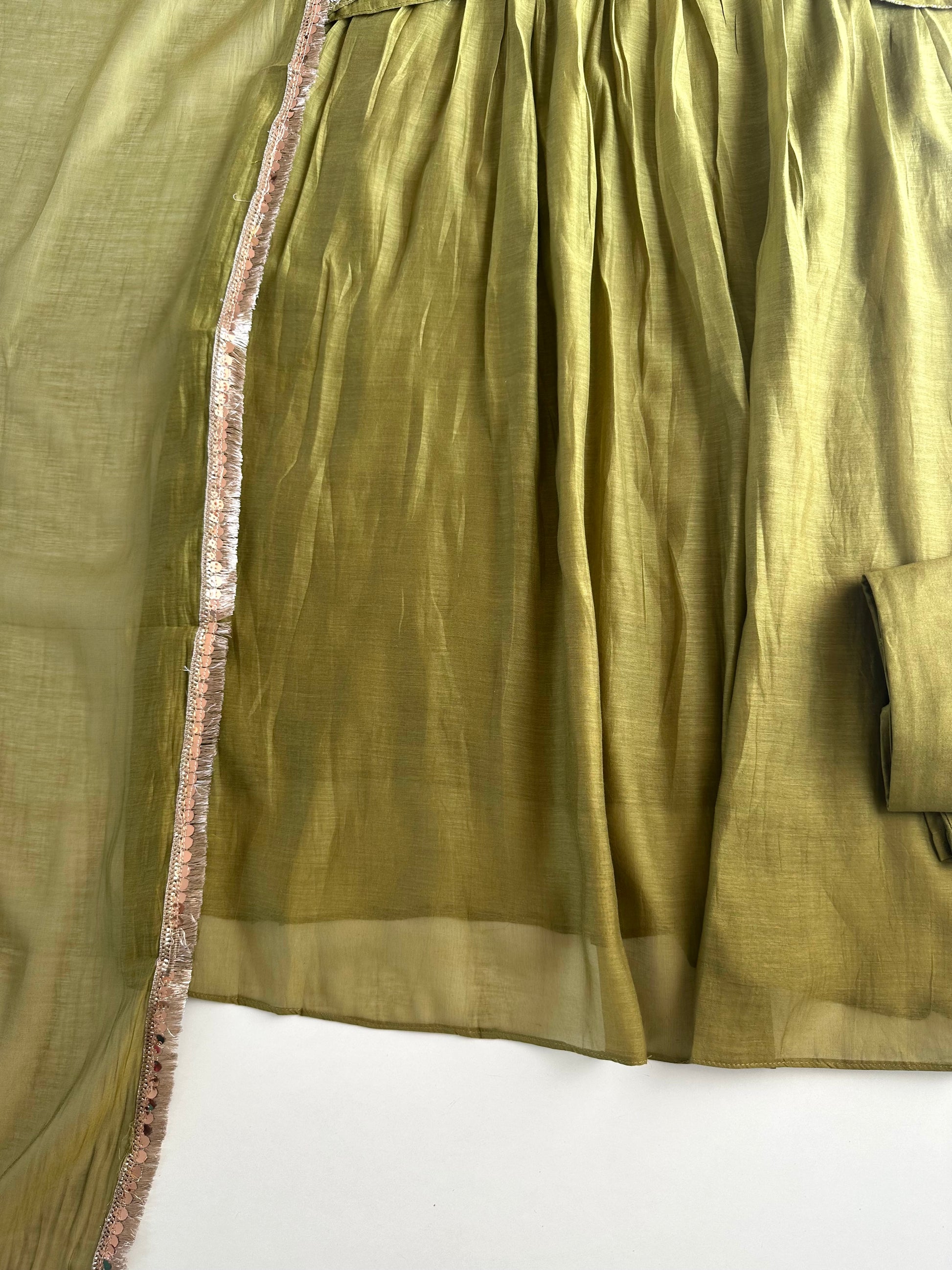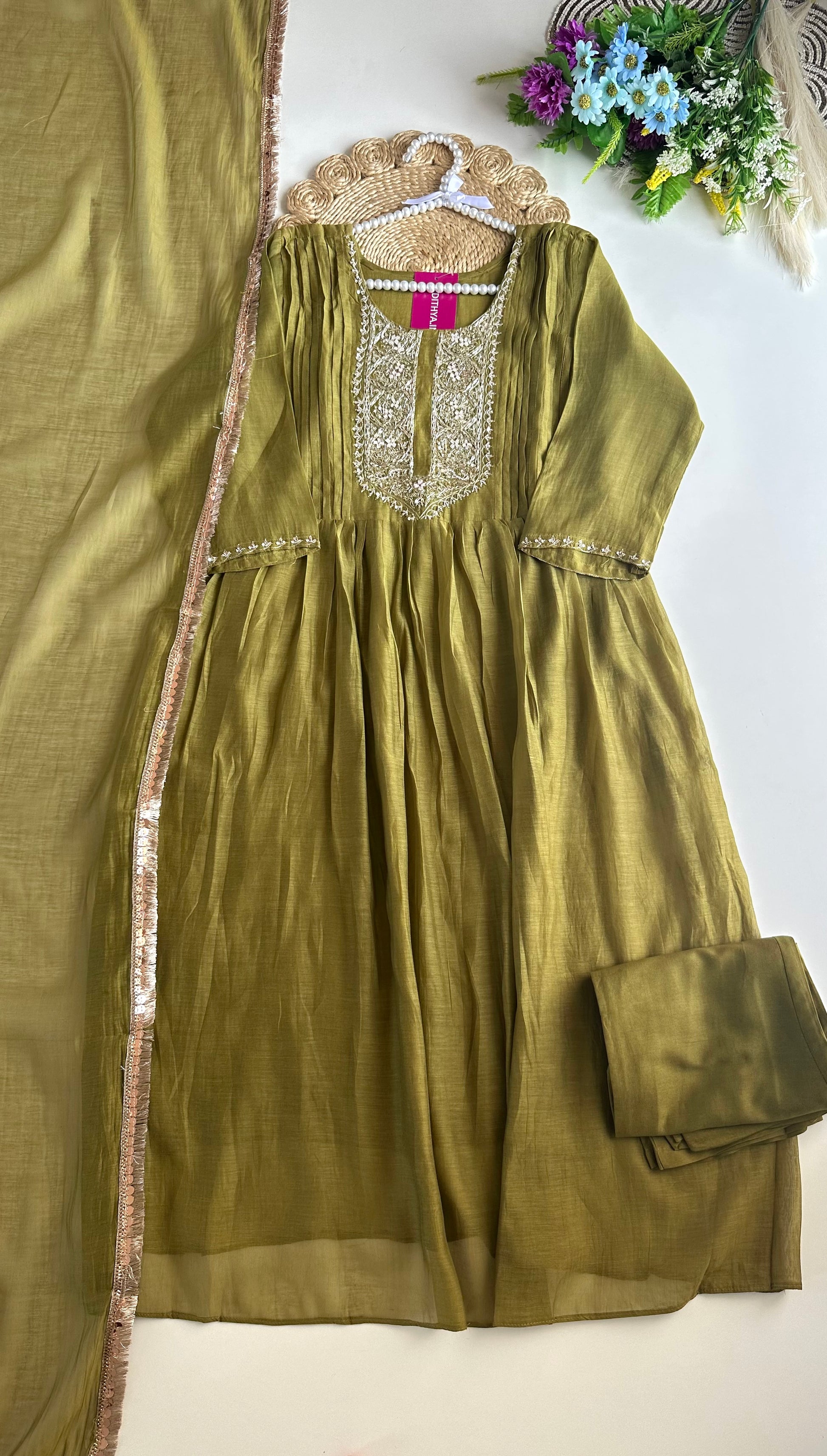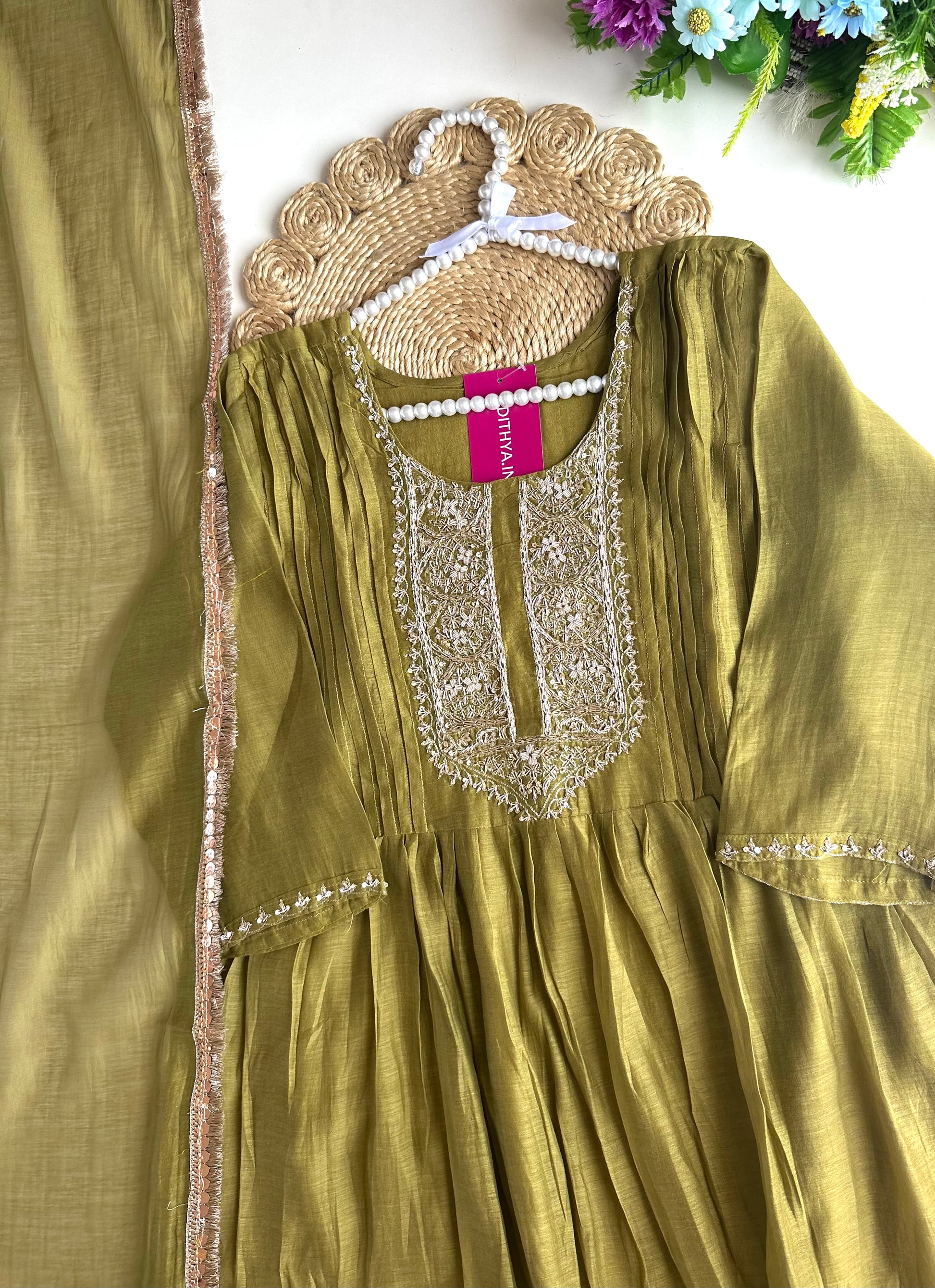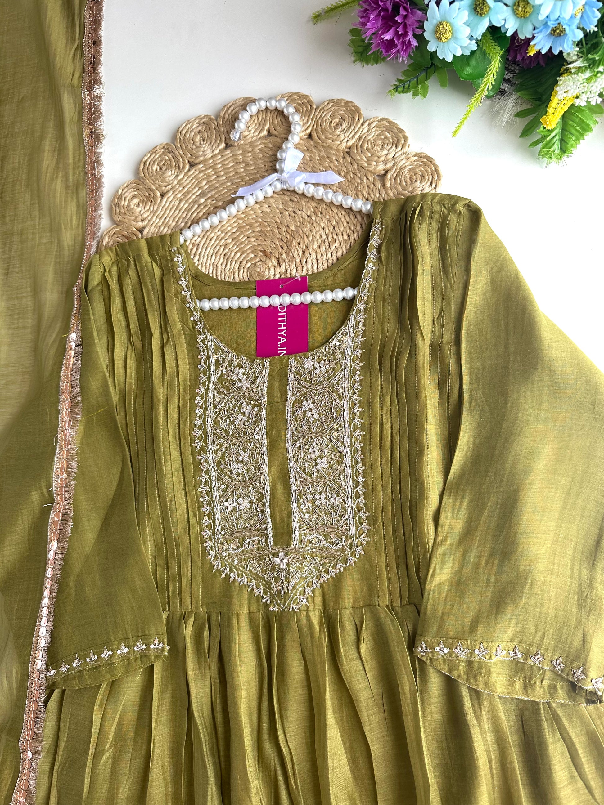 Expertly crafted with Mul Chanderi fabric and intricate handiwork, this Anarkali outfit comes with matching pants and a dupatta. Elevate your style with traditional craftsmanship and timeless elegance. Perfect for special occasions or formal gatherings, this set will add a touch of sophistication to your wardrobe.