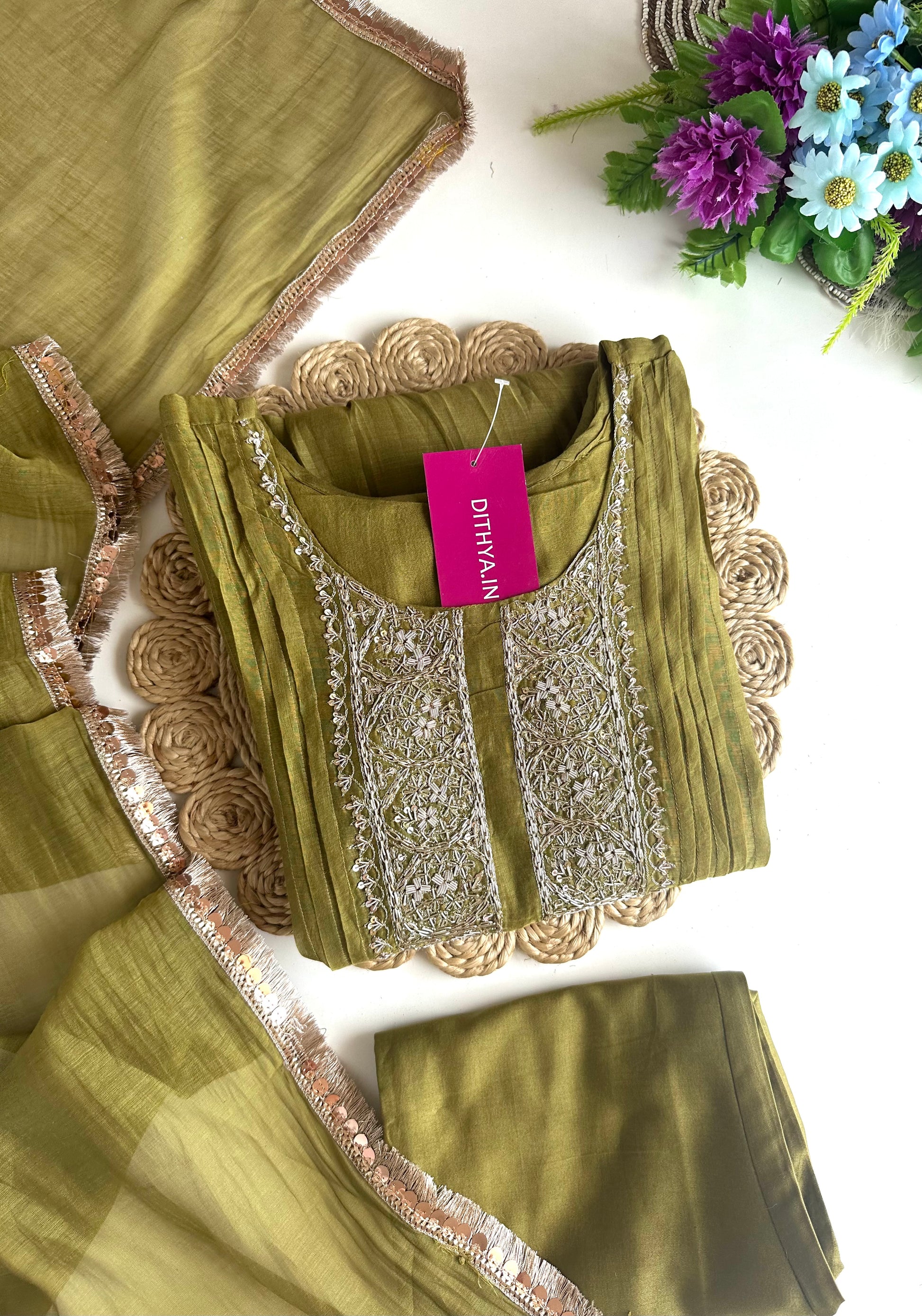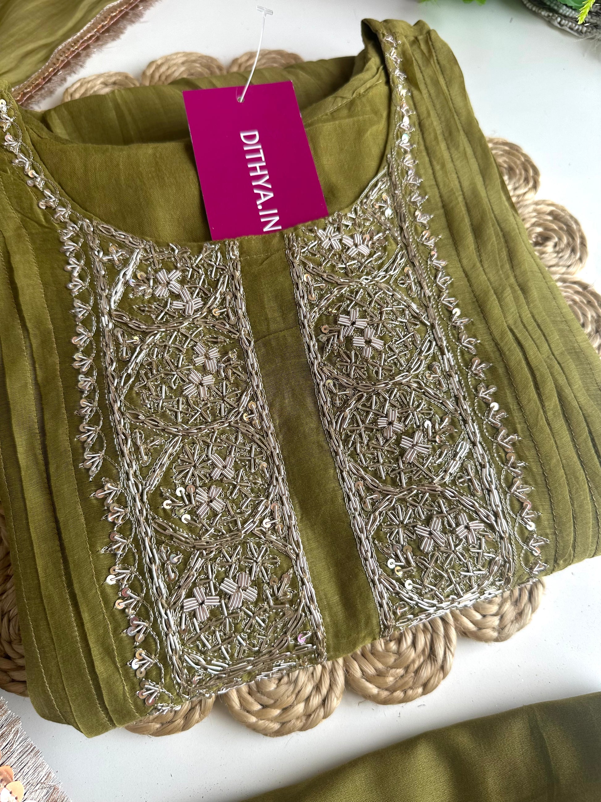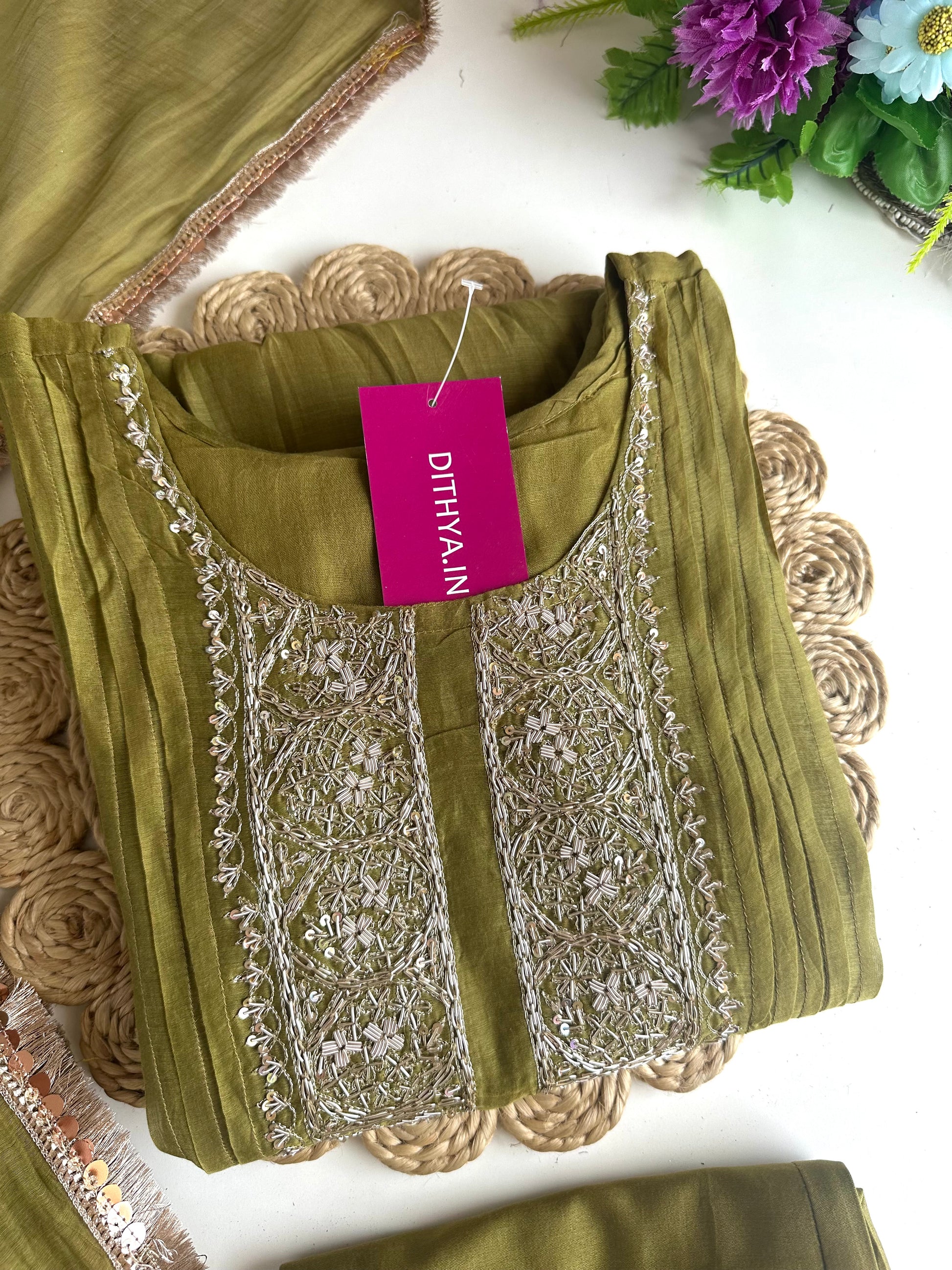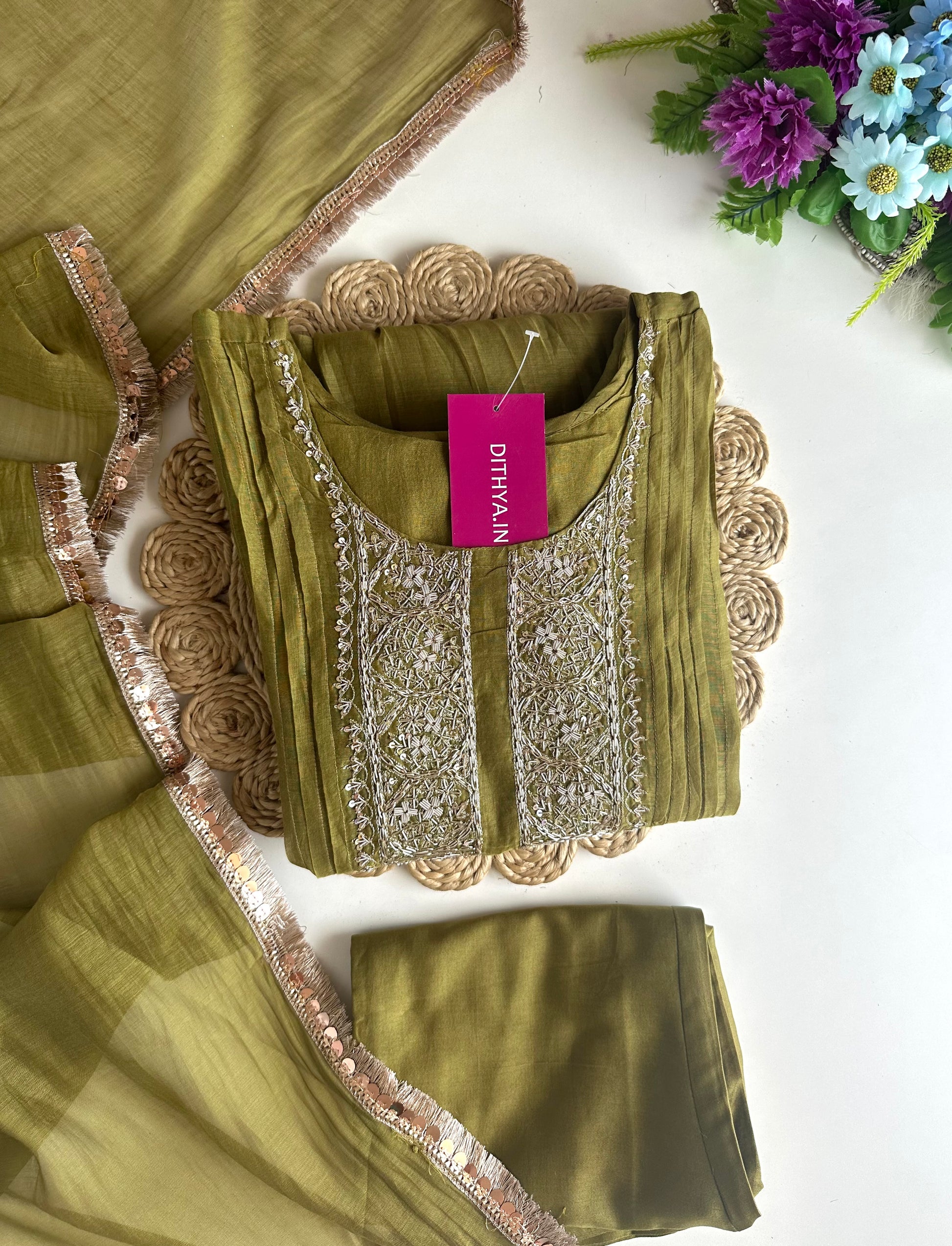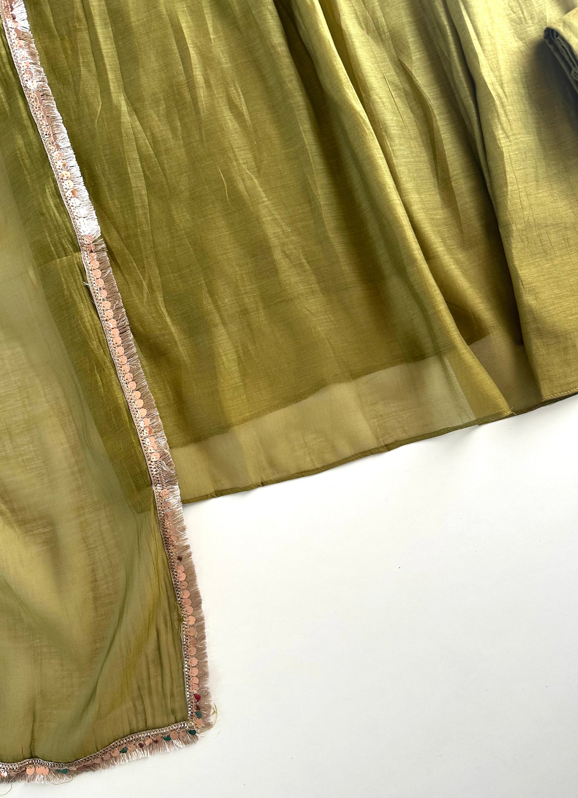 Expertly crafted with Mul Chanderi fabric and intricate handiwork, this Anarkali outfit comes with matching pants and a dupatta. Elevate your style with traditional craftsmanship and timeless elegance. Perfect for special occasions or formal gatherings, this set will add a touch of sophistication to your wardrobe.