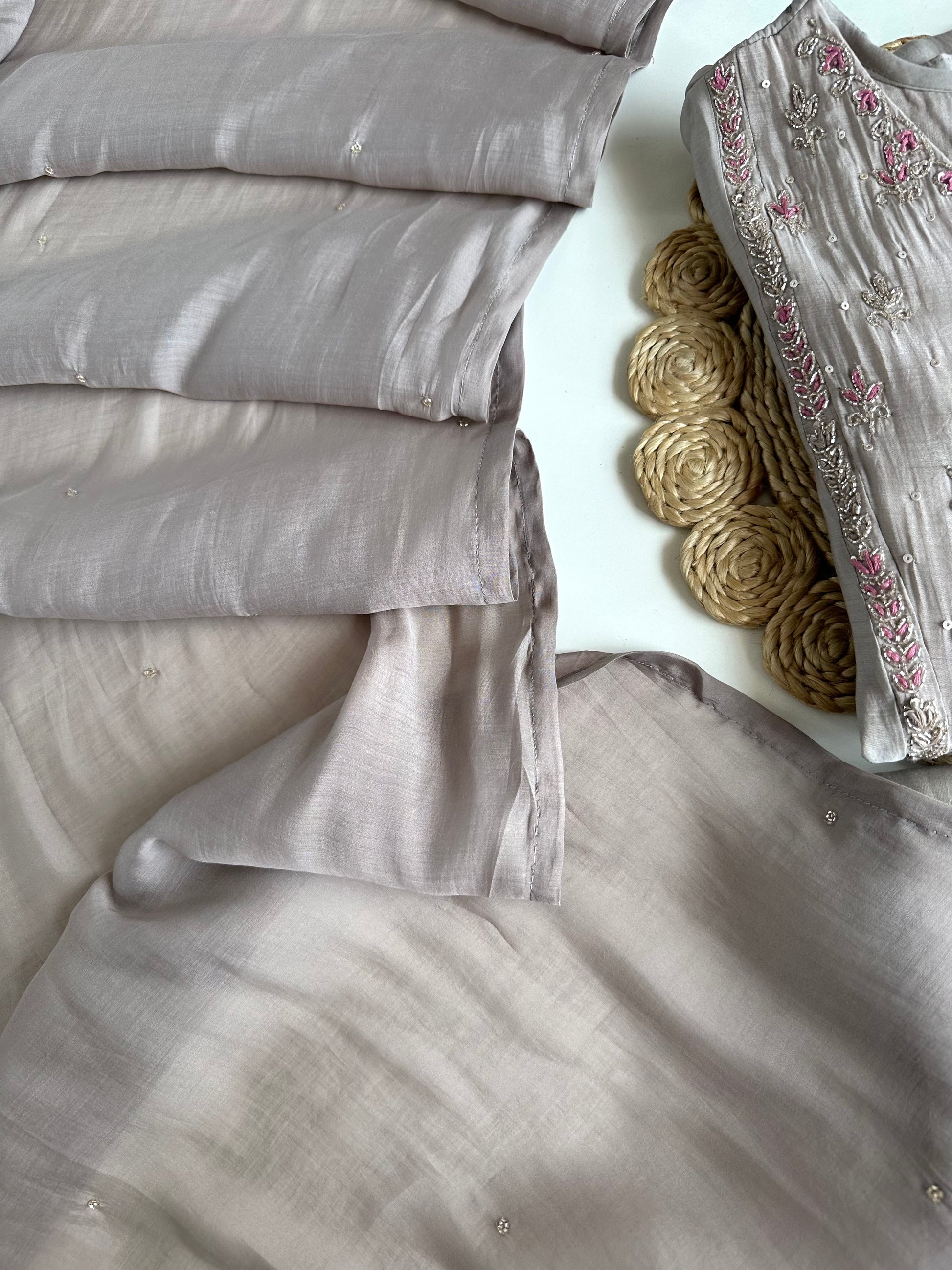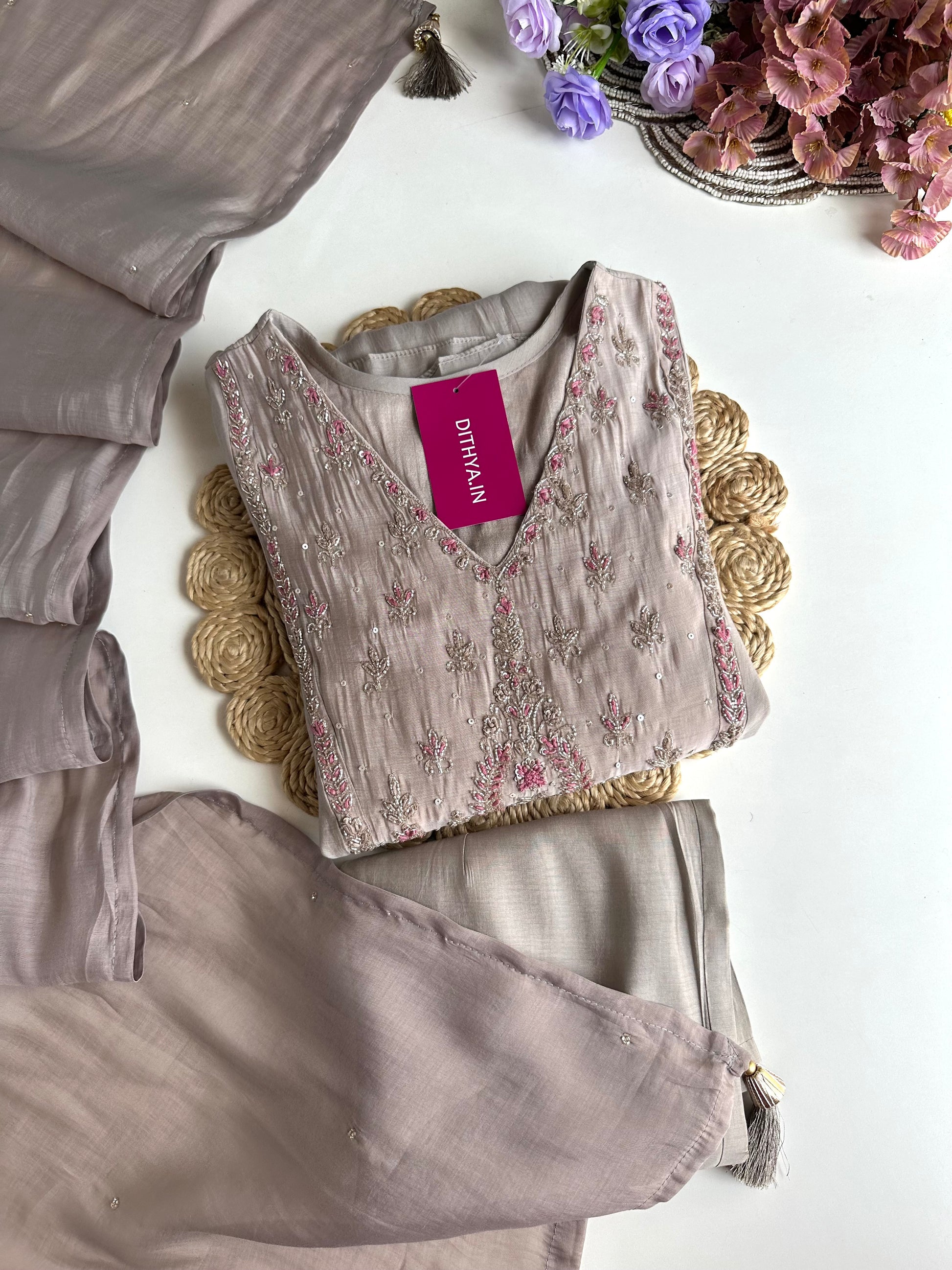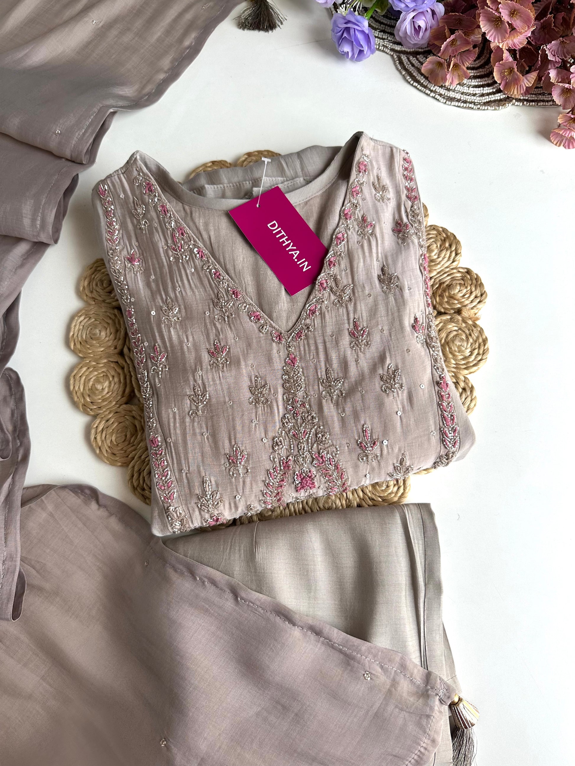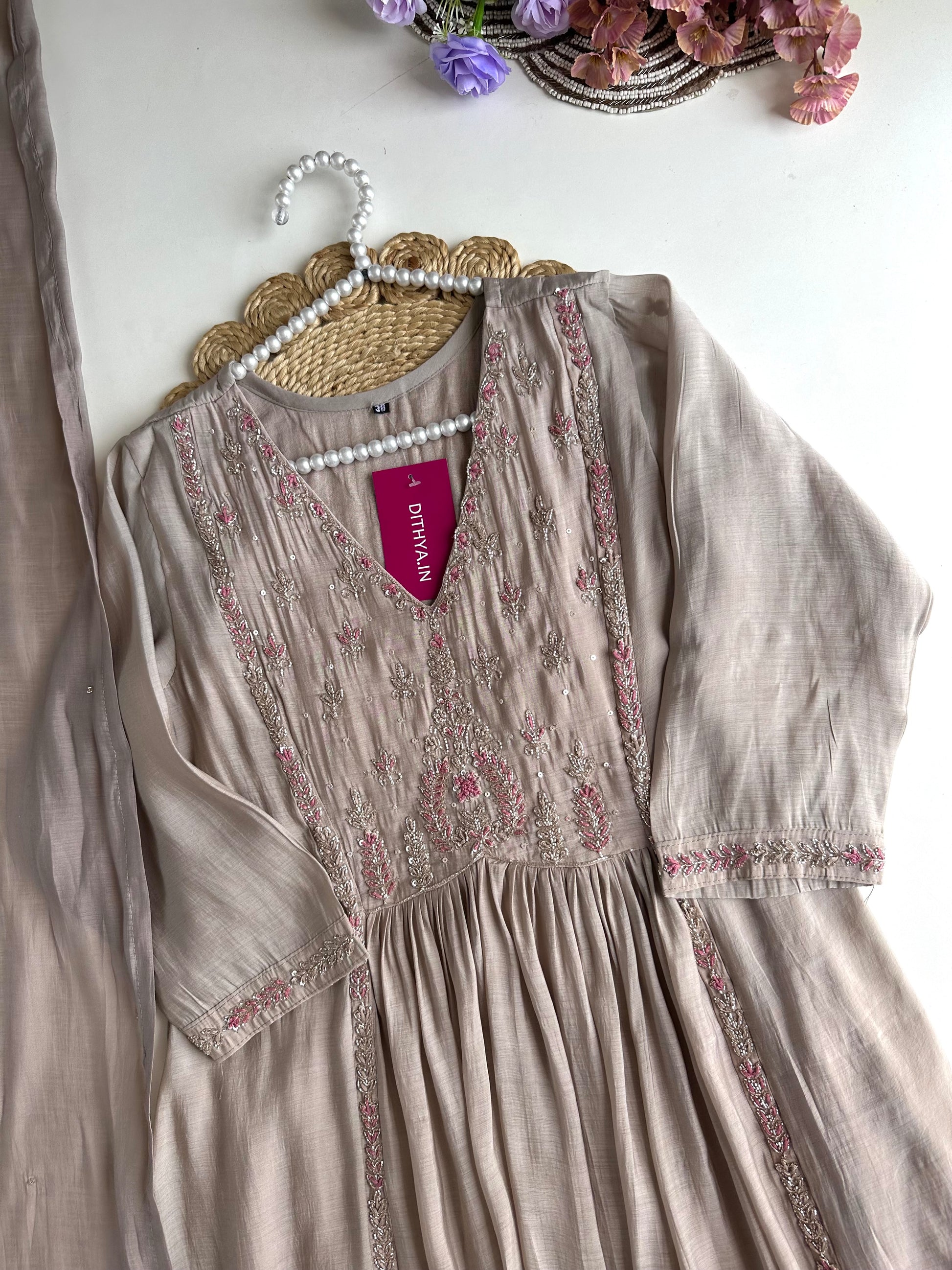 Indulge in the timeless elegance of our Mul Chanderi Handwork Anarkali. Crafted from premium quality mul chanderi fabric, this piece features intricate handwork. Paired with pants and a dupatta, this outfit is the epitome of traditional yet modern style. Elevate your wardrobe with this exquisite ensemble.