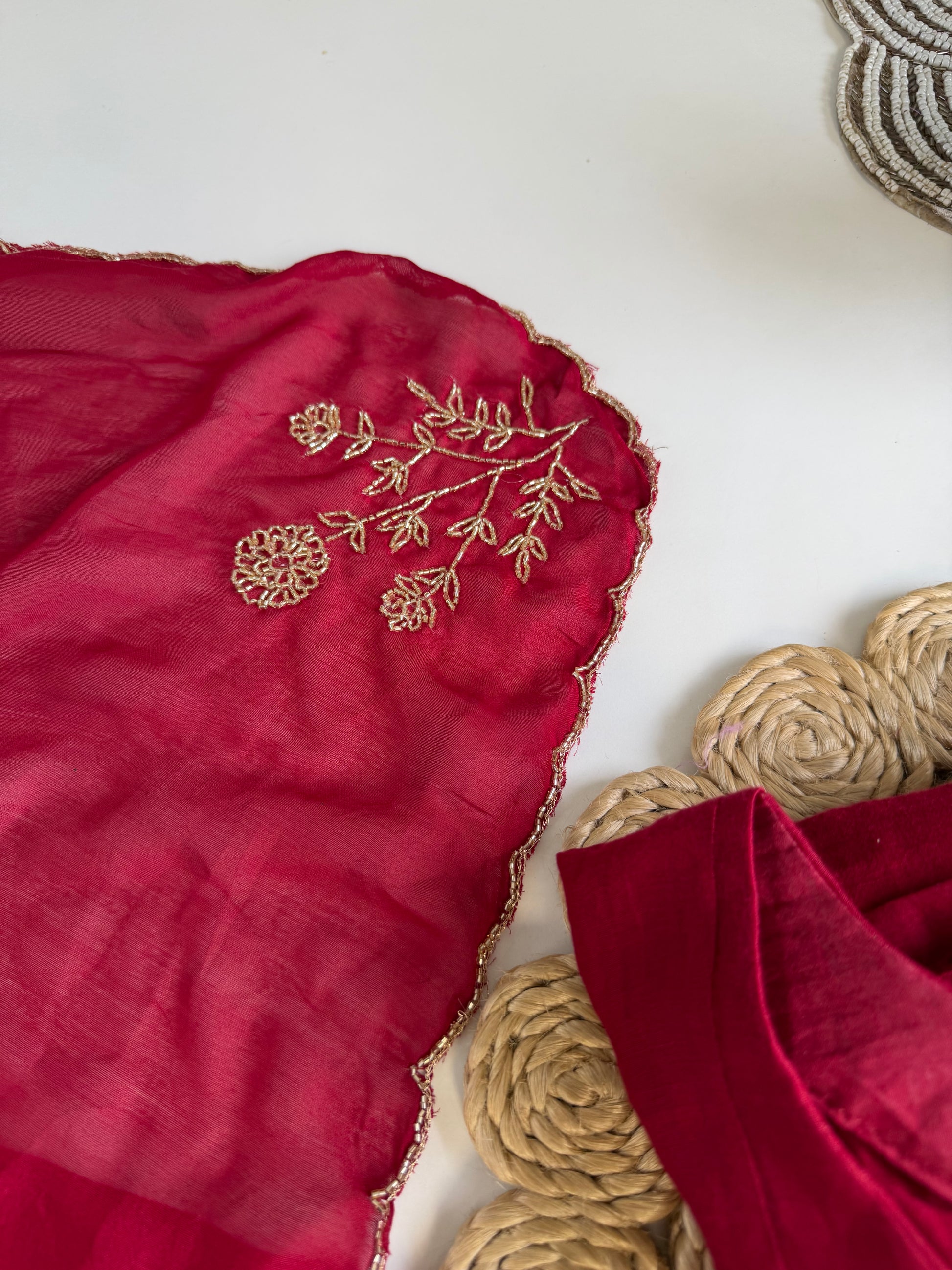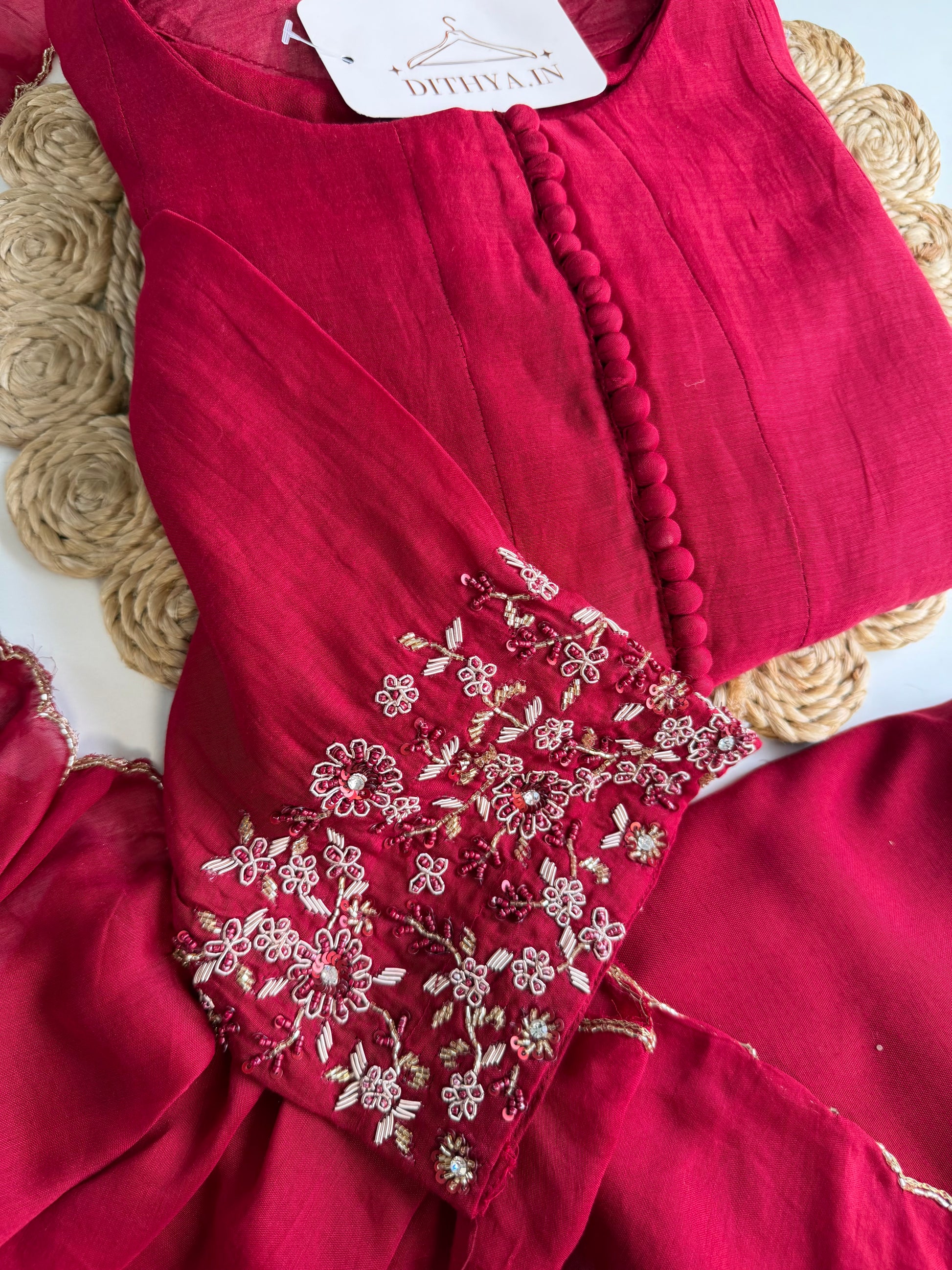 Crafted with exquisite handwork on luxurious mul chanderi fabric, this Anarkali set is a must-have for any special occasion. Complete with coordinated pants and a dupatta, it brings together elegance and comfort. Elevate your style with this stunning ensemble.