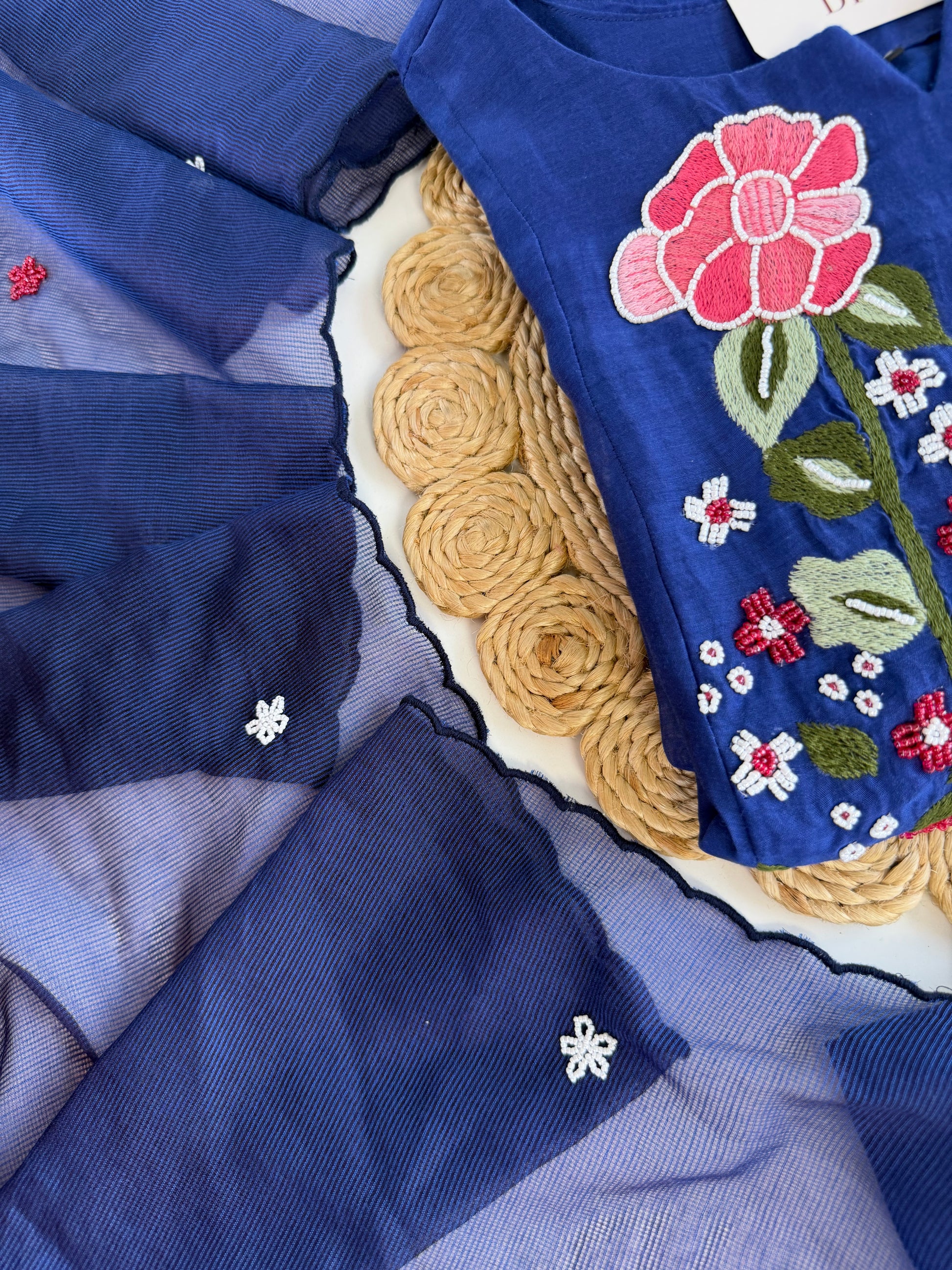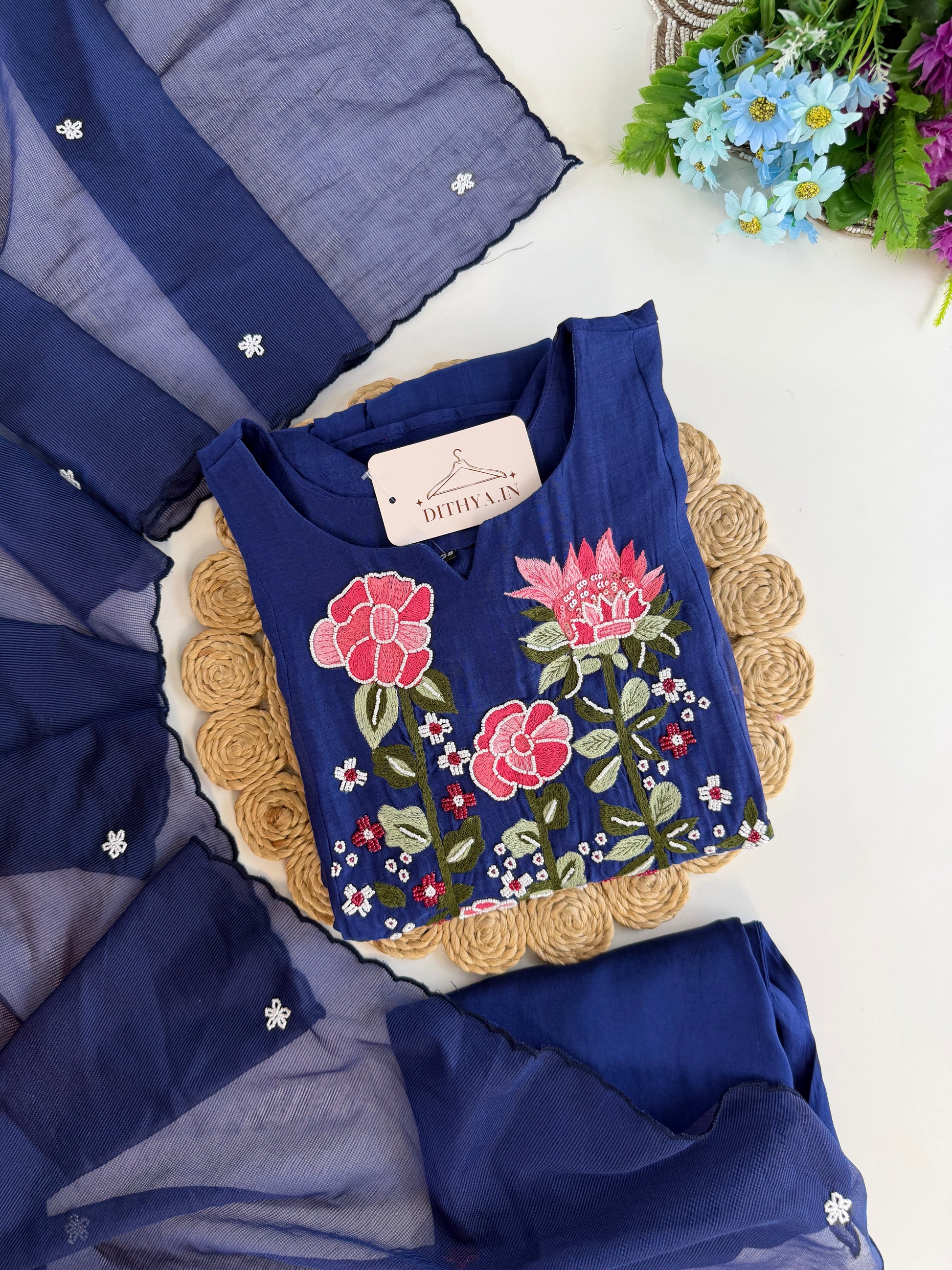 Experience the exquisite craftsmanship of our Mul Chanderi handwork Anarkali set. Made with premium quality fabric, this set features intricate handwork and comes with a pair of comfortable pants and a dupatta. Elevate your traditional look with this stunning and timeless piece.