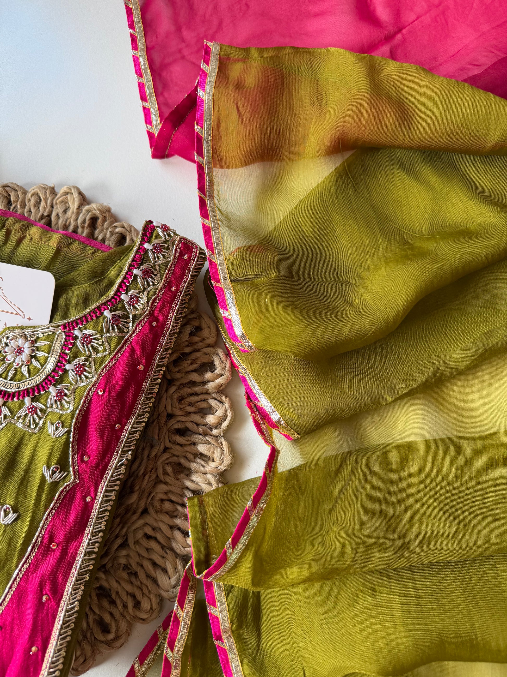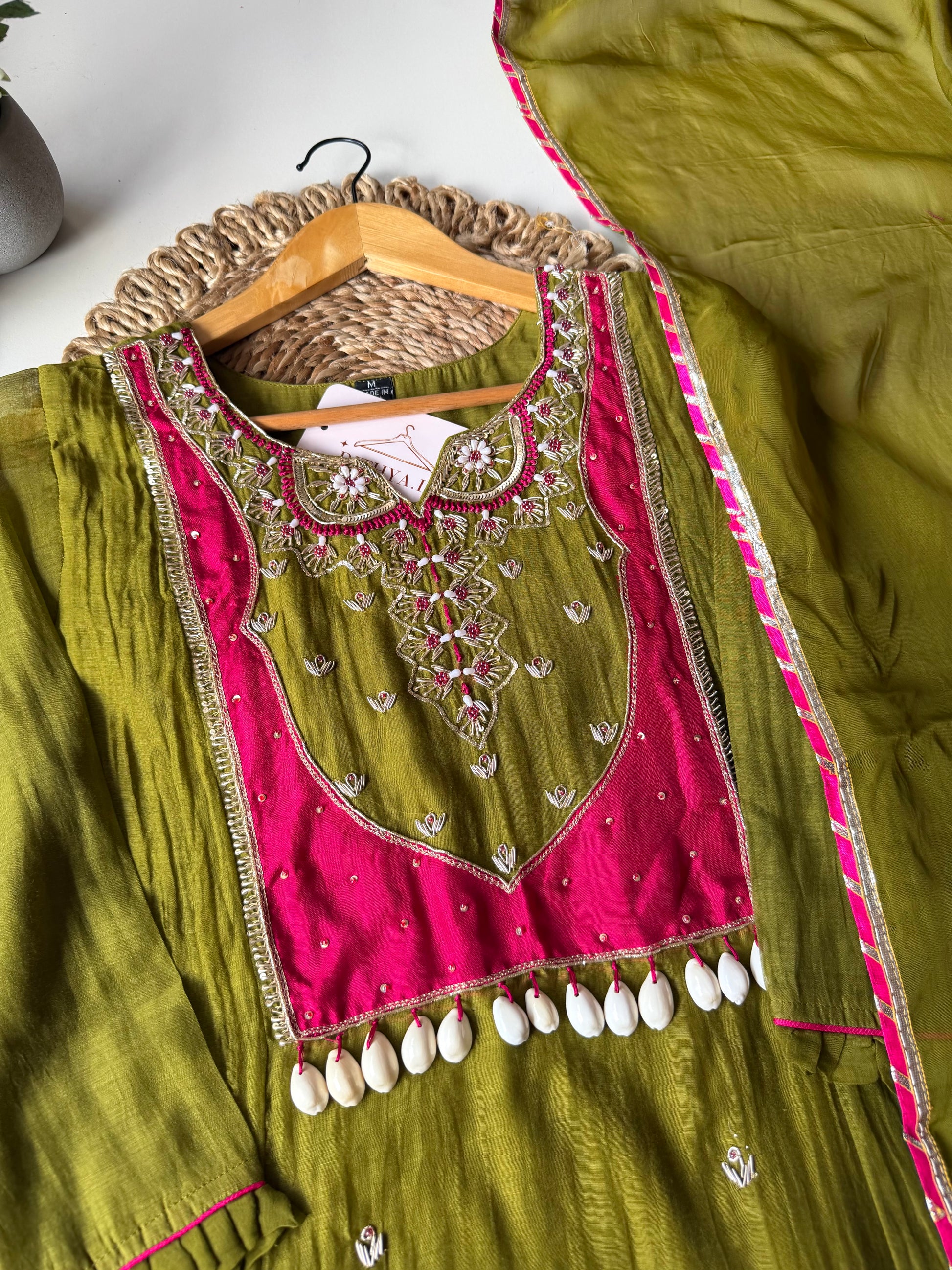 Expertly crafted from Mul chanderi fabric, this Anarkali outfit boasts intricate handwork details that add a touch of elegance. Comes with matching pants and dupatta, making it a complete ensemble for any formal occasion. Elevate your style with this timeless piece.