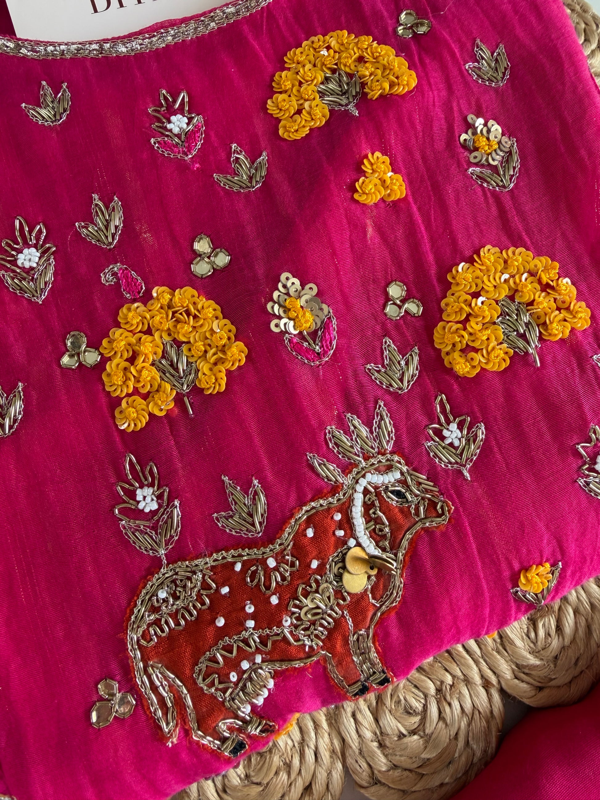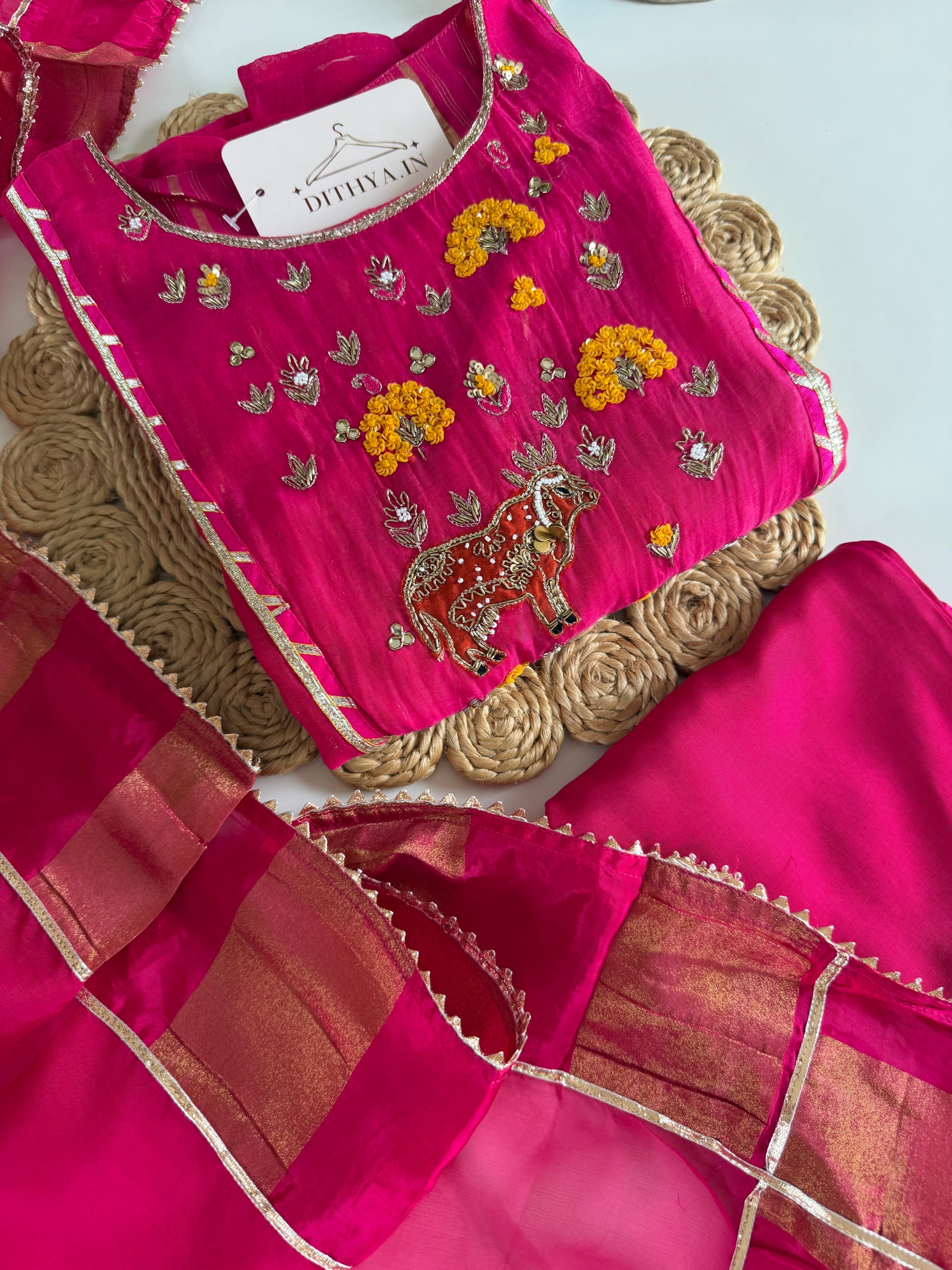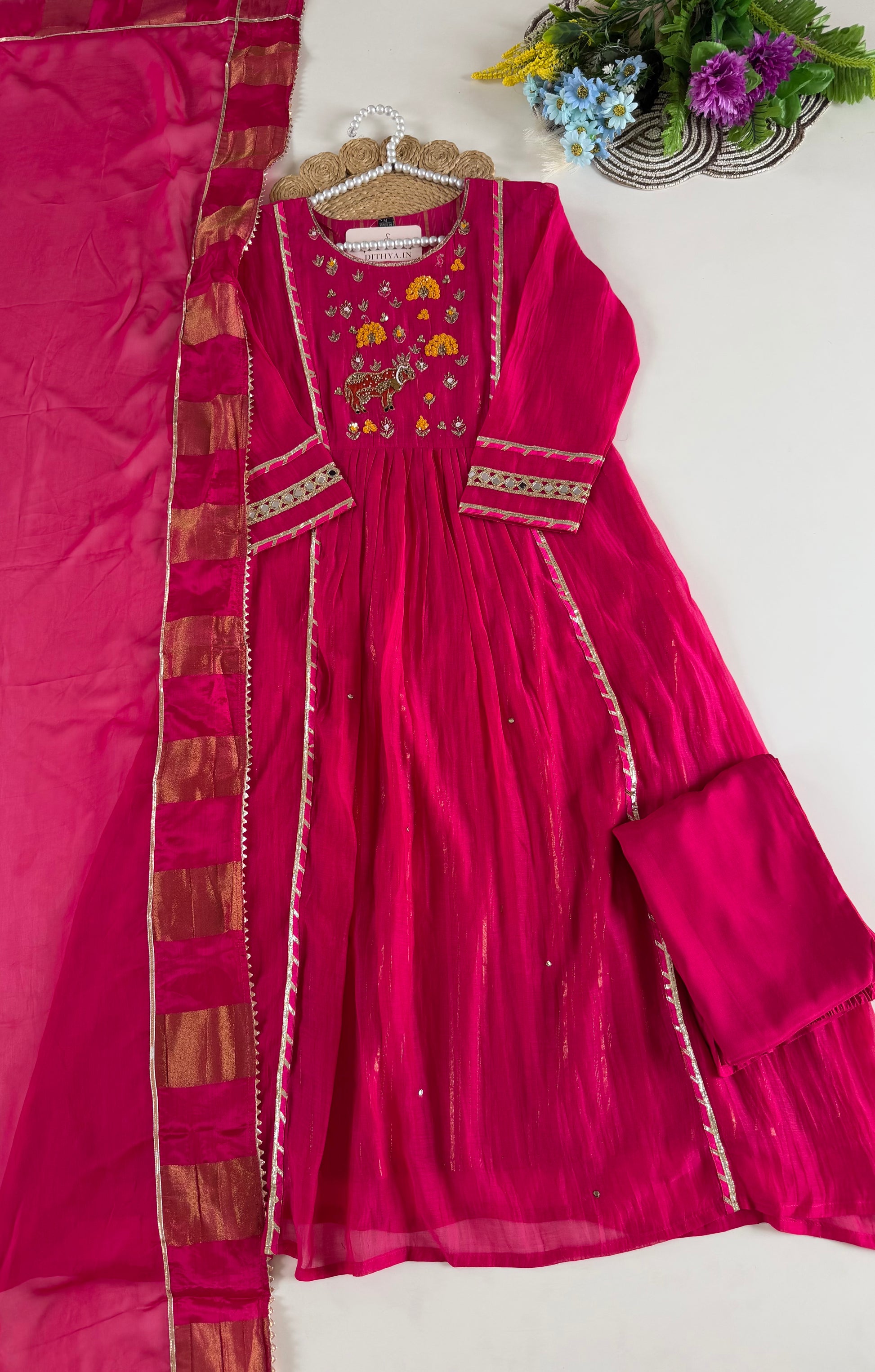 This Mul chanderi handwork Anarkali set includes a matching pair of pants and dupatta, all adorned with intricate handwork. Made from high-quality Mul chanderi fabric, this set offers a luxurious feel and elegant look. Perfect for special occasions, upgrade your wardrobe with this timeless piece.