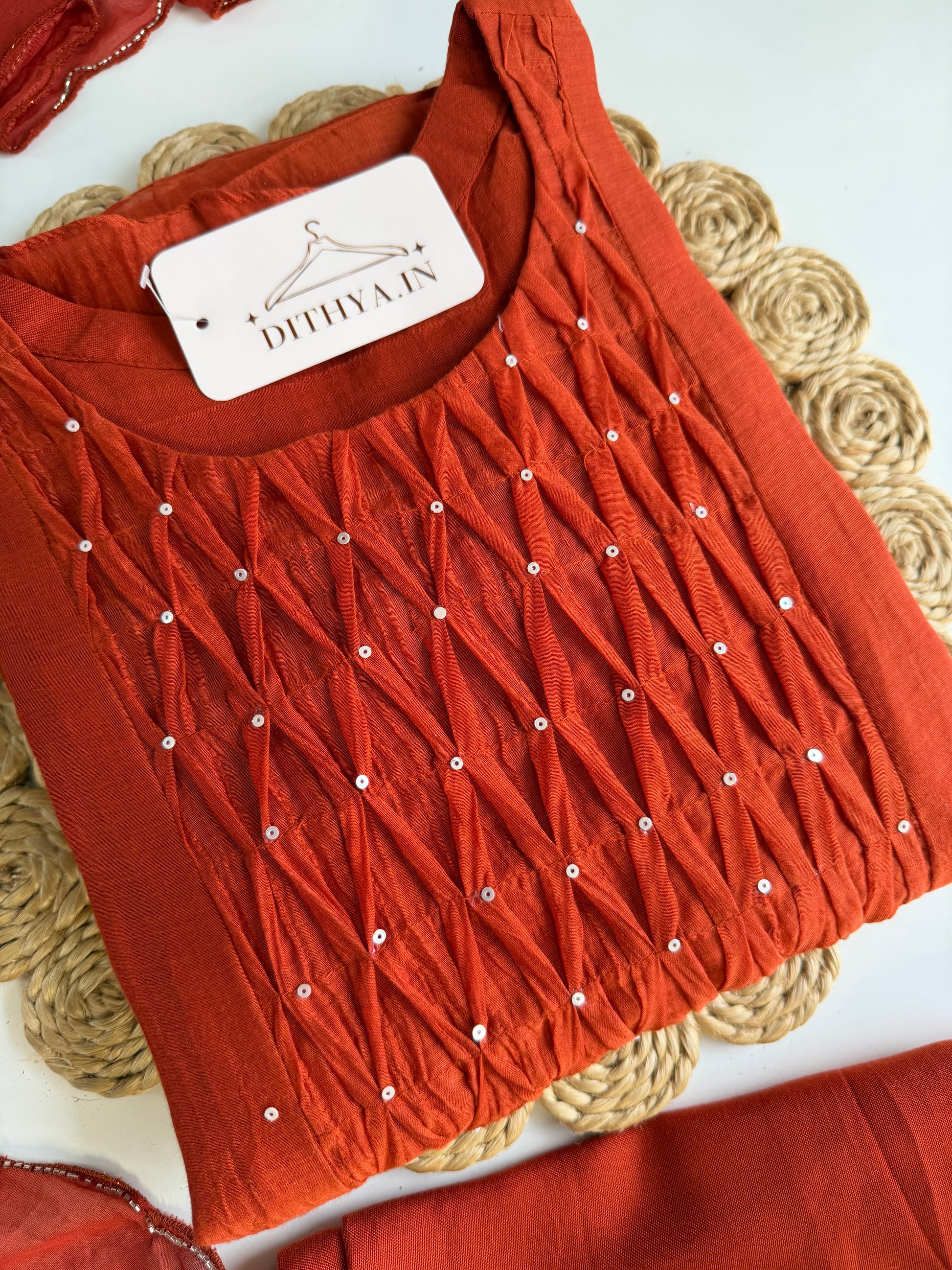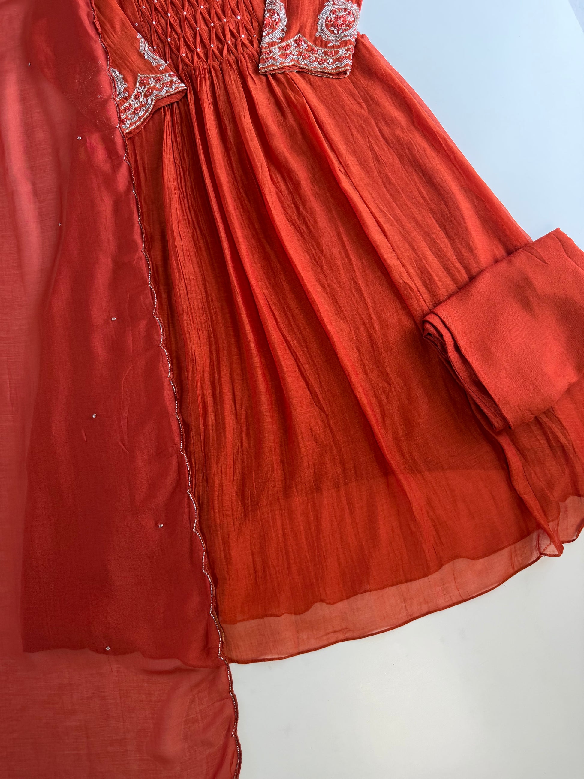 Crafted from the finest Mul Chanderi fabric, this Anarkali suit is adorned with exquisite handwork. The set comes with a stylish pair of pants and a dupatta, completing the elegant look. Perfect for any occasion, this outfit offers the perfect blend of tradition and modernity.