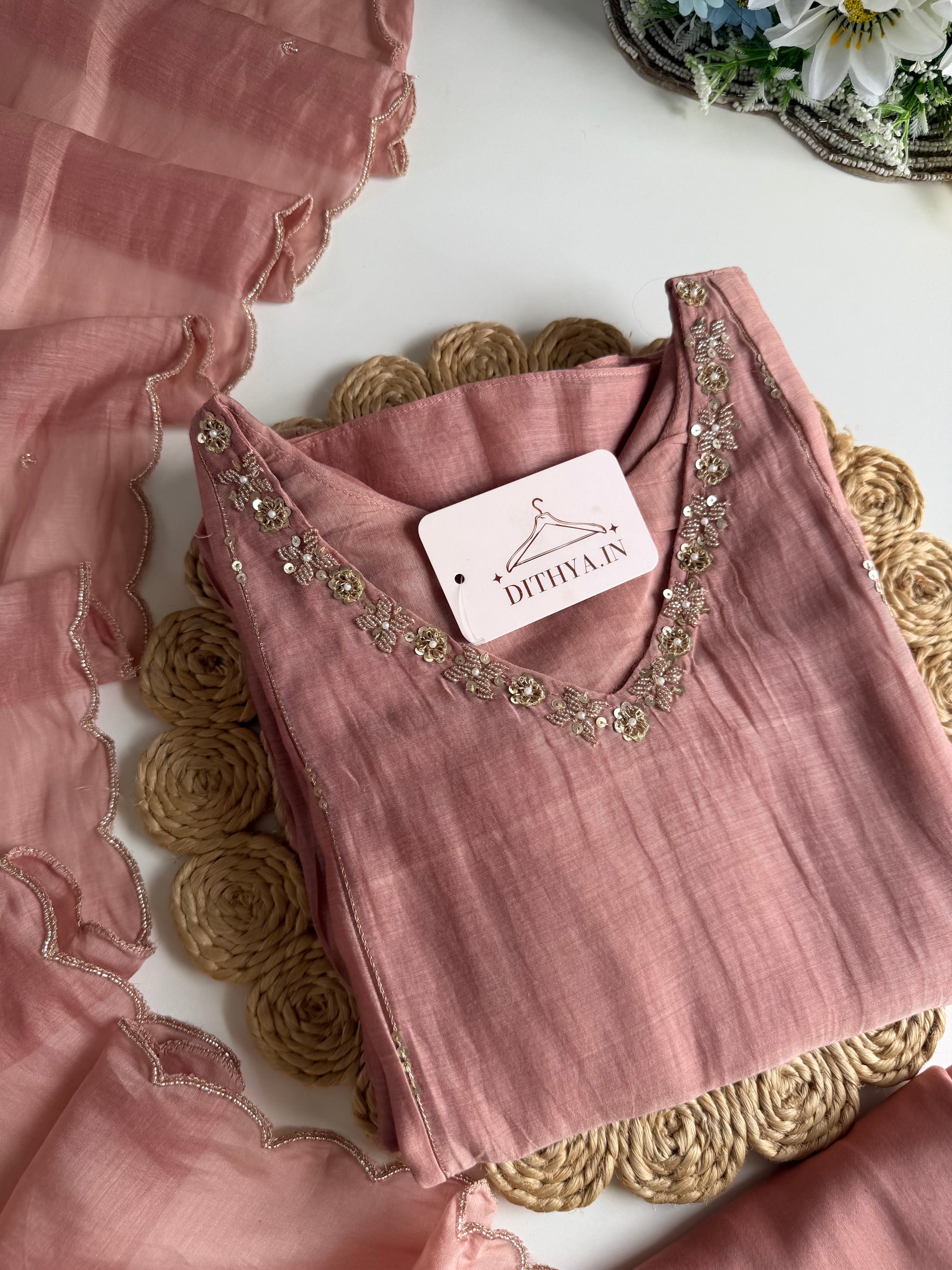 Expertly crafted from luxurious Mul Chanderi with intricate handwork, this elegant 3-piece Anarkali set features a flattering silhouette and comes complete with pants and a dupatta. Add a touch of luxury to your wardrobe with this versatile ensemble.