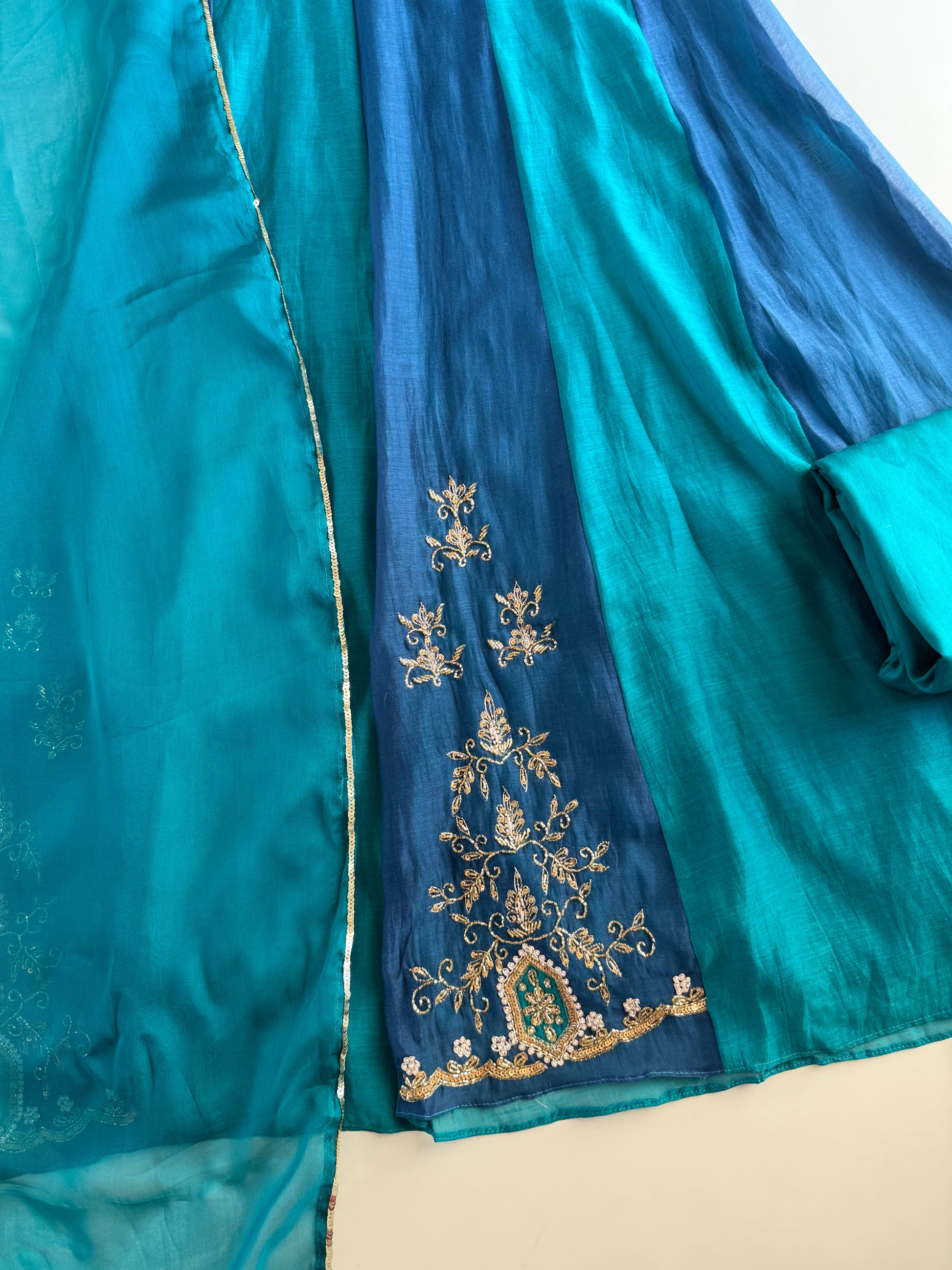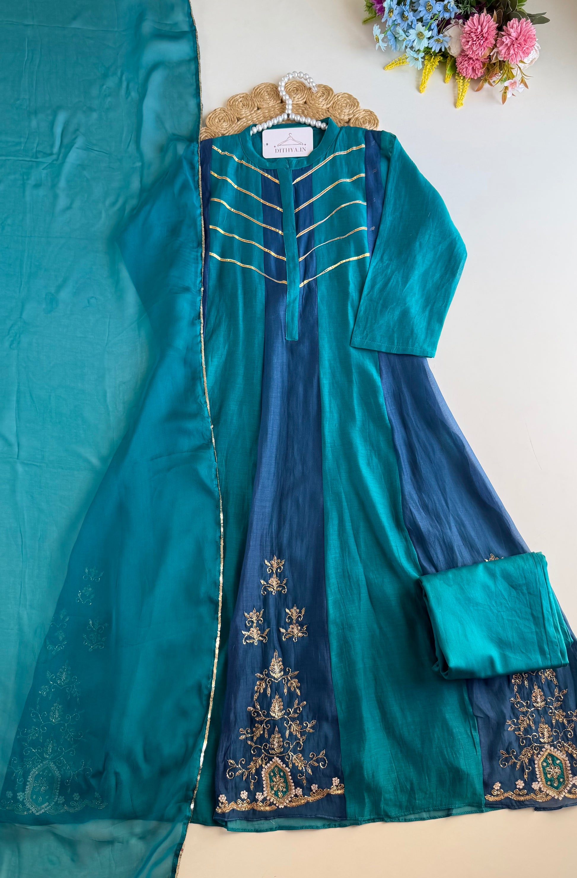 The Mul Chanderi Anarkali set includes an intricately crafted Anarkali dress, tailored pants, and a matching dupatta. The use of Mul Chanderi fabric ensures breathability and comfort, while handwork detailing enhances the garment's elegance. This versatile ensemble is suitable for various formal occasions, offering both style and sophistication.