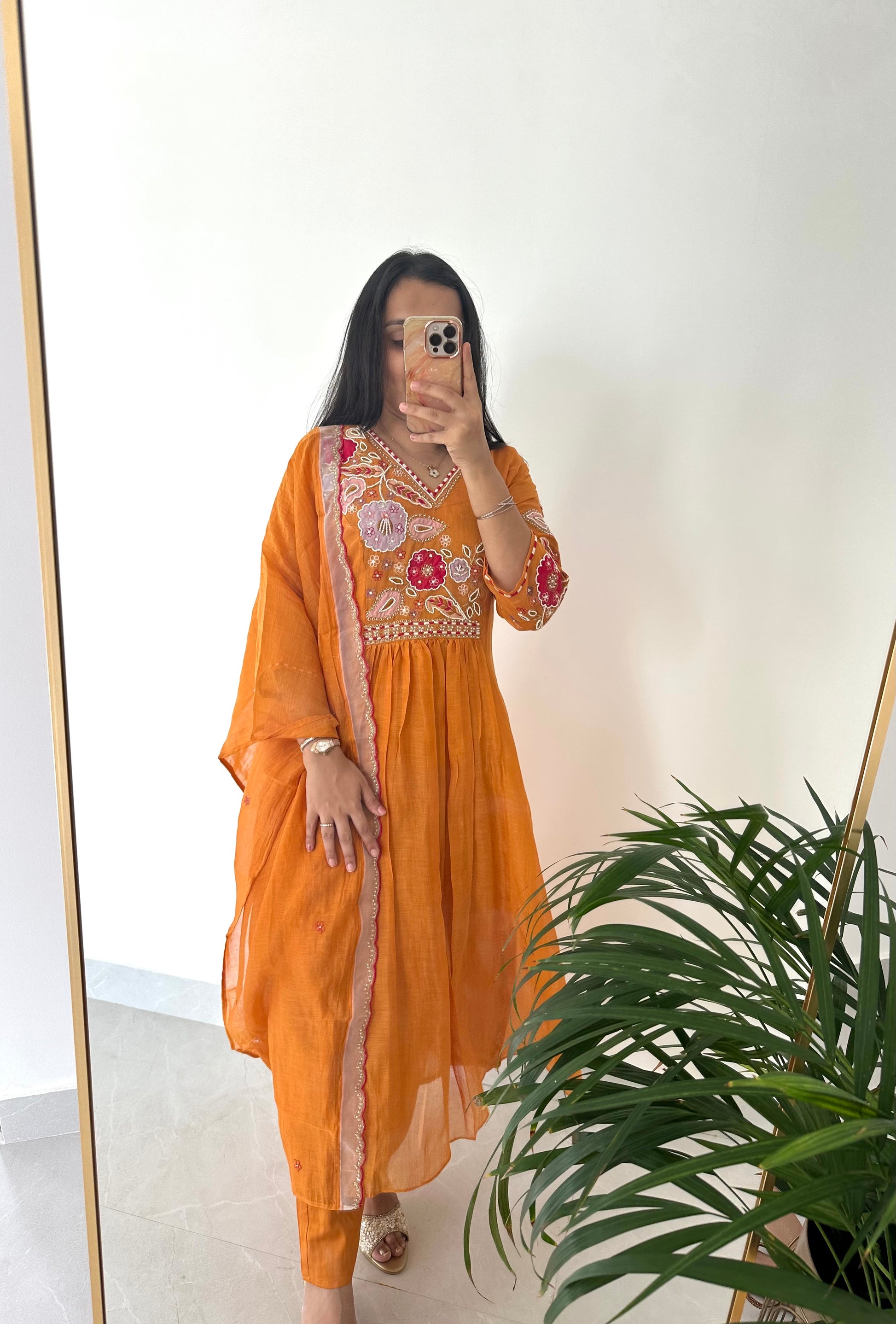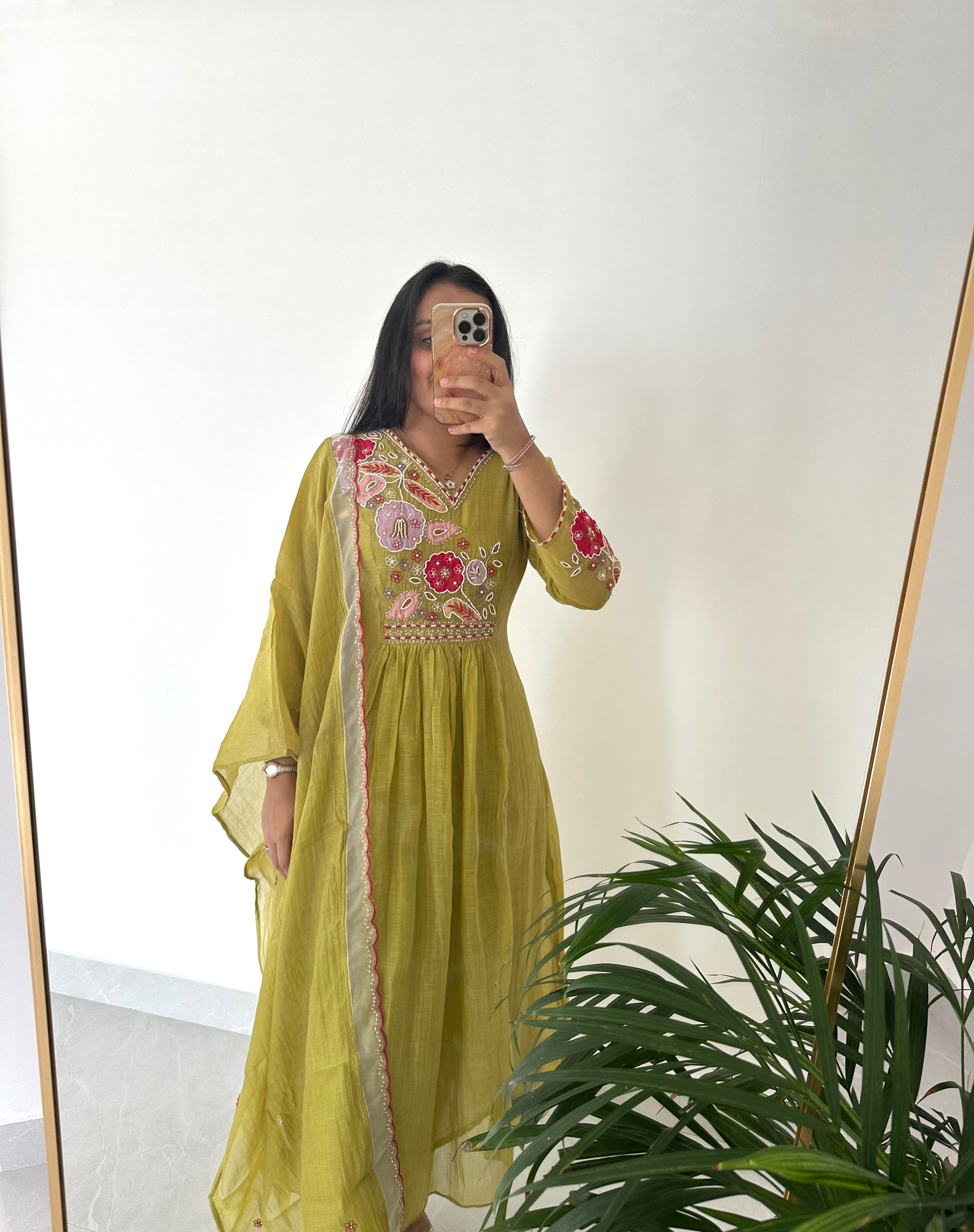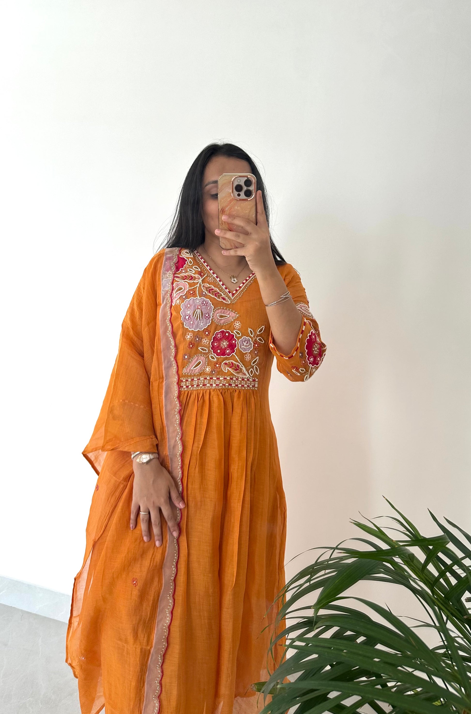 This Mul Chanderi handwork Anarkali comes with both pants and dupatta, making it a versatile and elegant outfit choice. The intricate handiwork on the Mul Chanderi fabric adds a touch of sophistication. Perfect for formal events or special occasions.