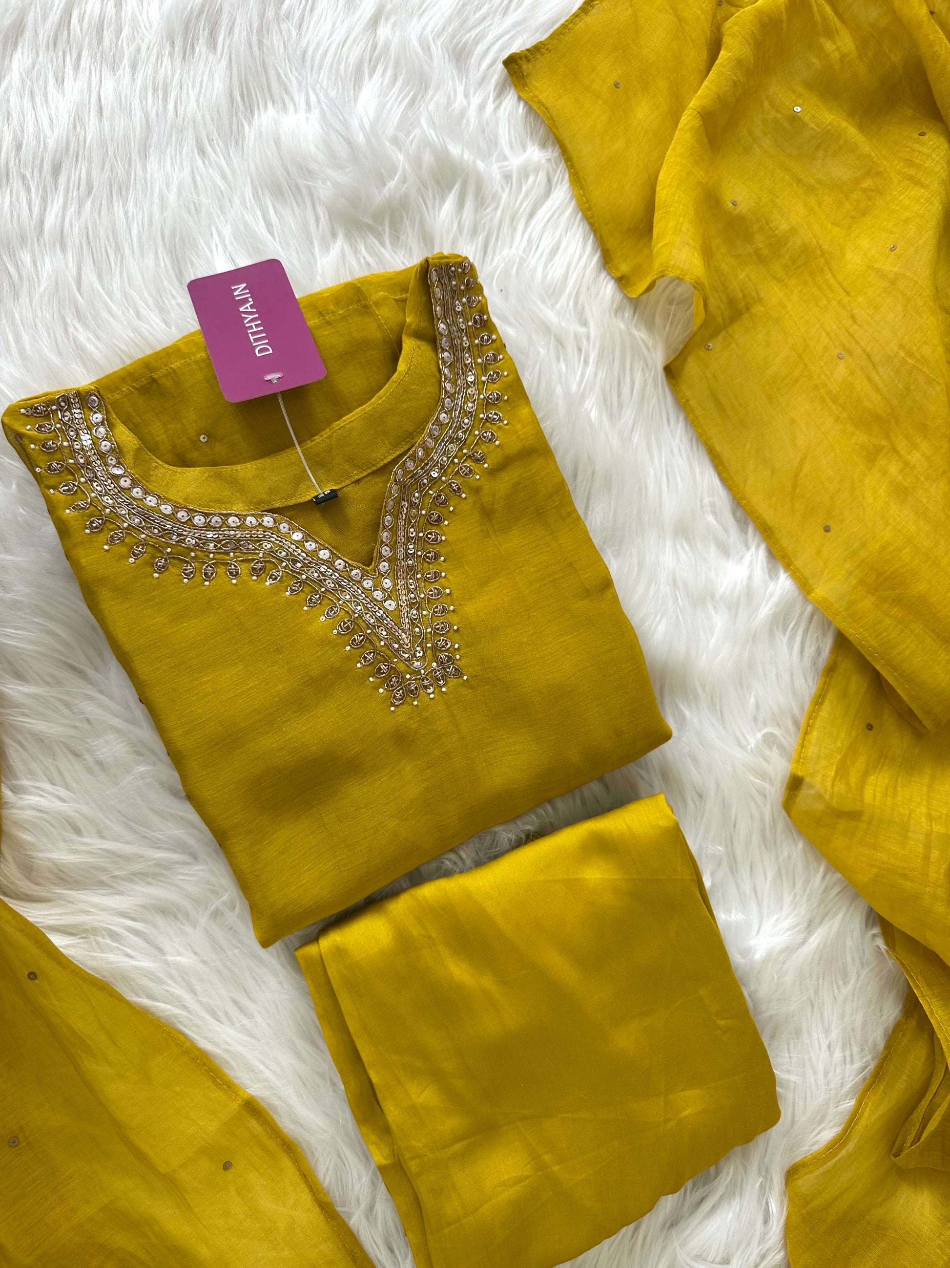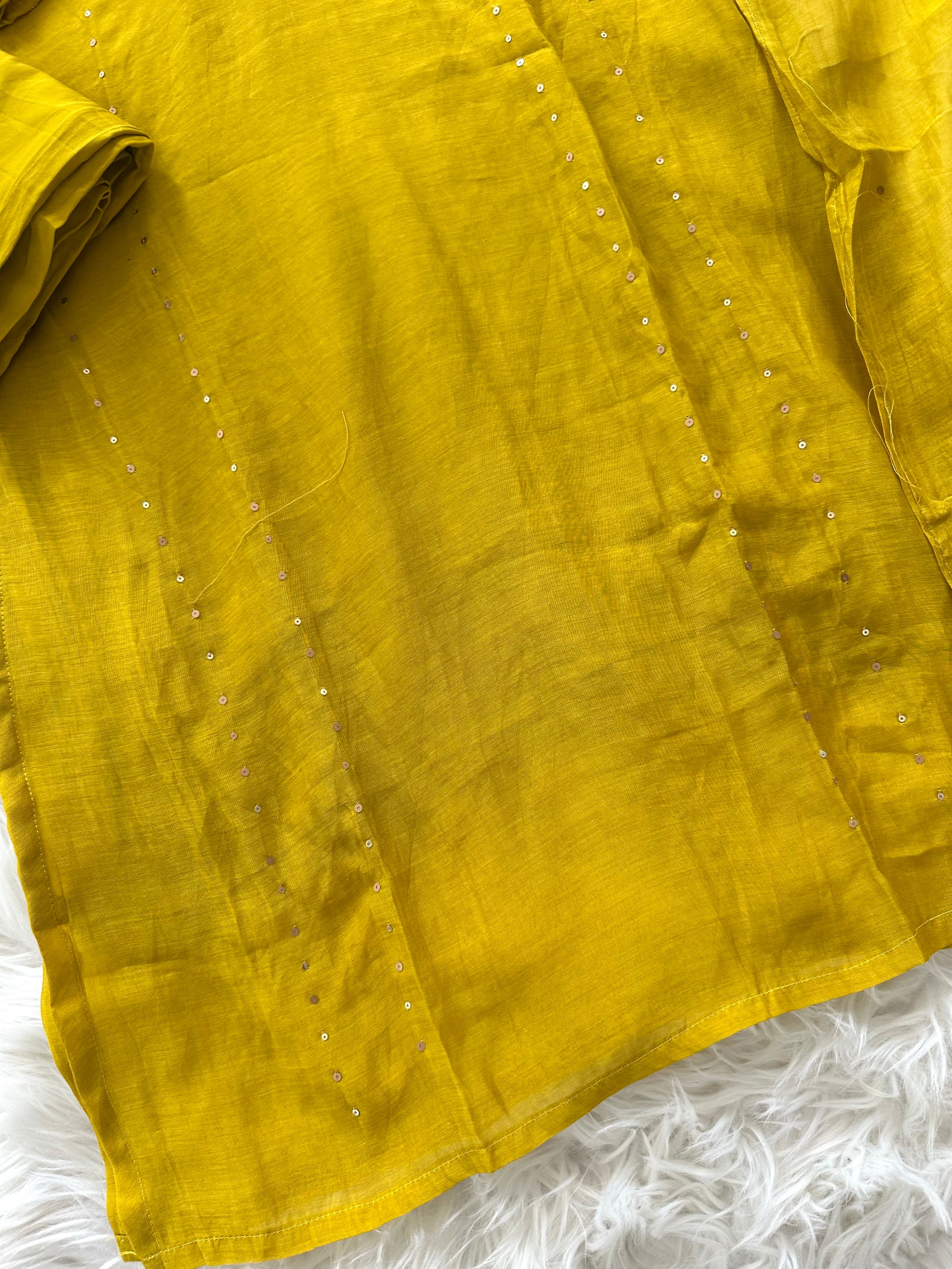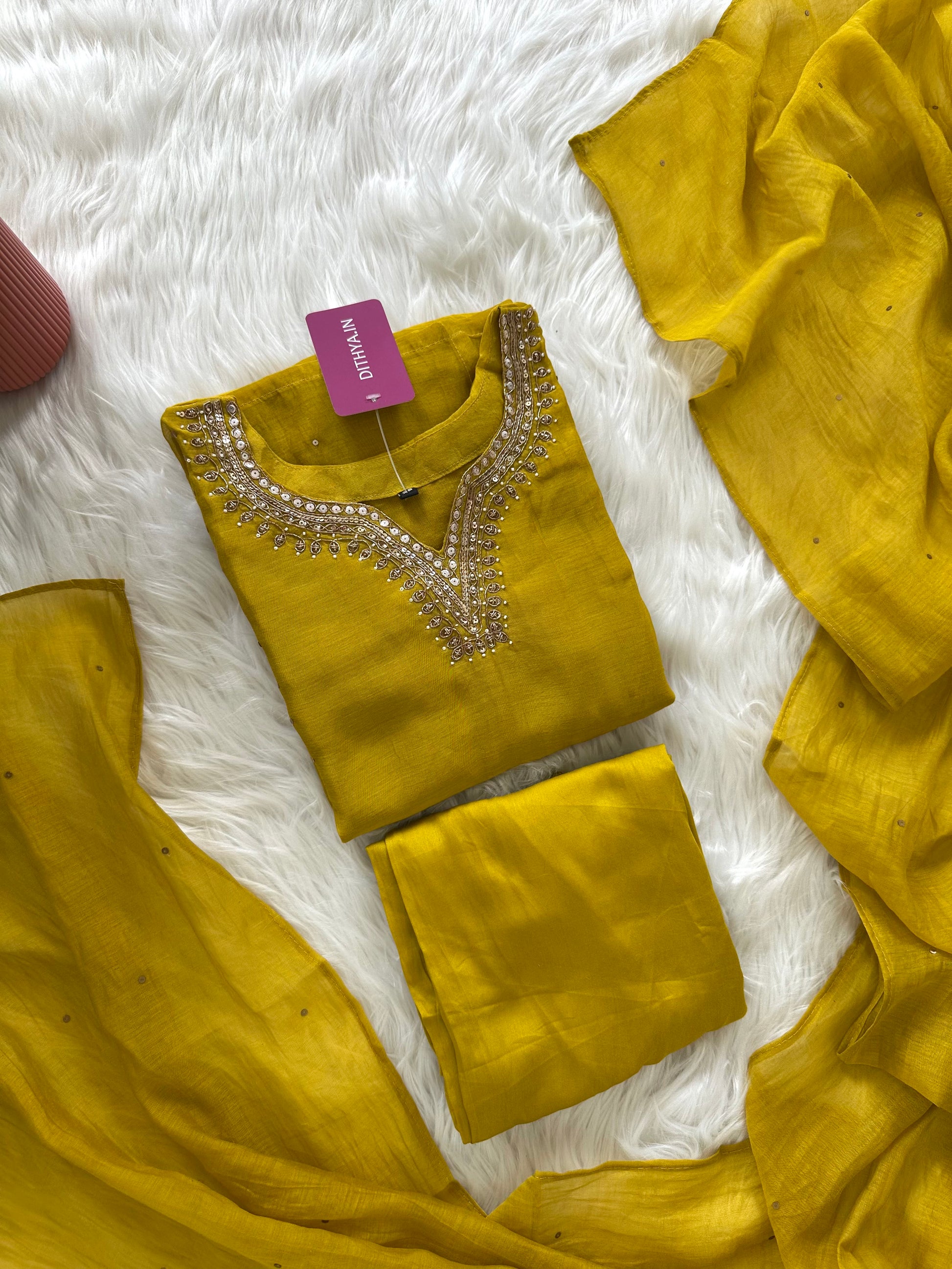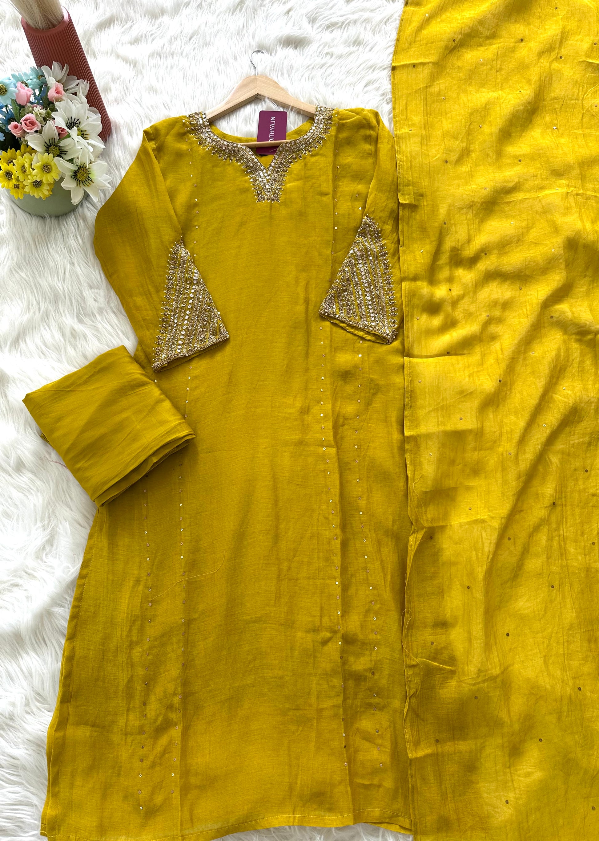 Discover the elegance of Mul Chanderi handwork with our straight kurti, complete with matching pants and dupatta. Expertly crafted, this ensemble is a perfect blend of traditional handwork and contemporary design. Elevate your style with this stunning piece.