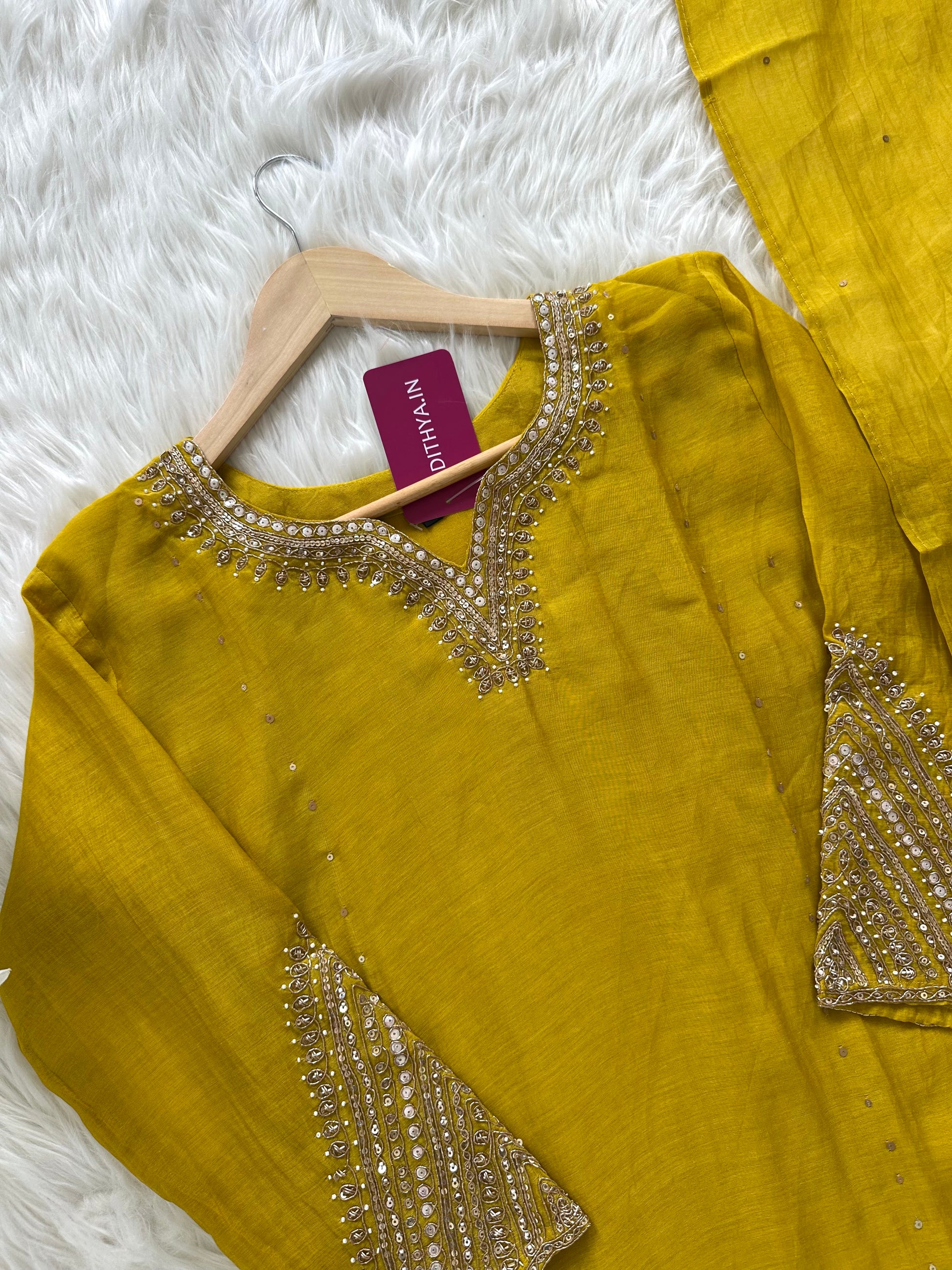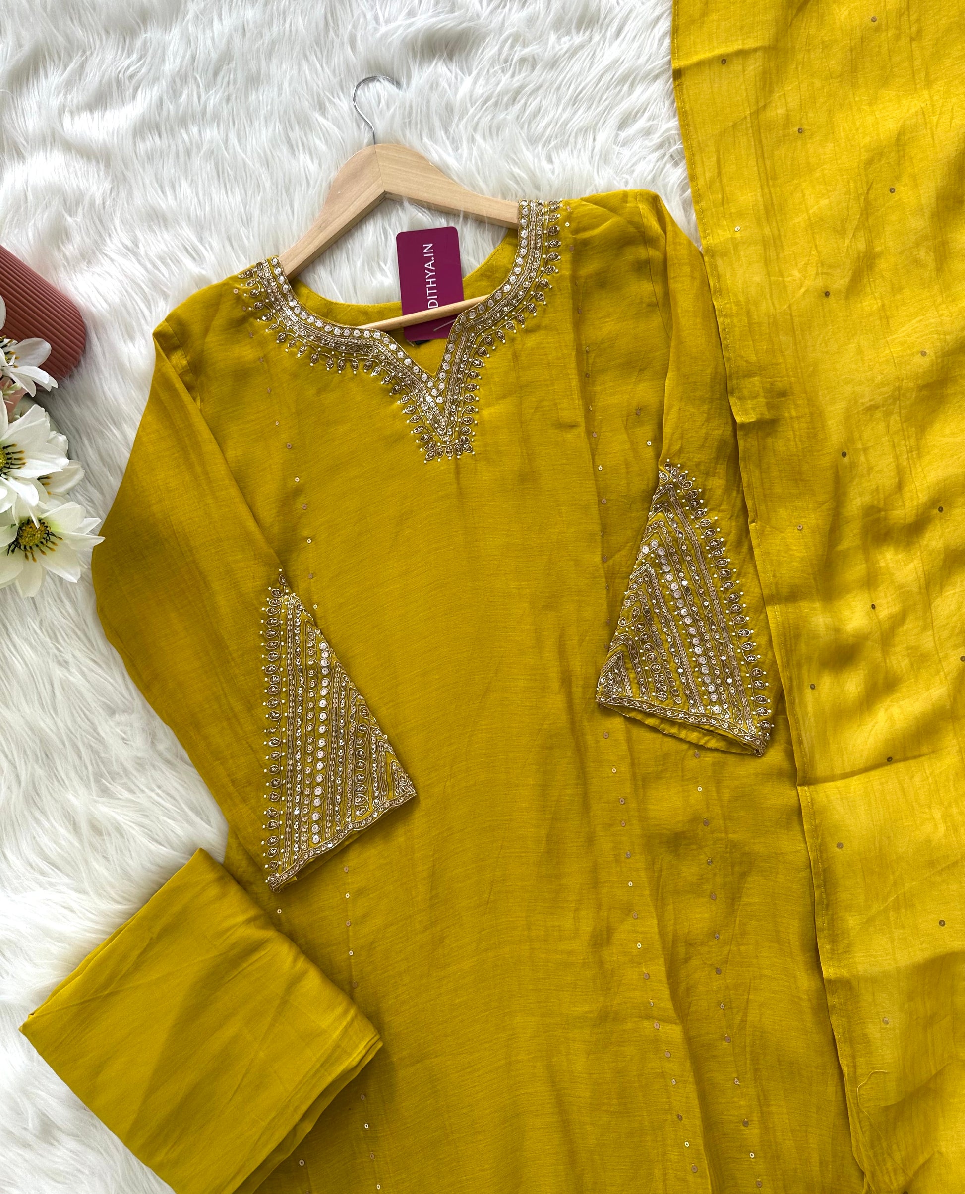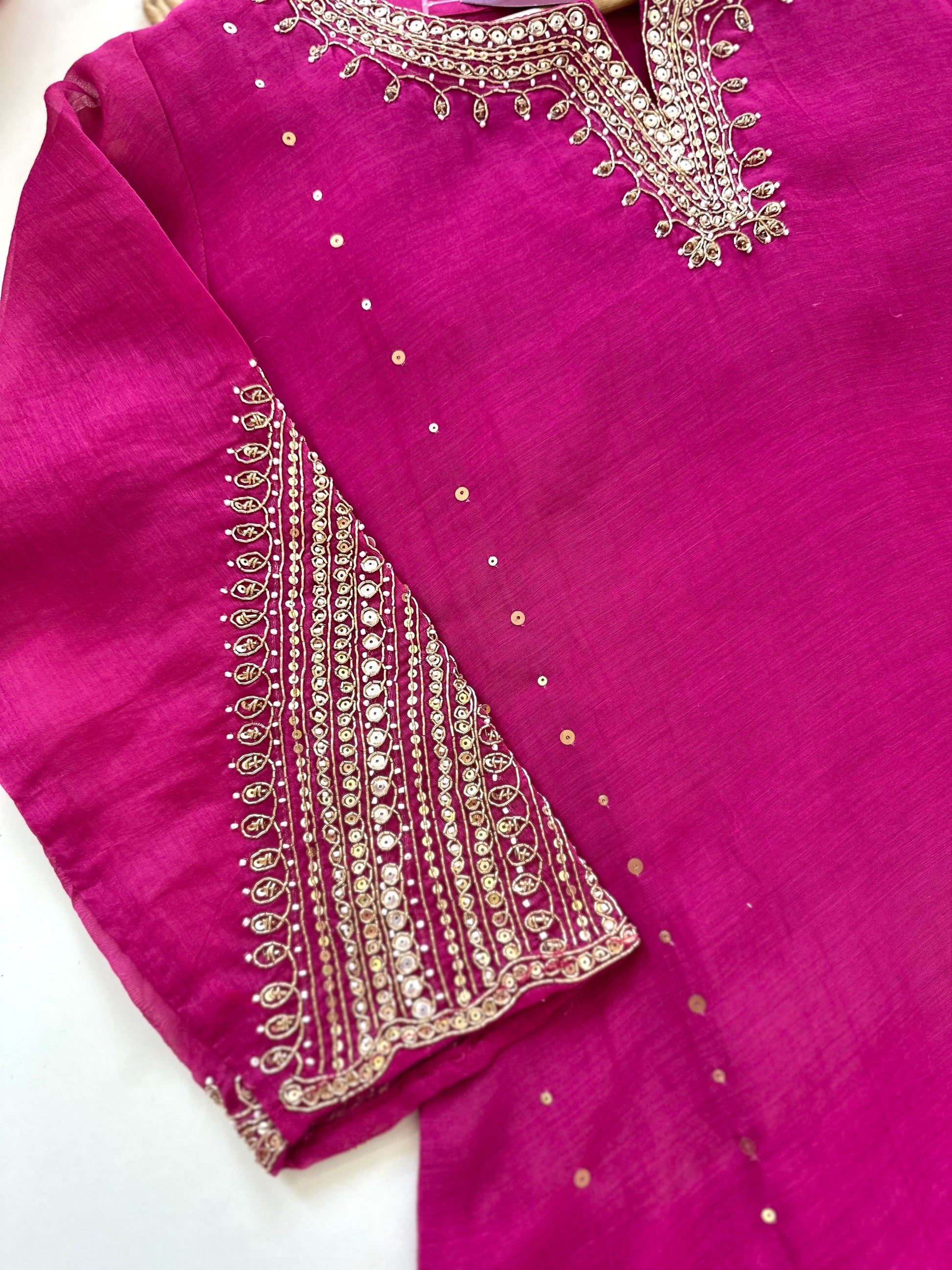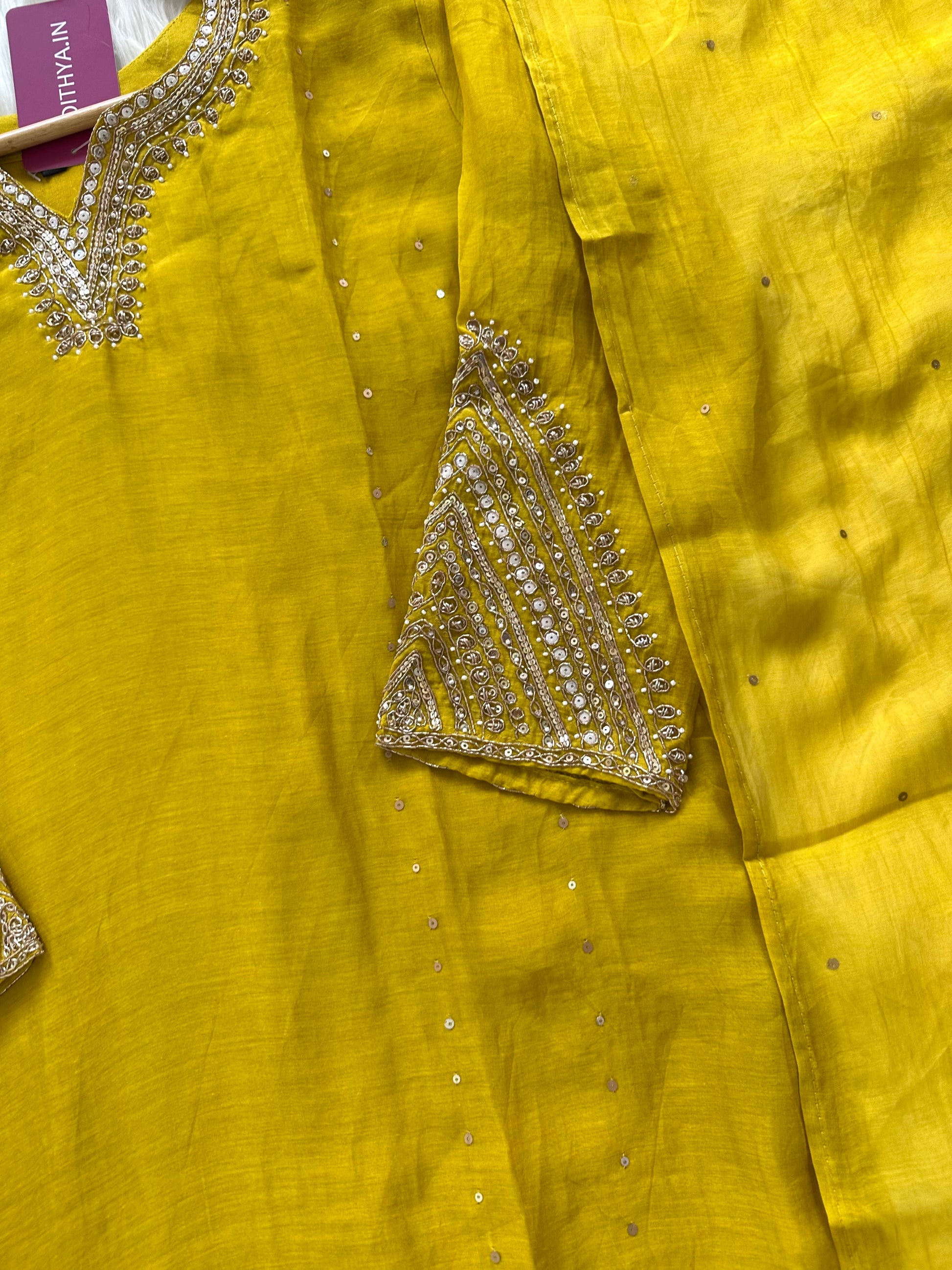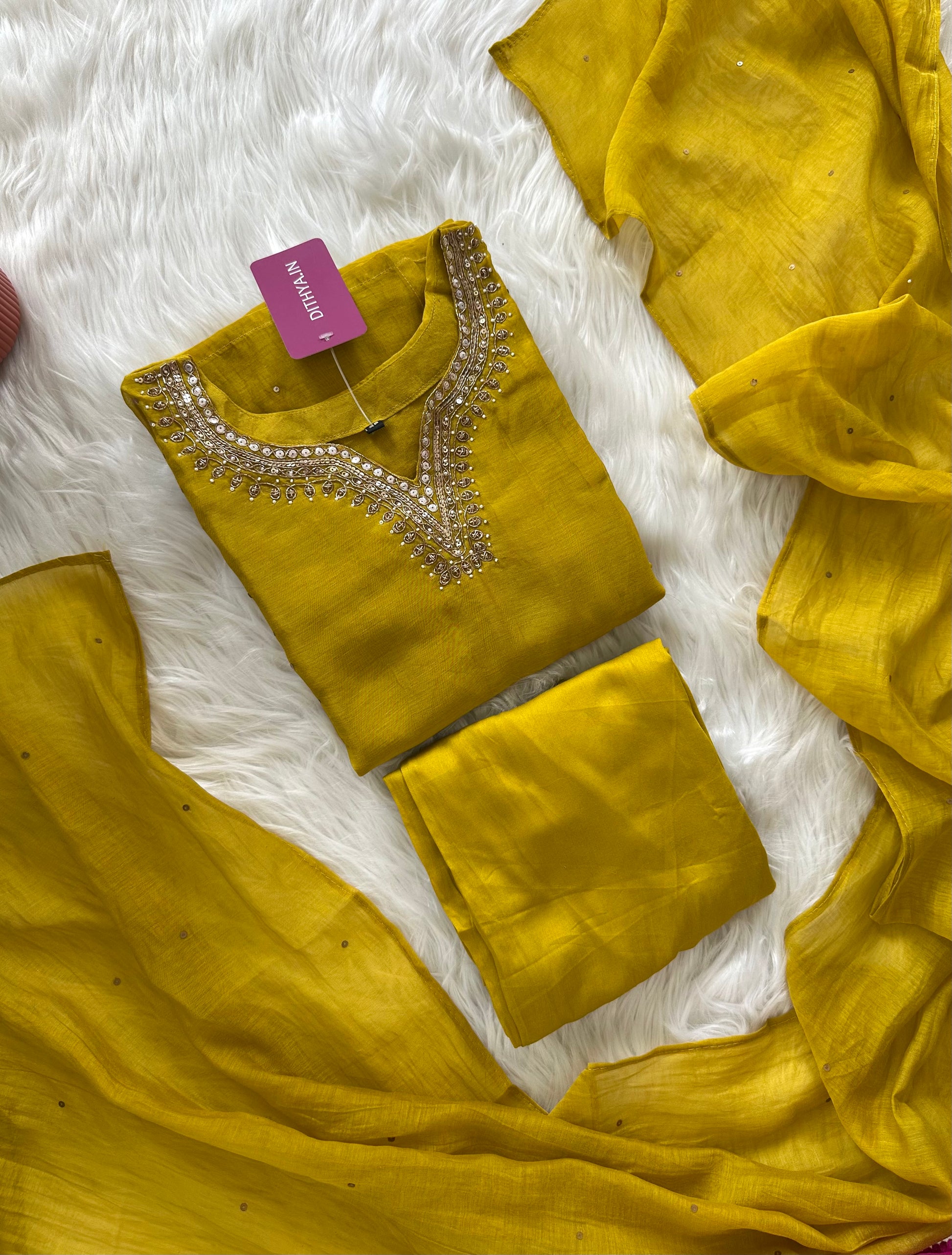 Discover the elegance of Mul Chanderi handwork with our straight kurti, complete with matching pants and dupatta. Expertly crafted, this ensemble is a perfect blend of traditional handwork and contemporary design. Elevate your style with this stunning piece.