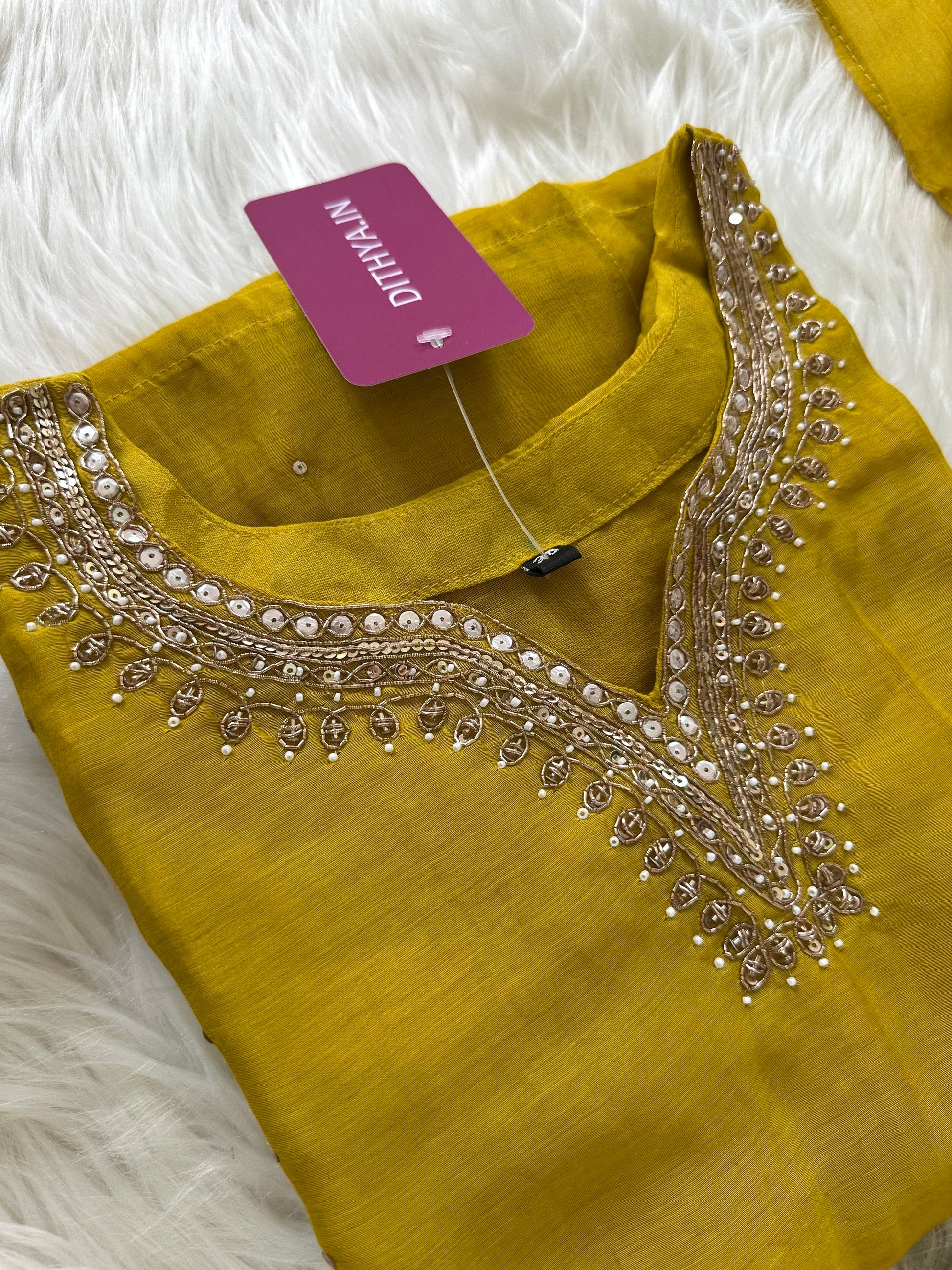 K080 - Mul Chanderi handwork straight kurti with pants and dupatta in 2 colours