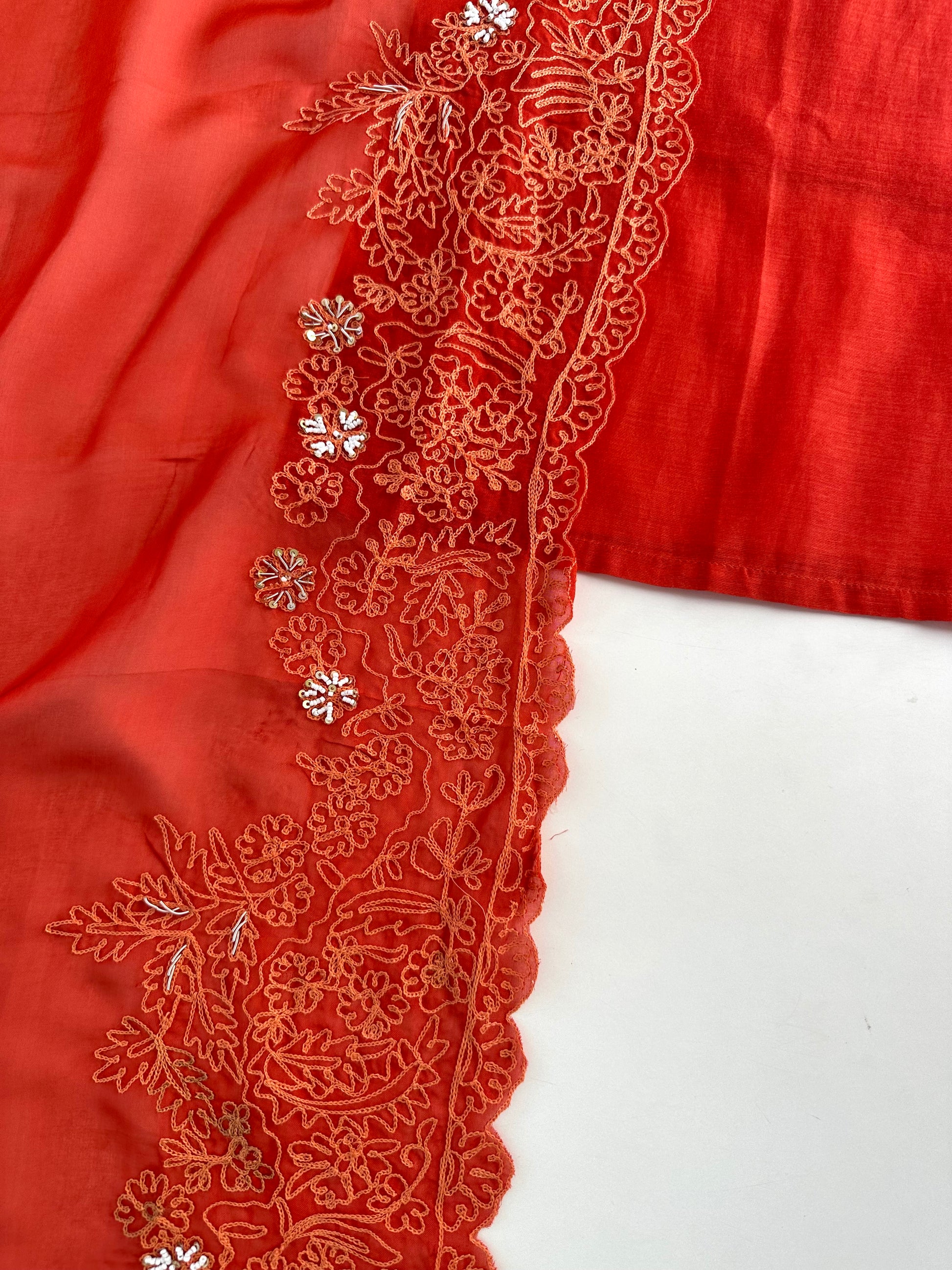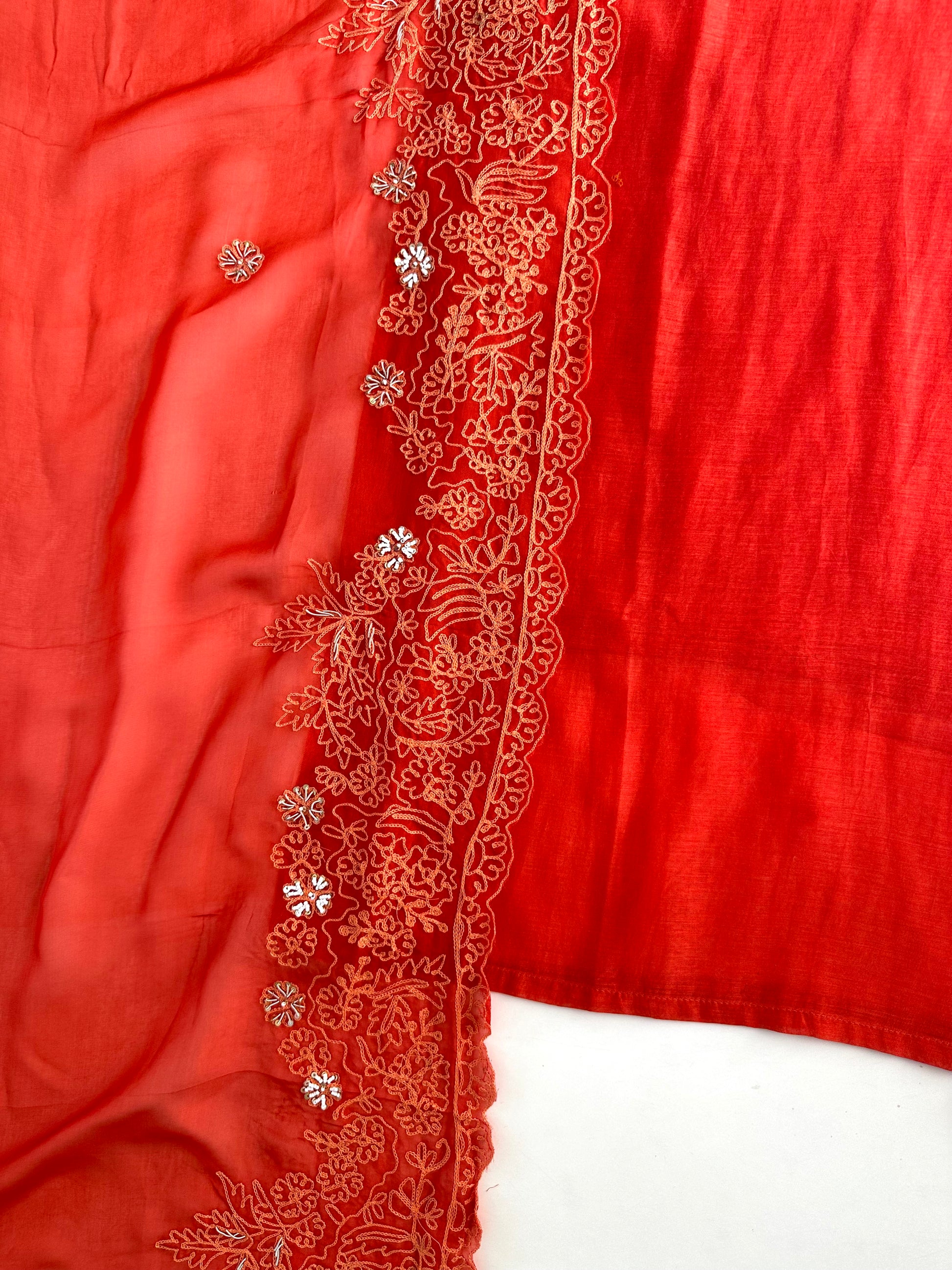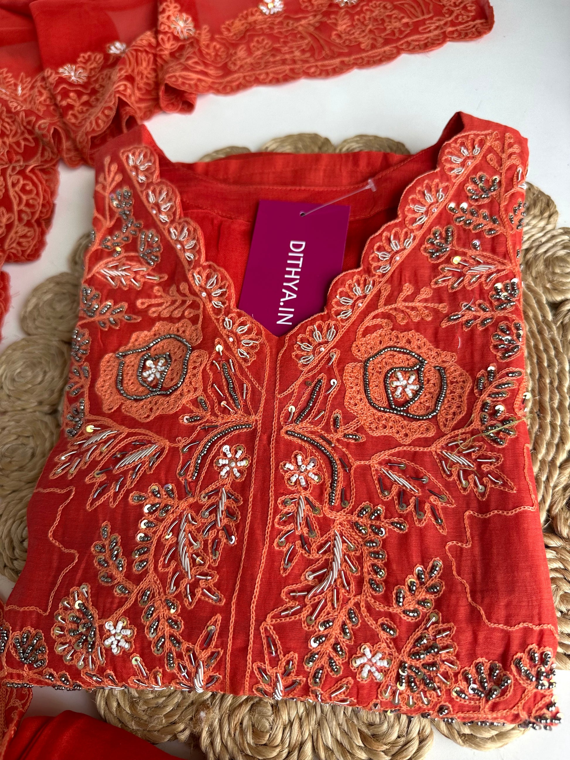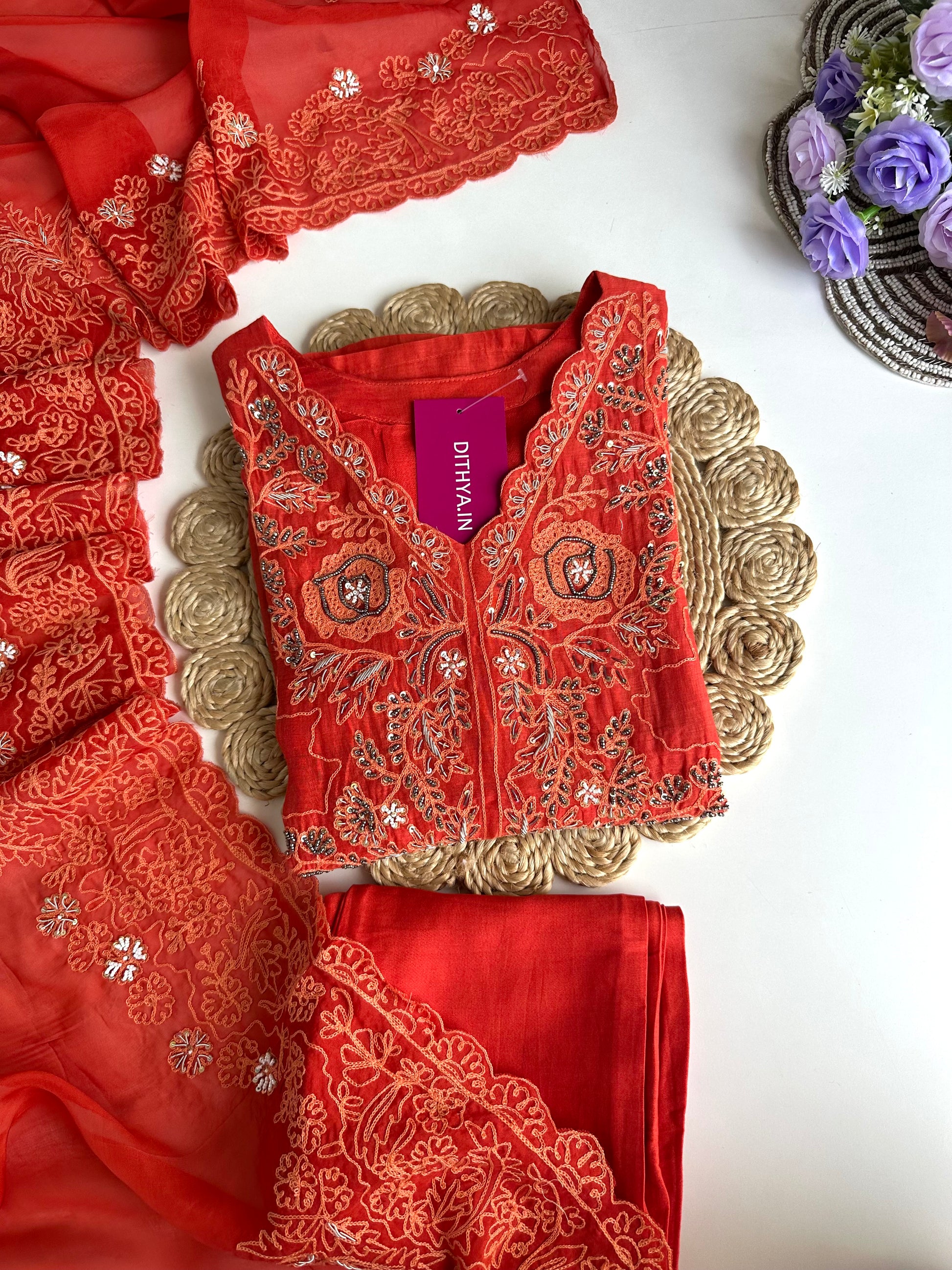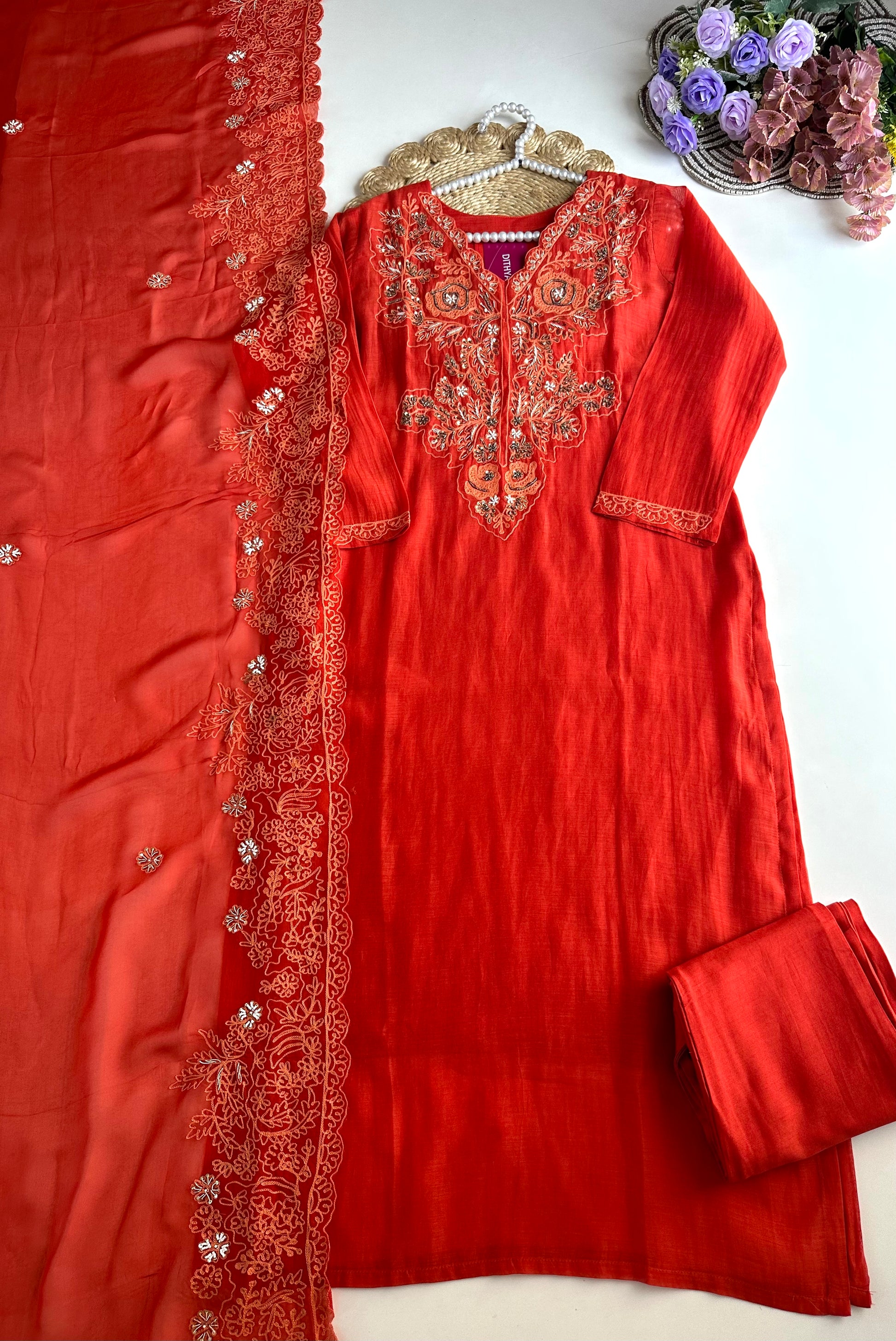 K141 - Mul Chanderi handwork Straight Kurti with pants and dupatta