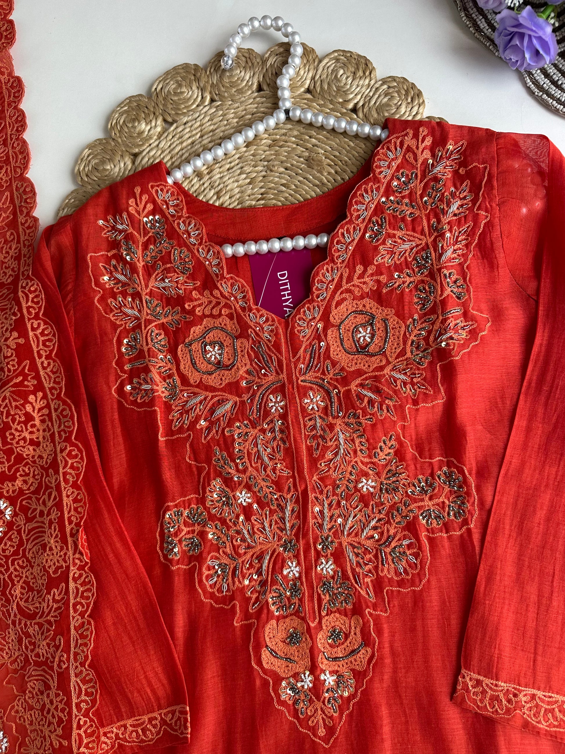 Experience the elegance and intricacy of Mul Chanderi handwork with this Straight Kurti set. Made from premium quality fabric, this set includes pants and a dupatta for a complete look. Perfect for any occasion, this set will add a touch of sophistication to your wardrobe.