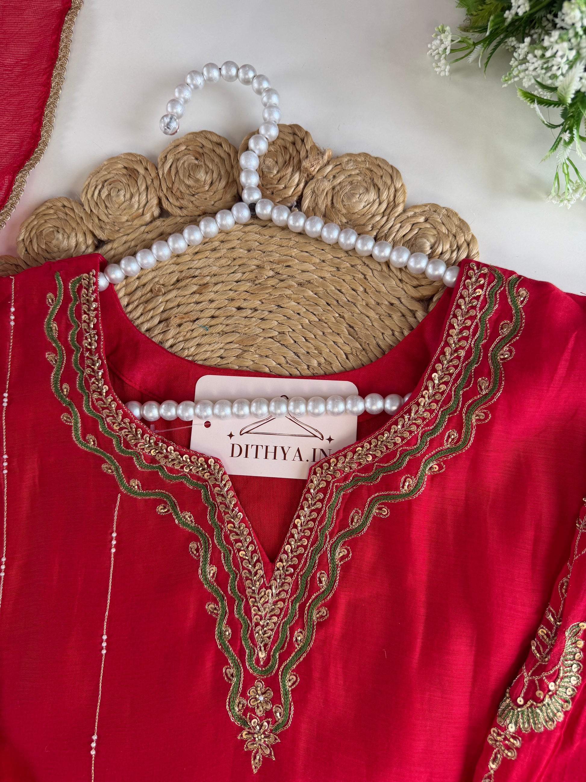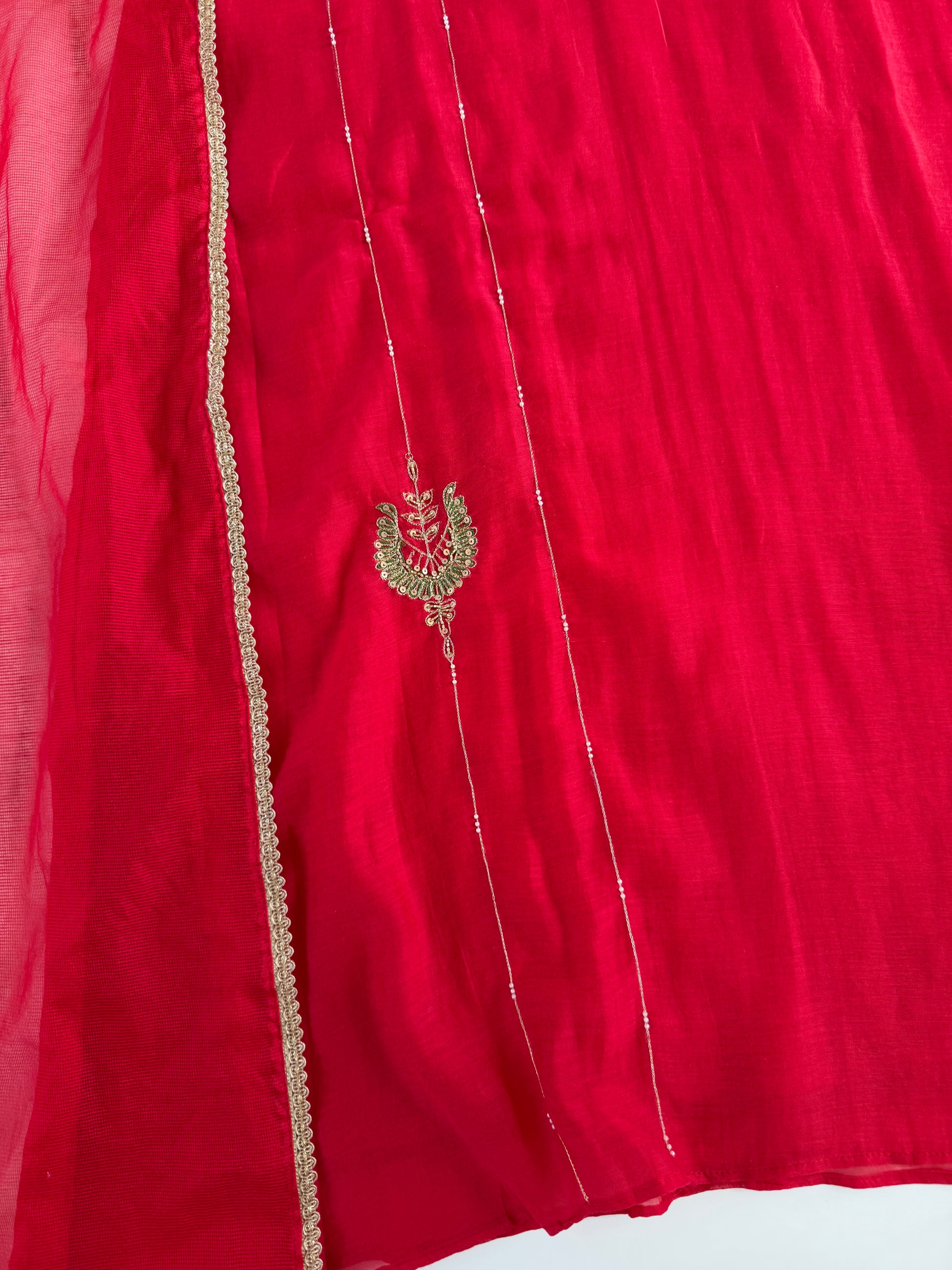 K532 - Mul chanderi Handwork aline Kurti with pants and dupatta