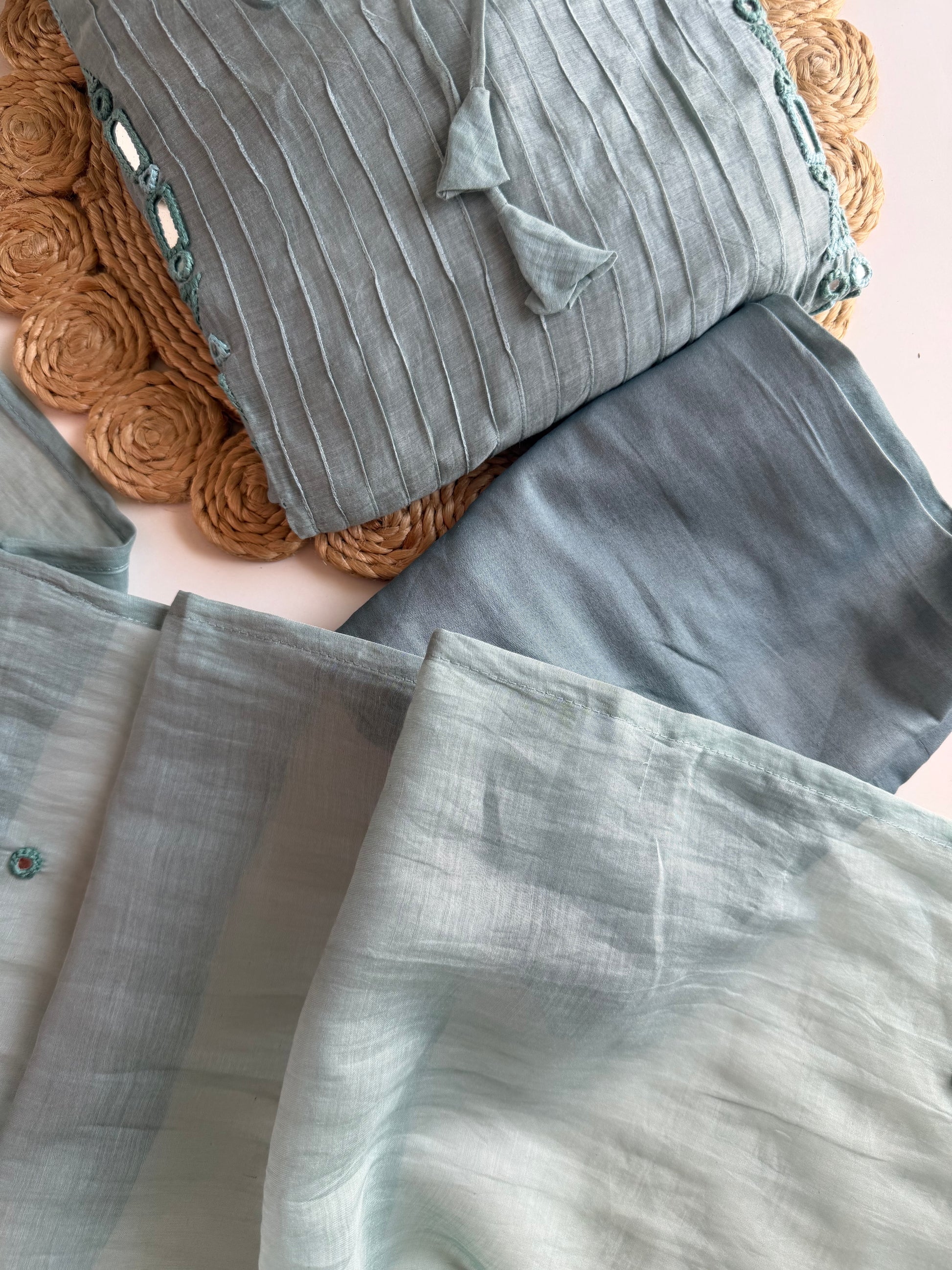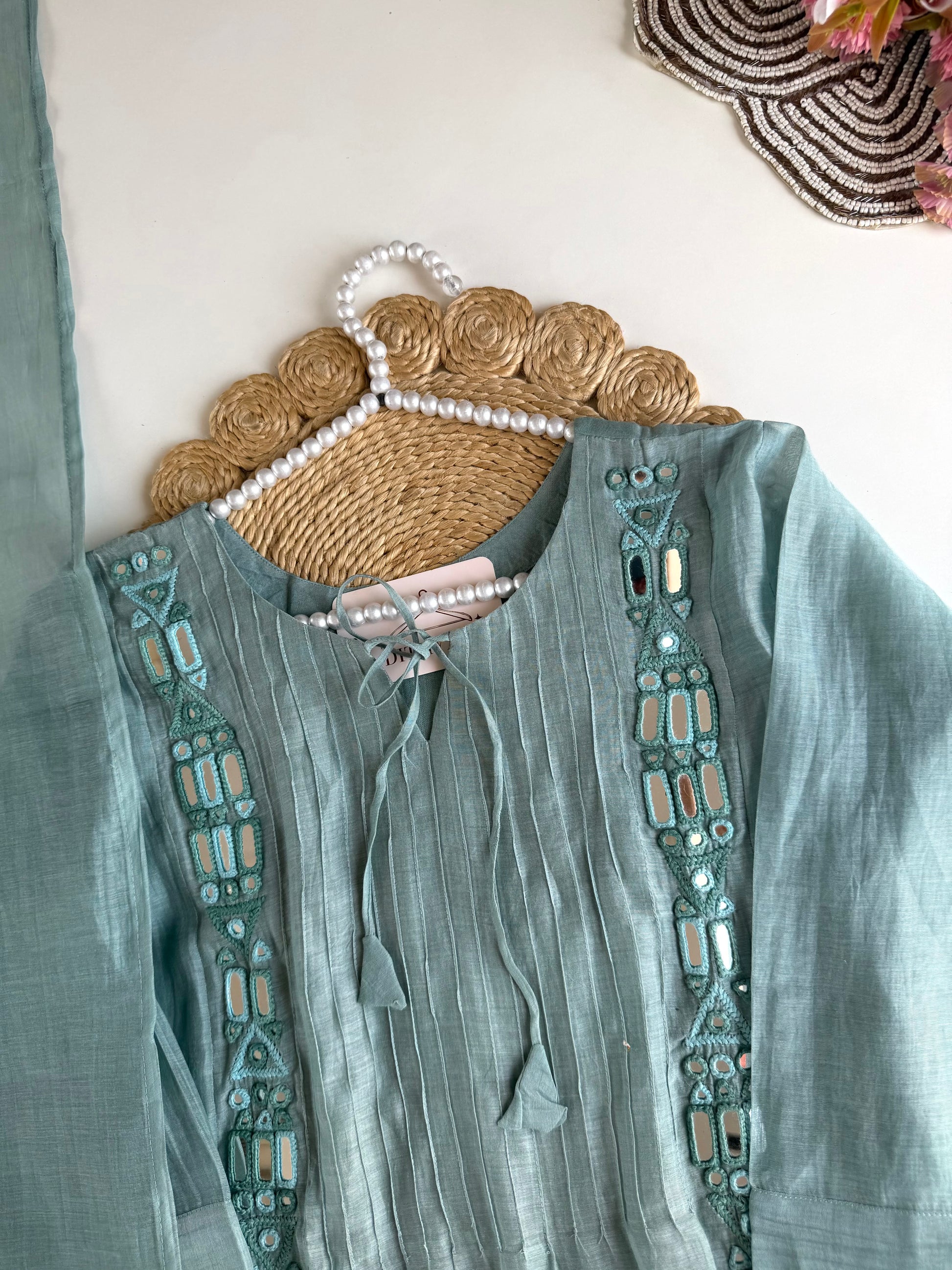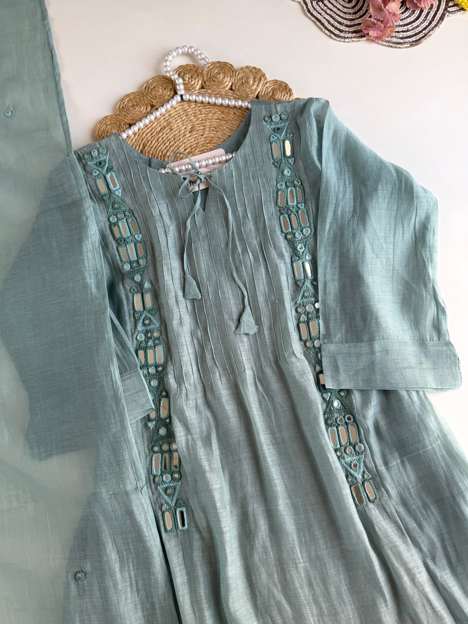 K350 - Mul chanderi mirror embroidered Aline Kurti with pants and dupatta