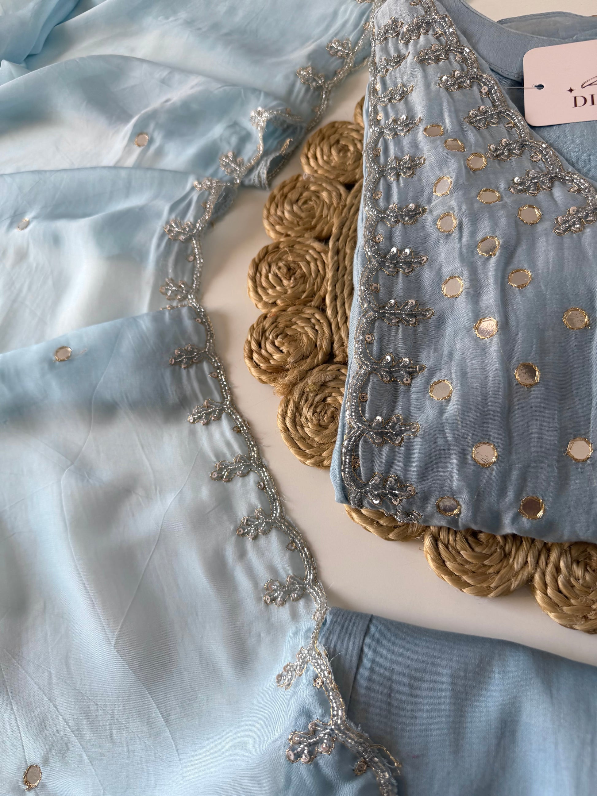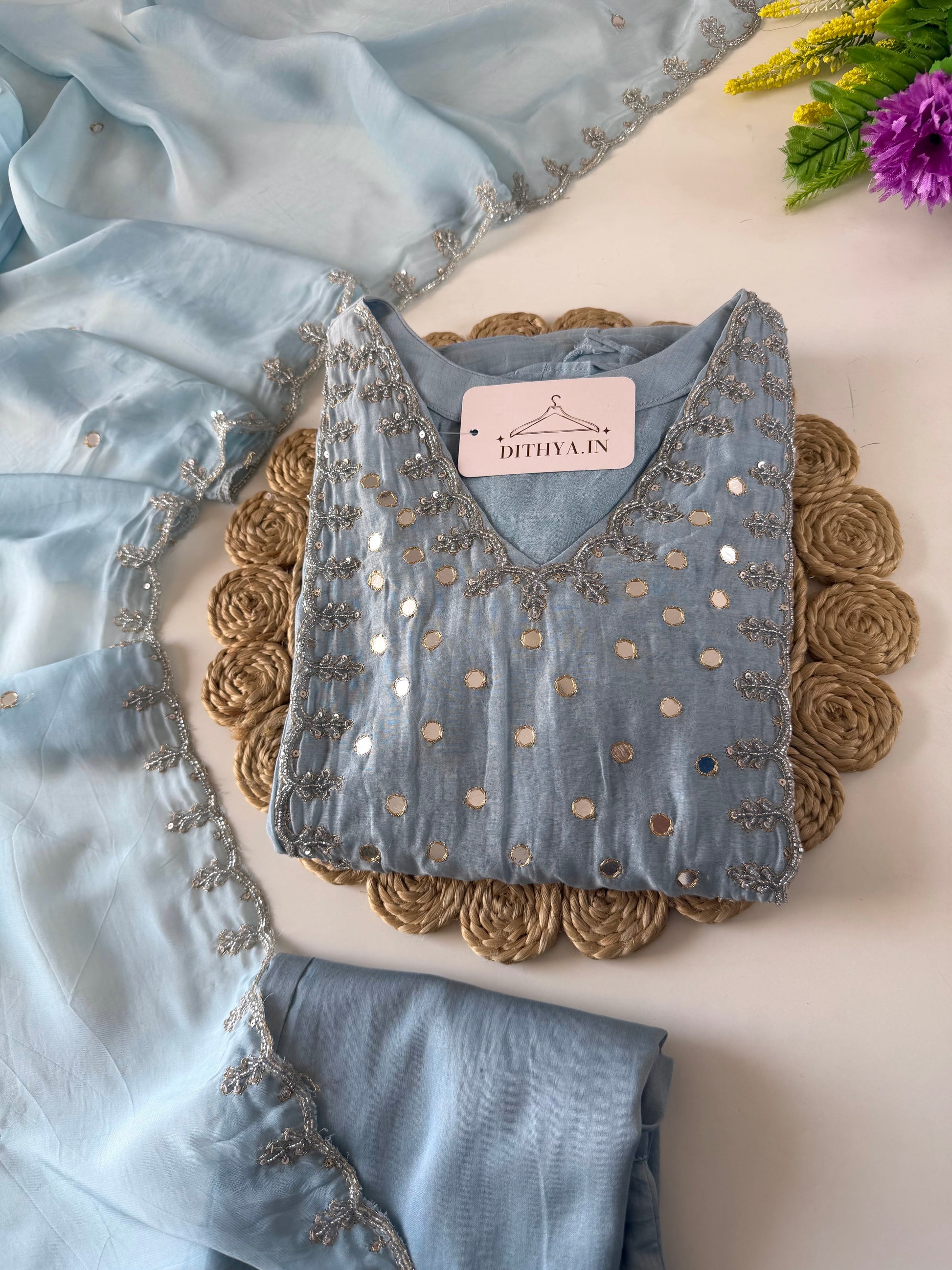 The K642 features a mul chanderi fabric Anarkali, renowned for its lightweight and breathable qualities, complemented by intricate mirror work that enhances visual appeal. This set includes matching pants and a dupatta, providing a cohesive and elegant attire option suitable for formal occasions. The combination of these elements ensures both comfort and style.