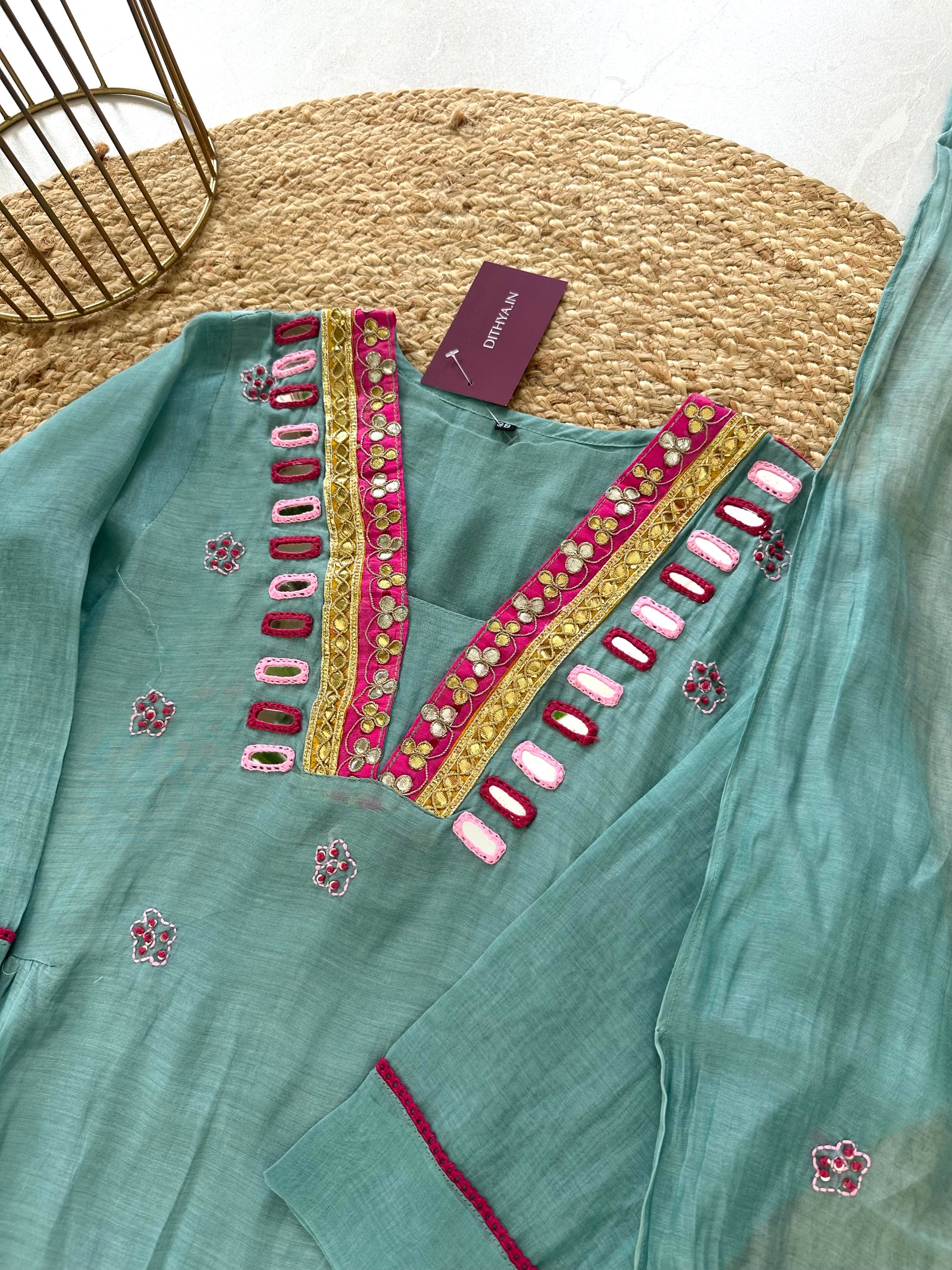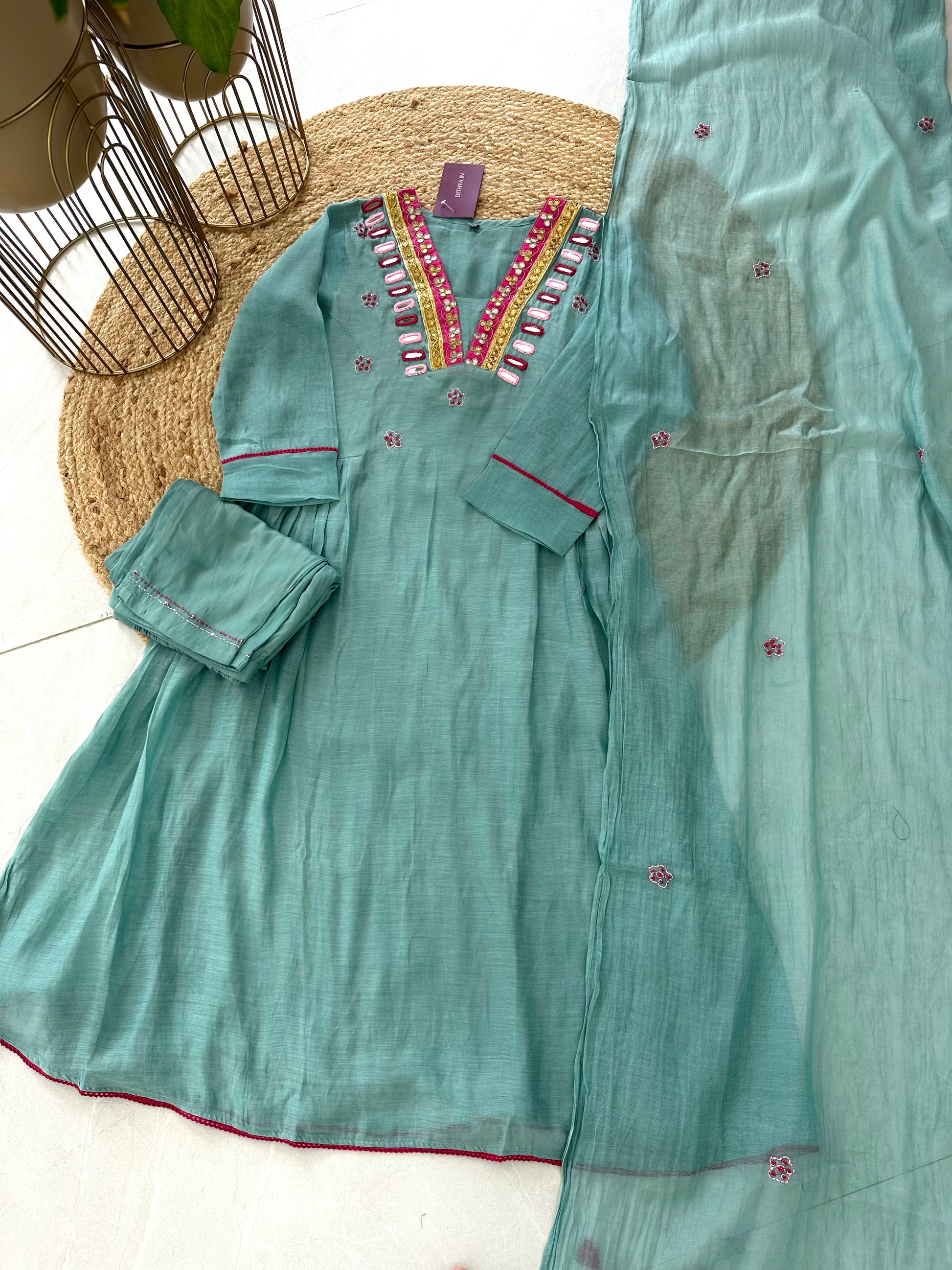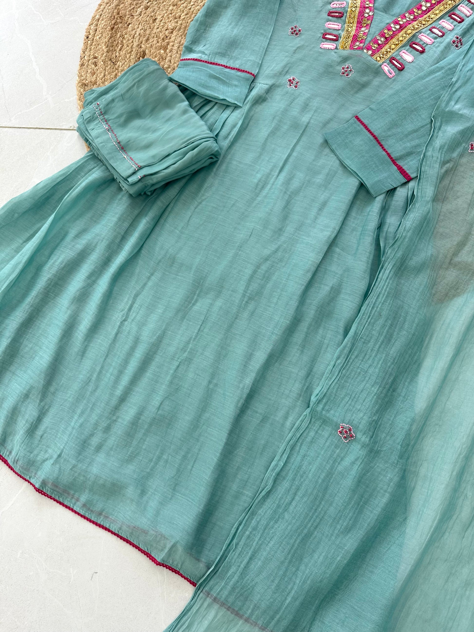 K147 - Mul Chanderi Mix handwork Aline Kurti with pants and dupatta