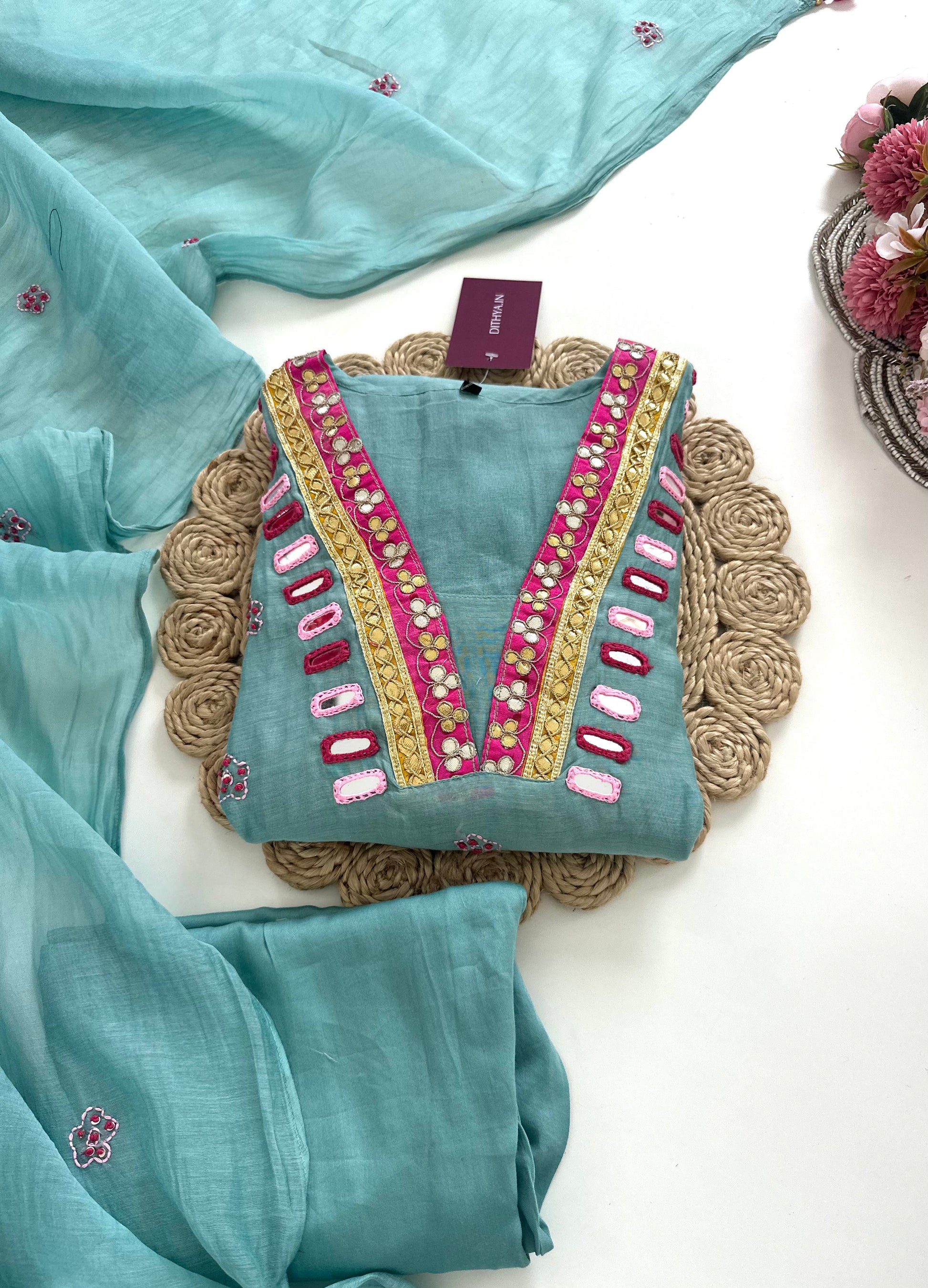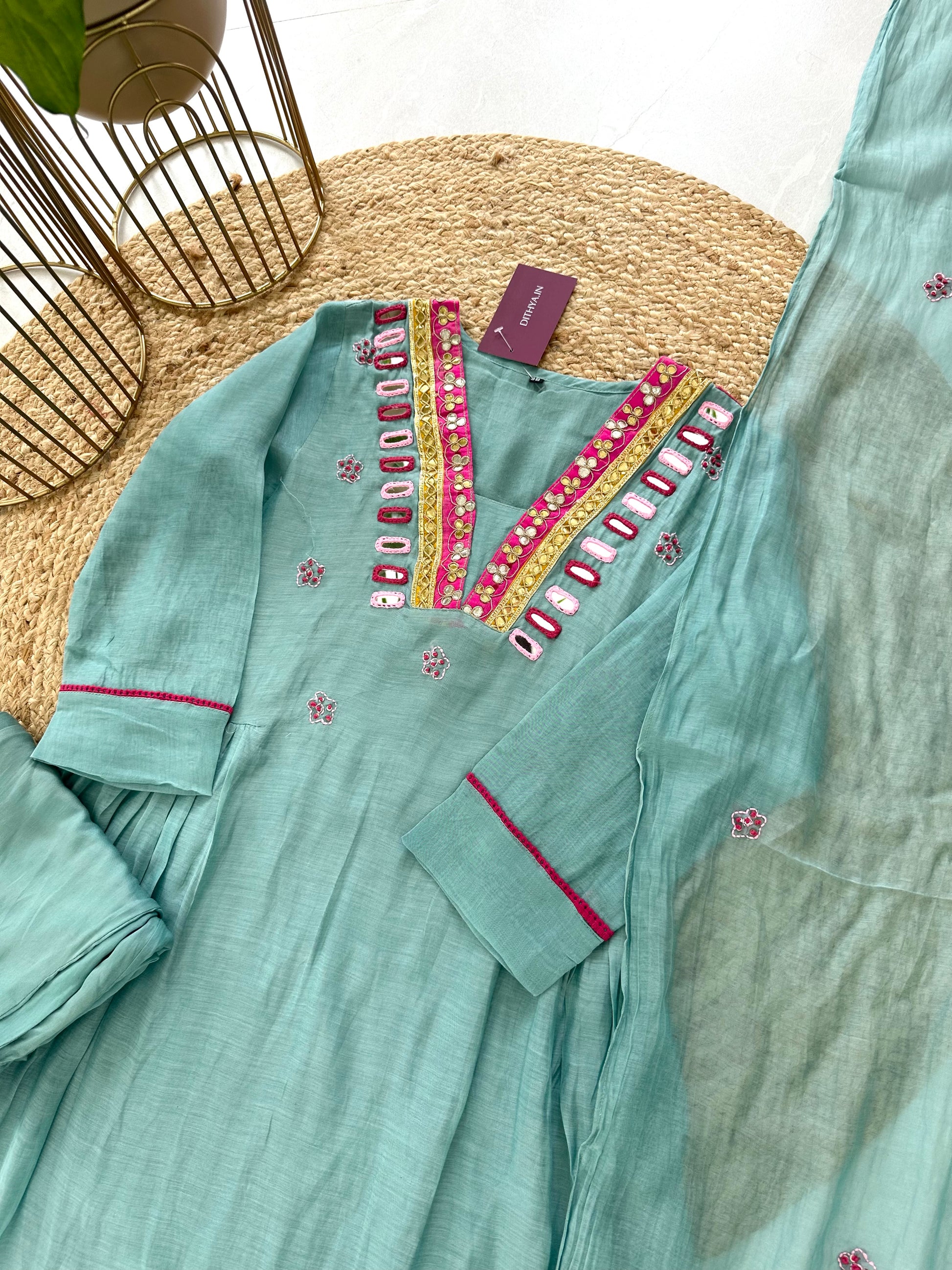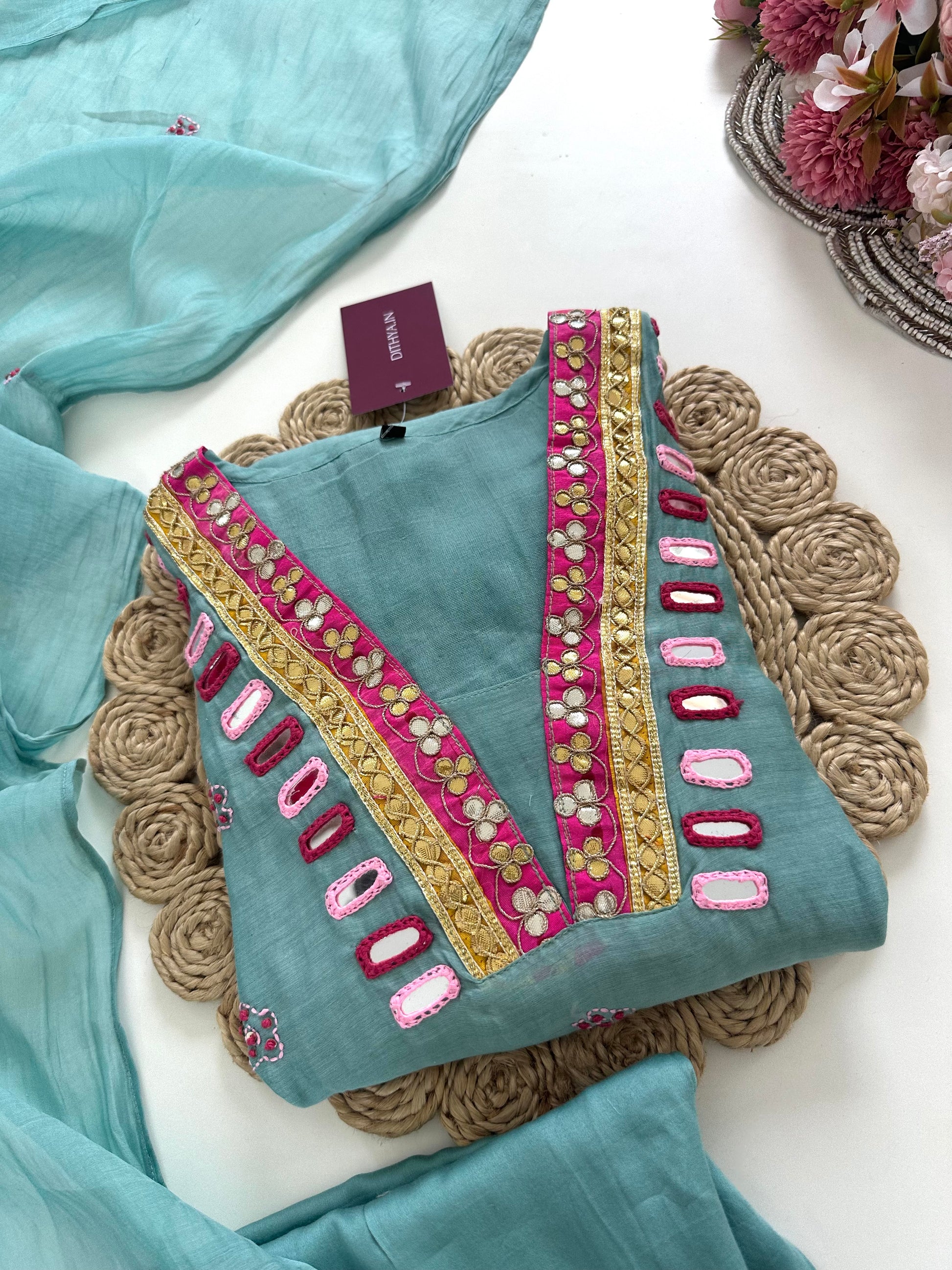 K147 - Mul Chanderi Mix handwork Aline Kurti with pants and dupatta