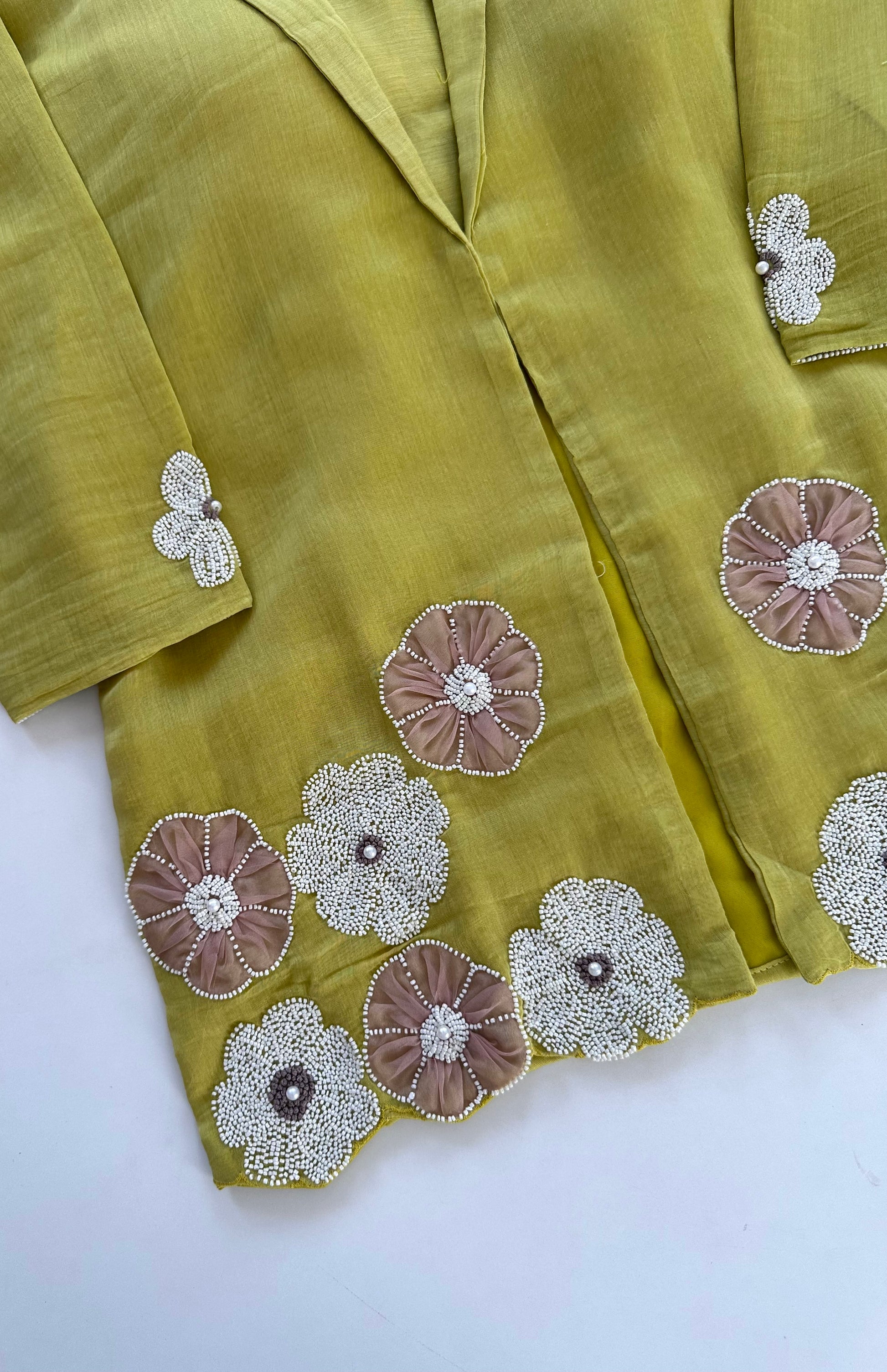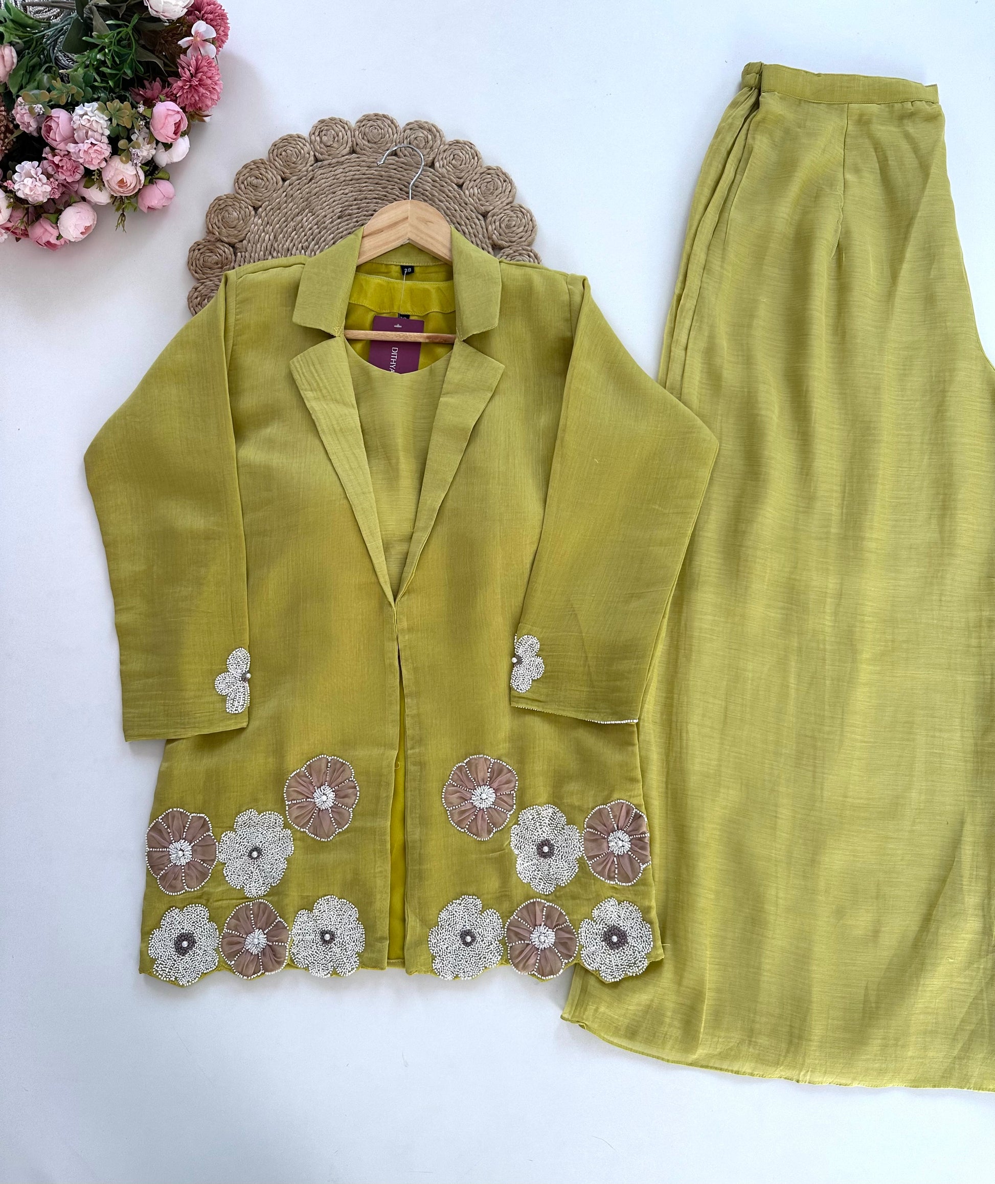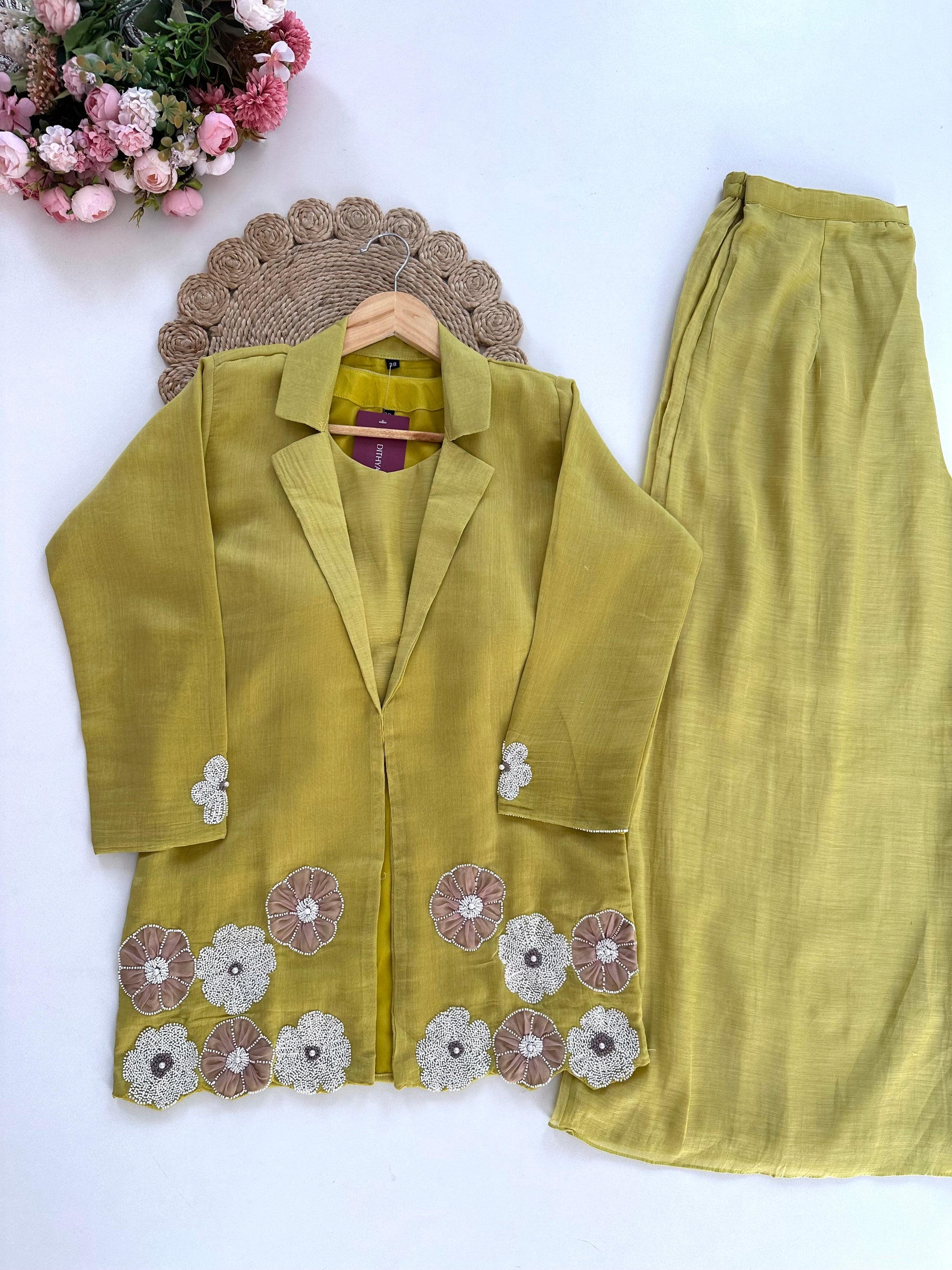 Discover the elegance and sophistication of our Mul Chanderi Pearl Work Blazer Set with Palazzo. Made from delicate Mul Chanderi fabric and adorned with intricate pearl work, this set is a perfect combination of style and comfort. Available in two stunning colors.
