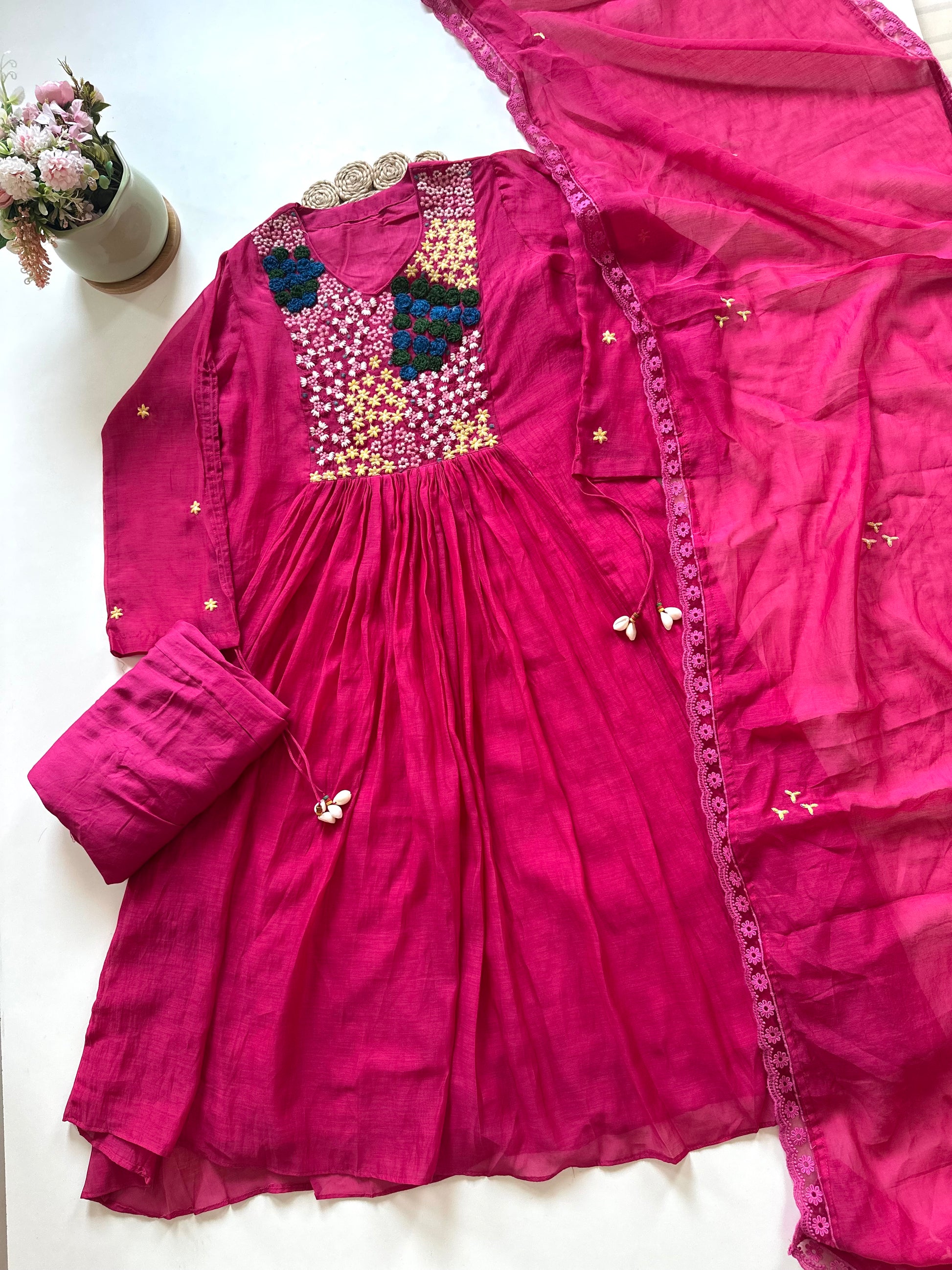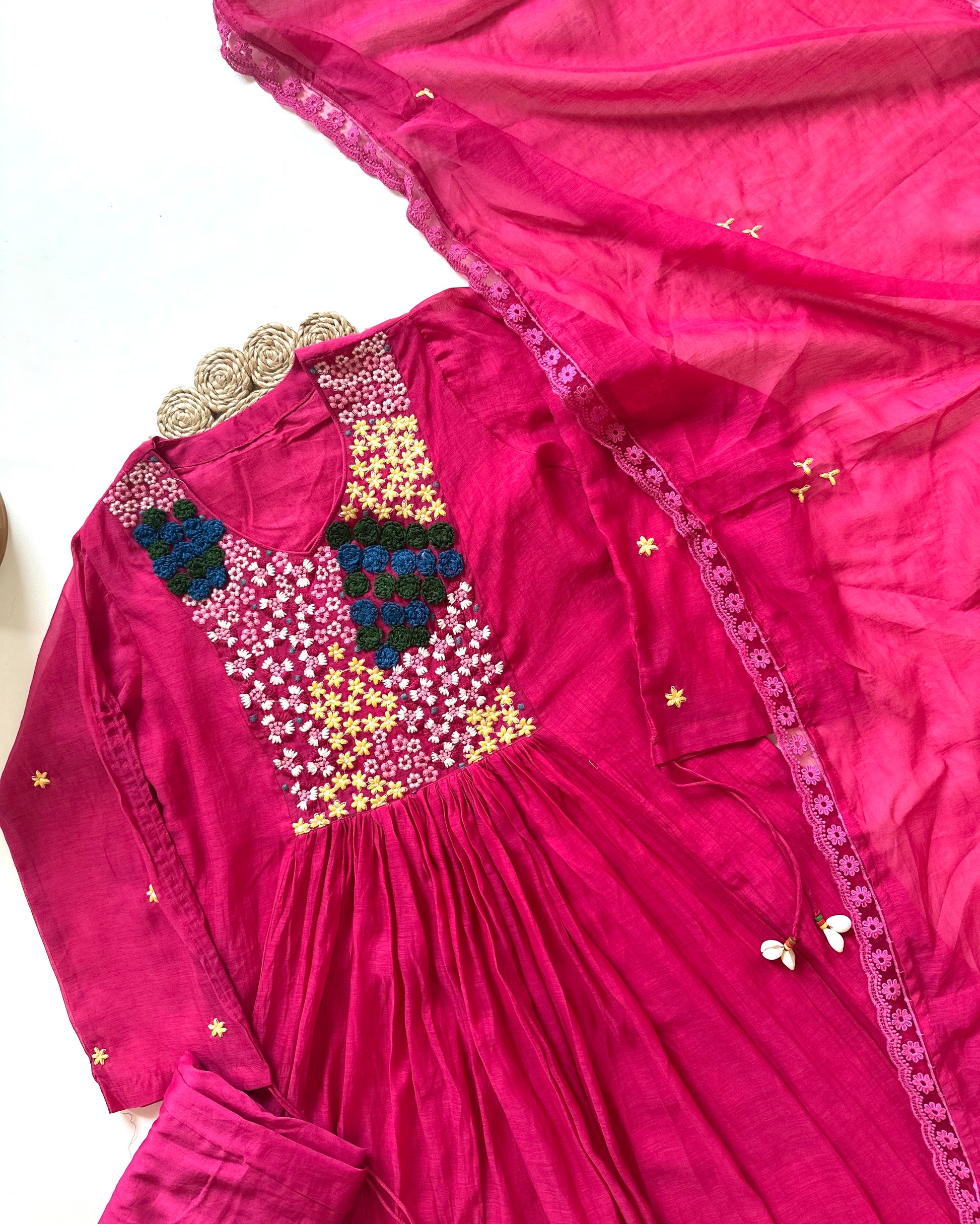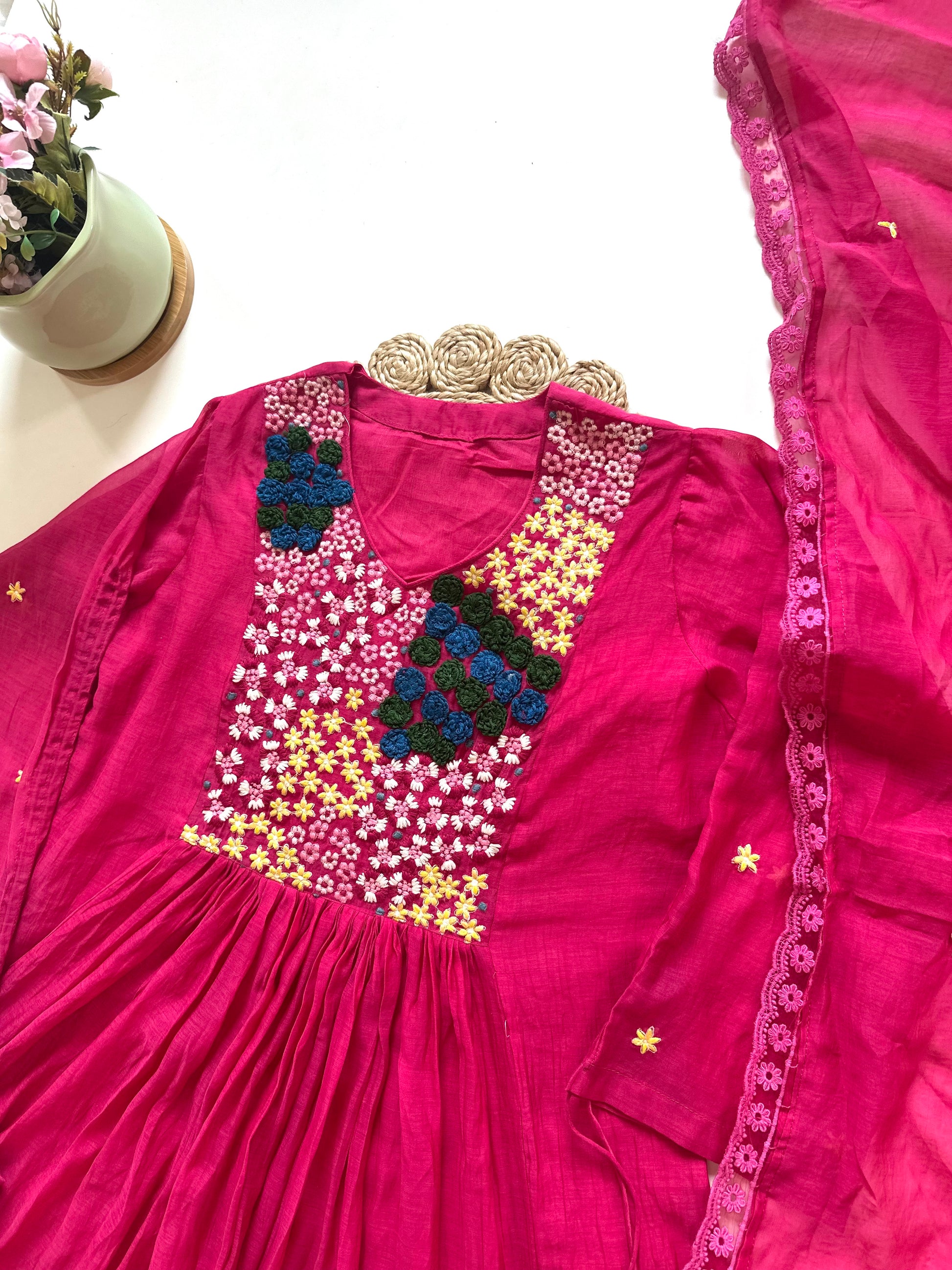 K172 - Mul Chanderi thread work Aline Kurti with pants and dupatta .
