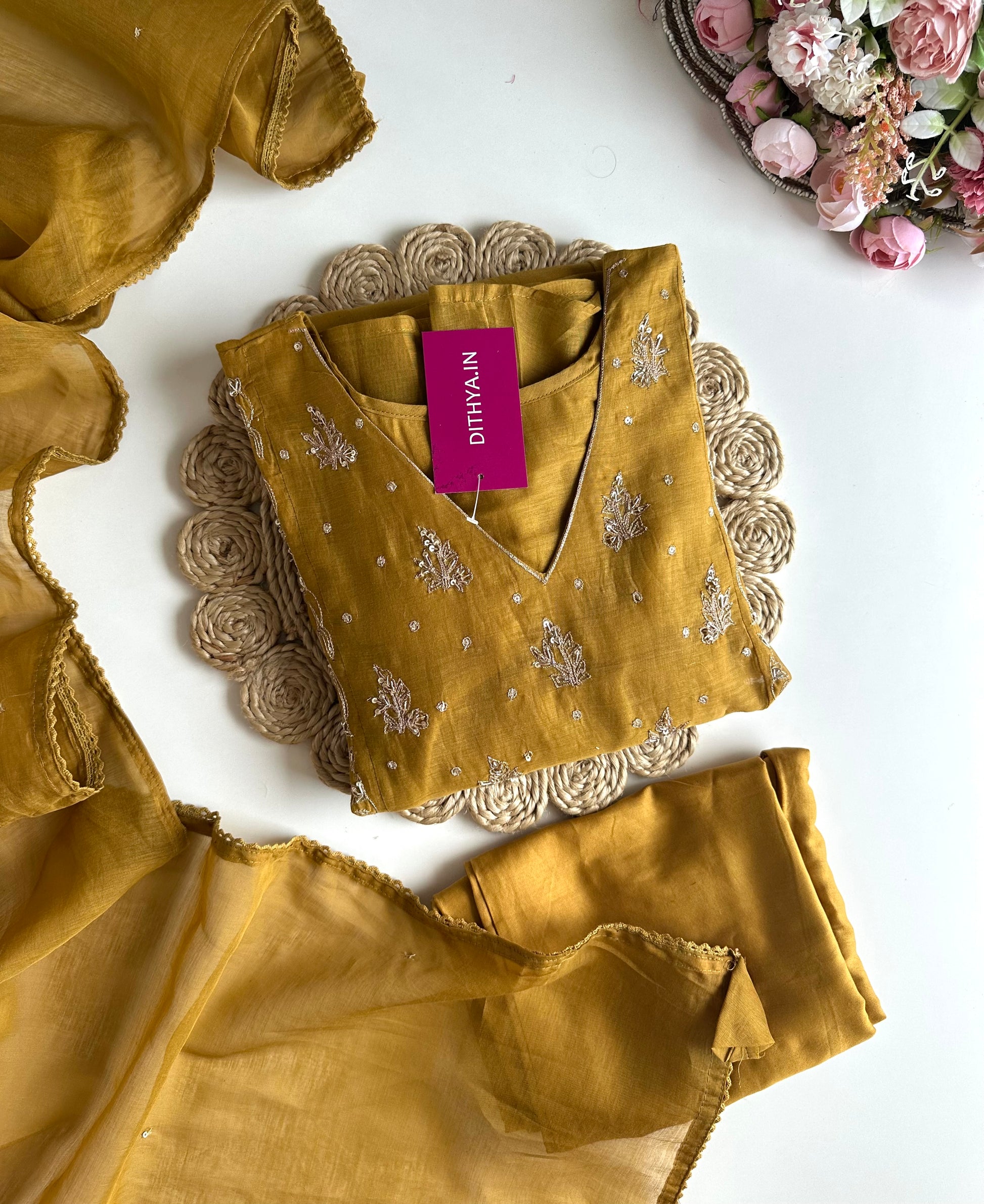 This Mul Chanderi zardosi Anarkali outfit is made of high-quality fabric, featuring intricate zardosi embroidery. It comes with matching pants and a dupatta, making it a complete ensemble. The delicate detailing and luxurious fabric add an elegant touch to any occasion.