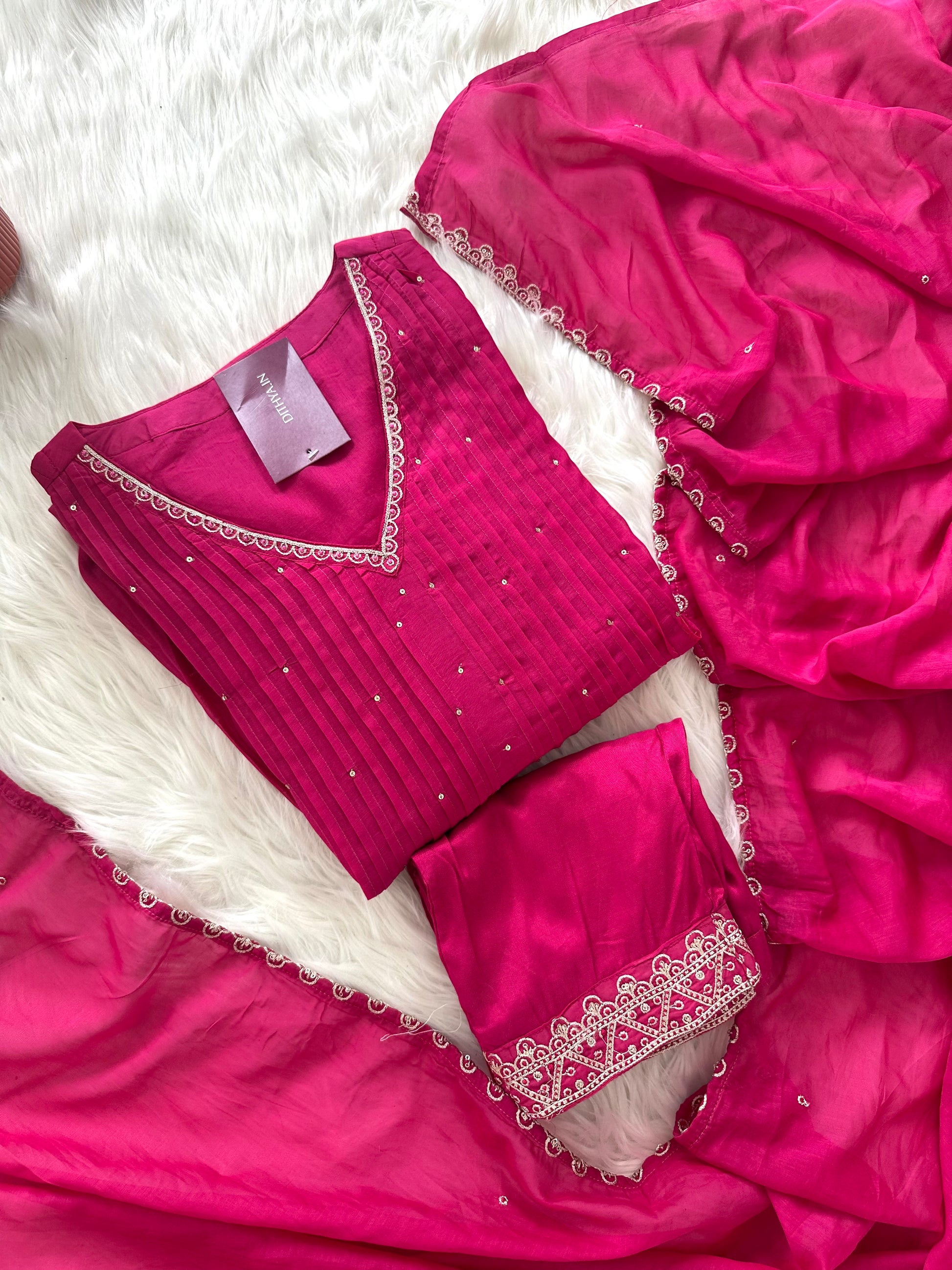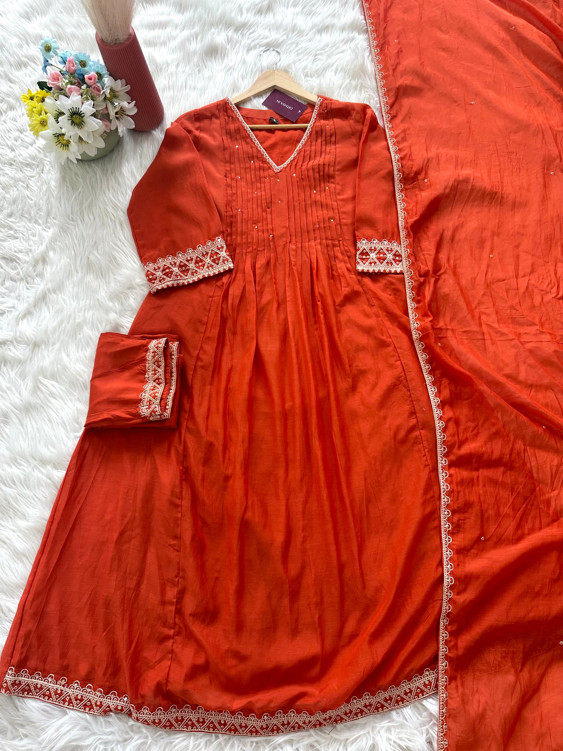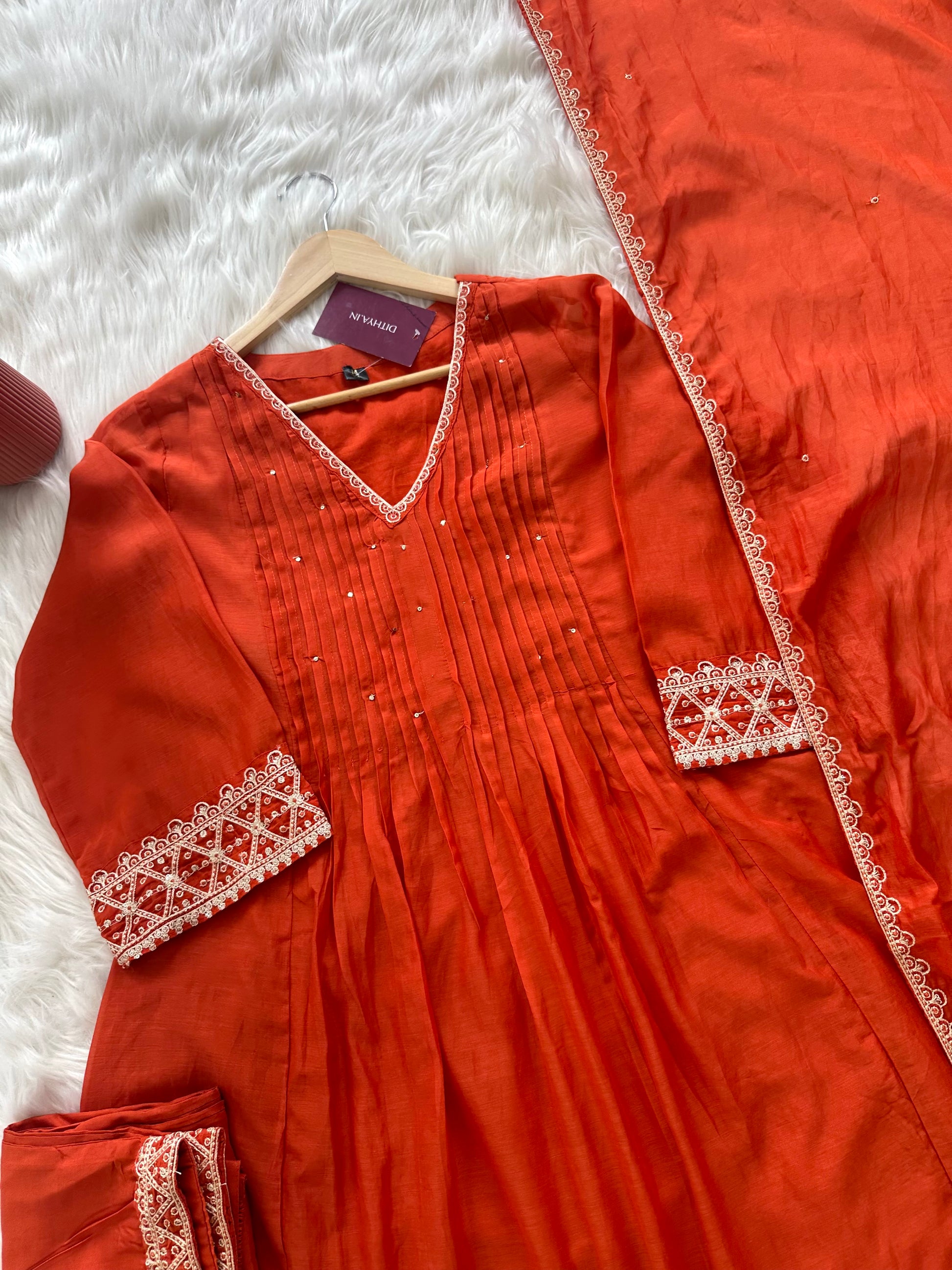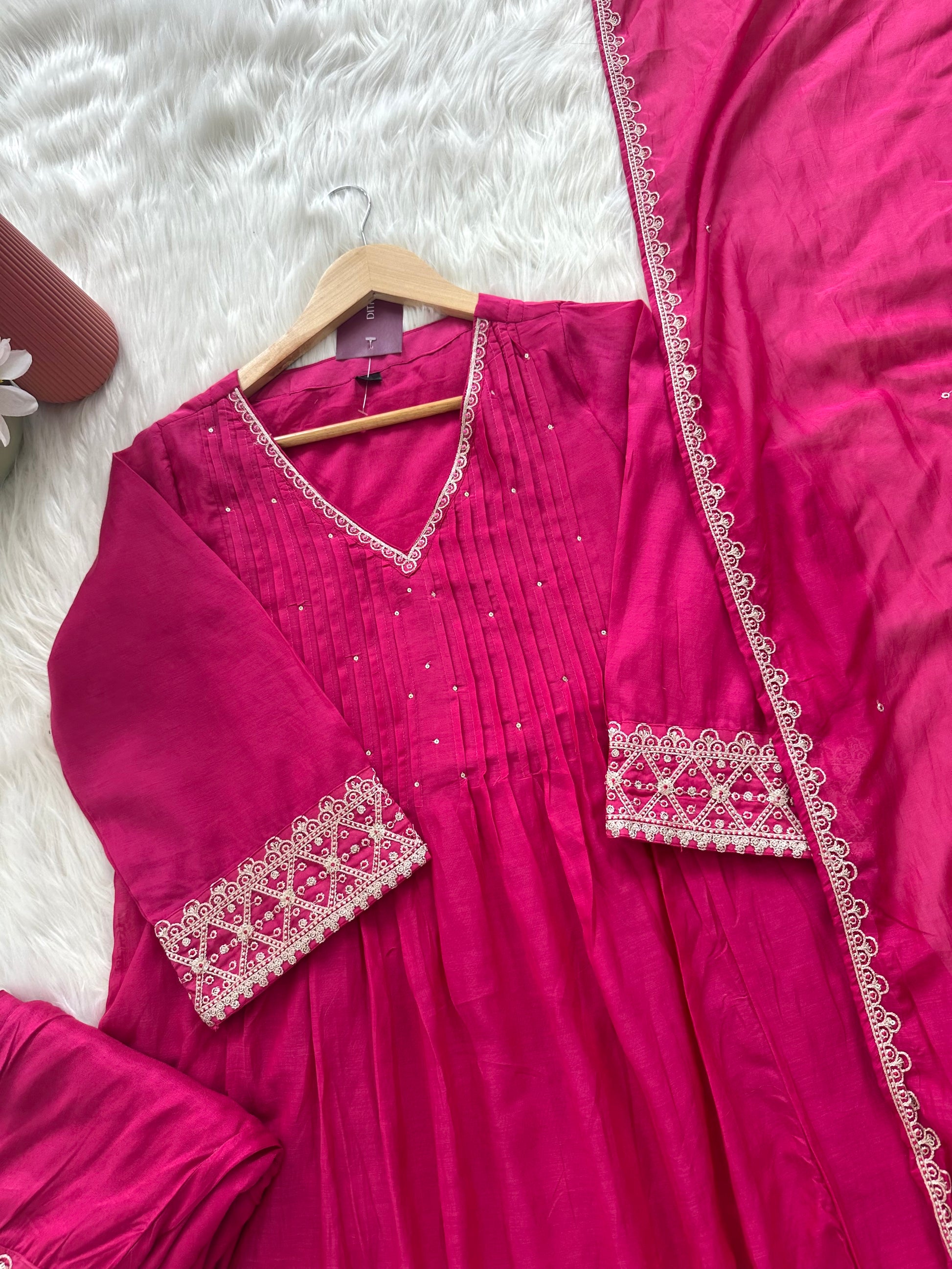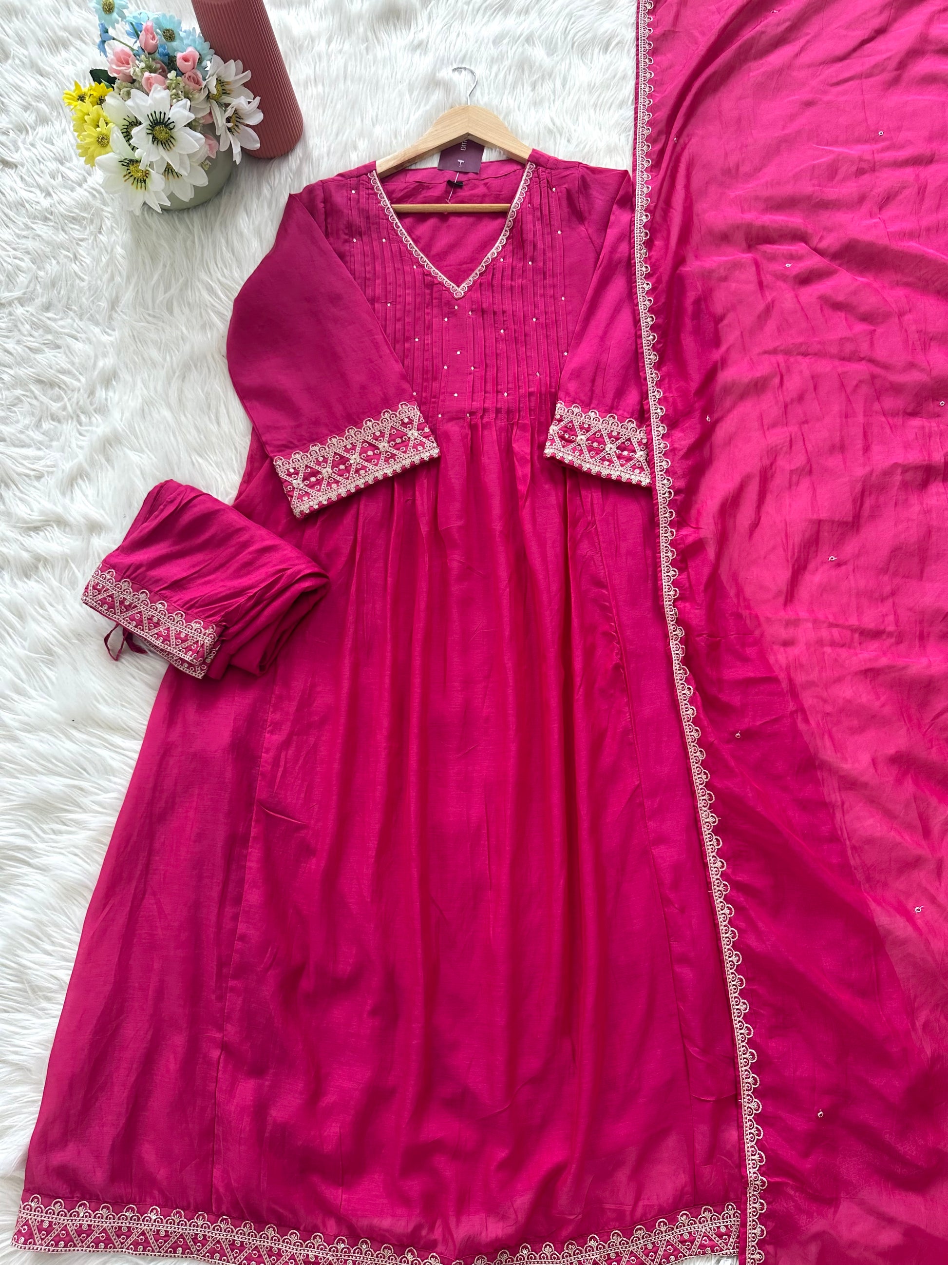 K369 - Mul Chanderi zari work Aline Kurti with pants and dupatta in 2 colours