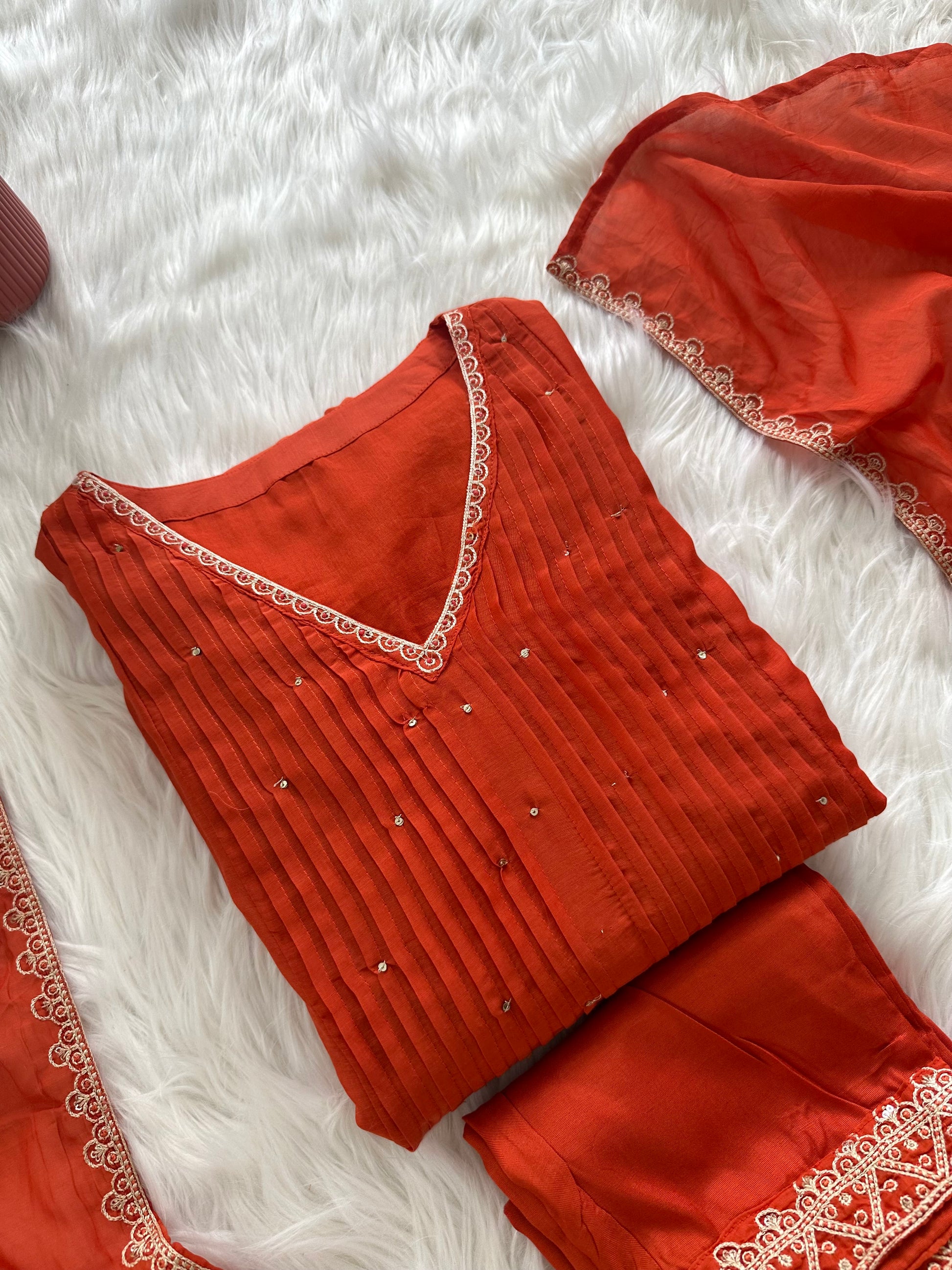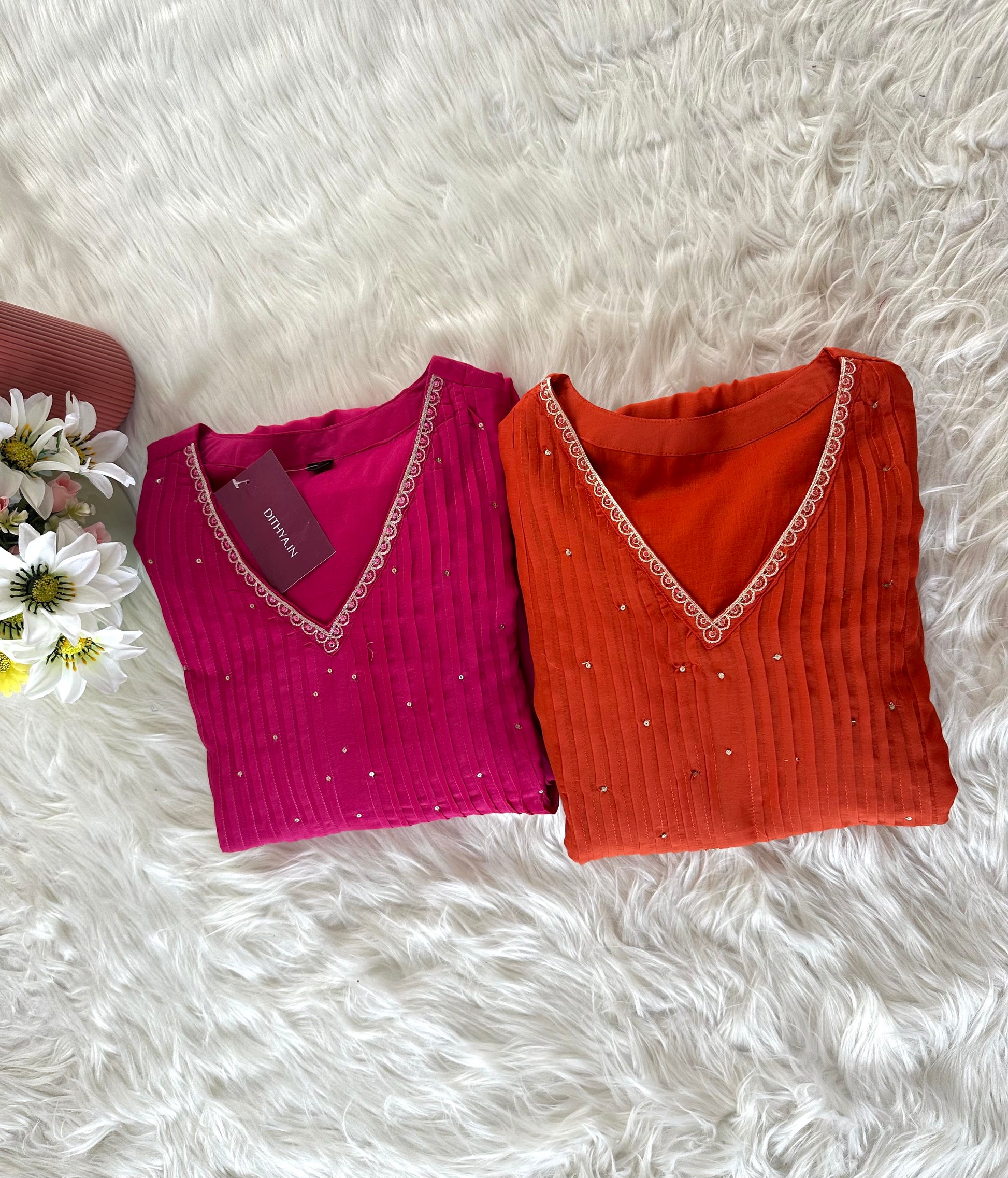 Experience elegance and glamour with our Kurti set. Made with Mul Chanderi fabric and adorned with intricate zari work, this Aline Kurti comes with matching pants and dupatta. Available in 2 stunning colors, this set is perfect for any occasion. Upgrade your wardrobe today!