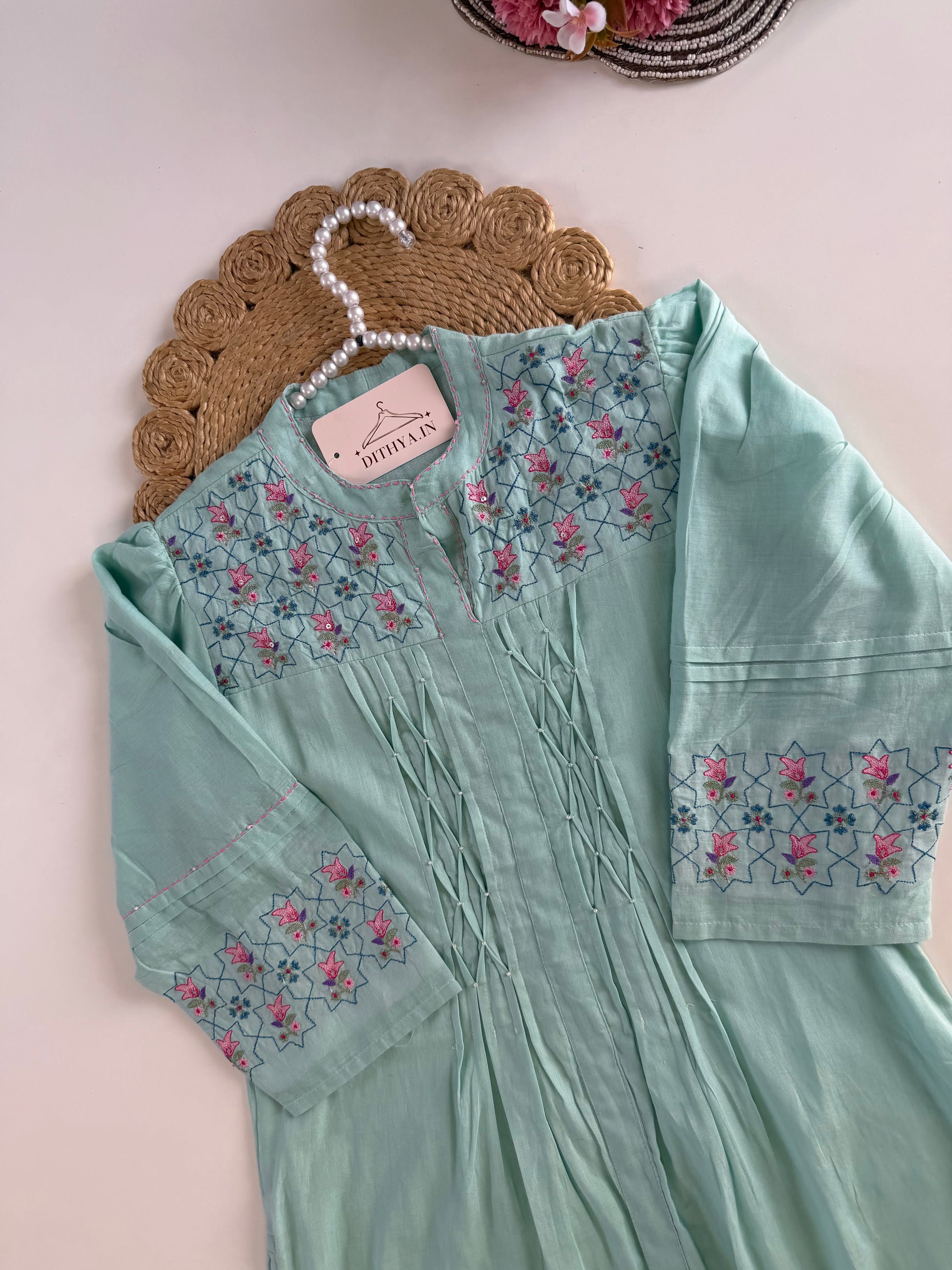 K621 - Mul cotton embroidered Aline Kurti with pants