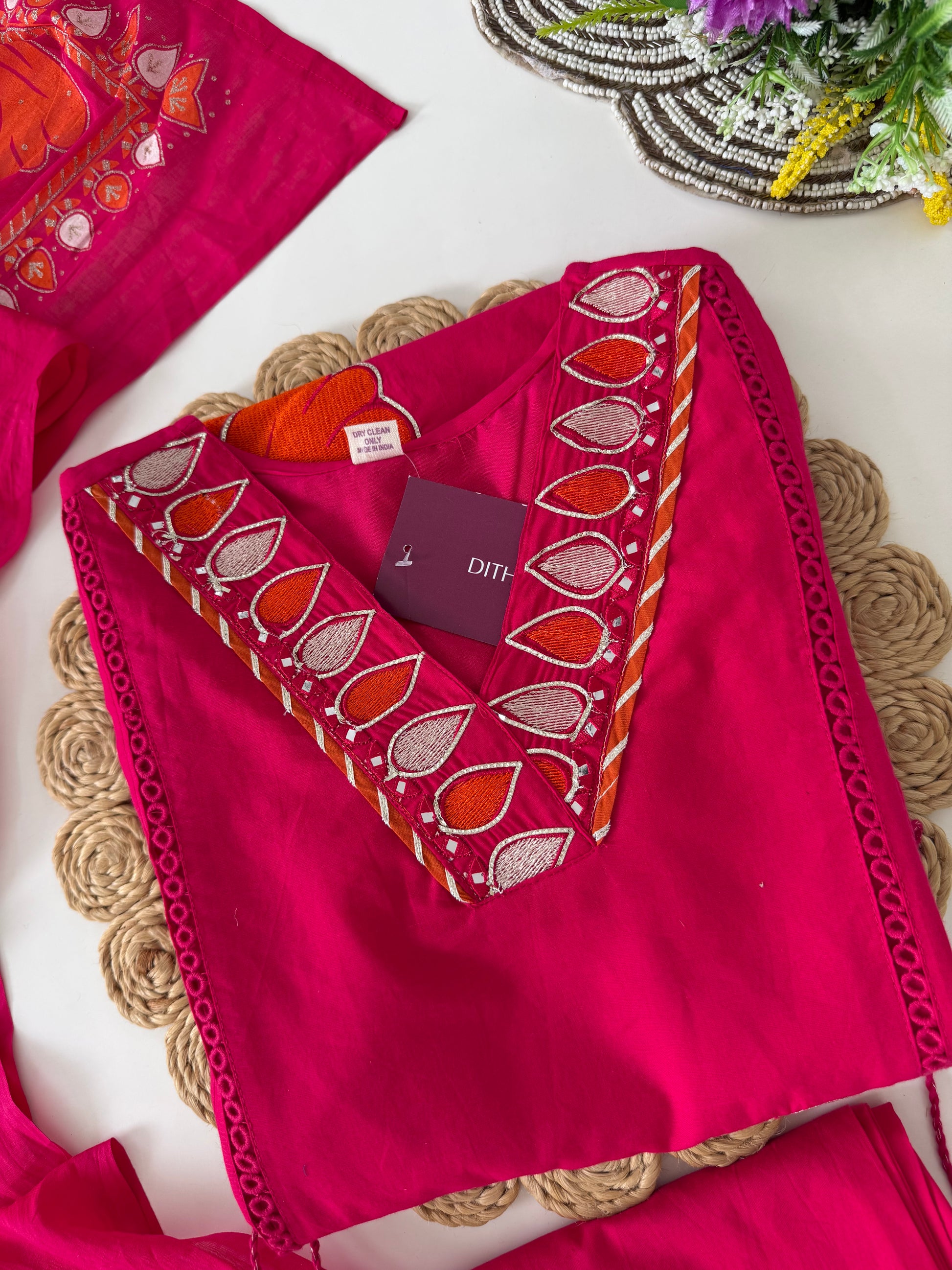 K531 - Mul Cotton embroidered aline Kurti with pants and dupatta
