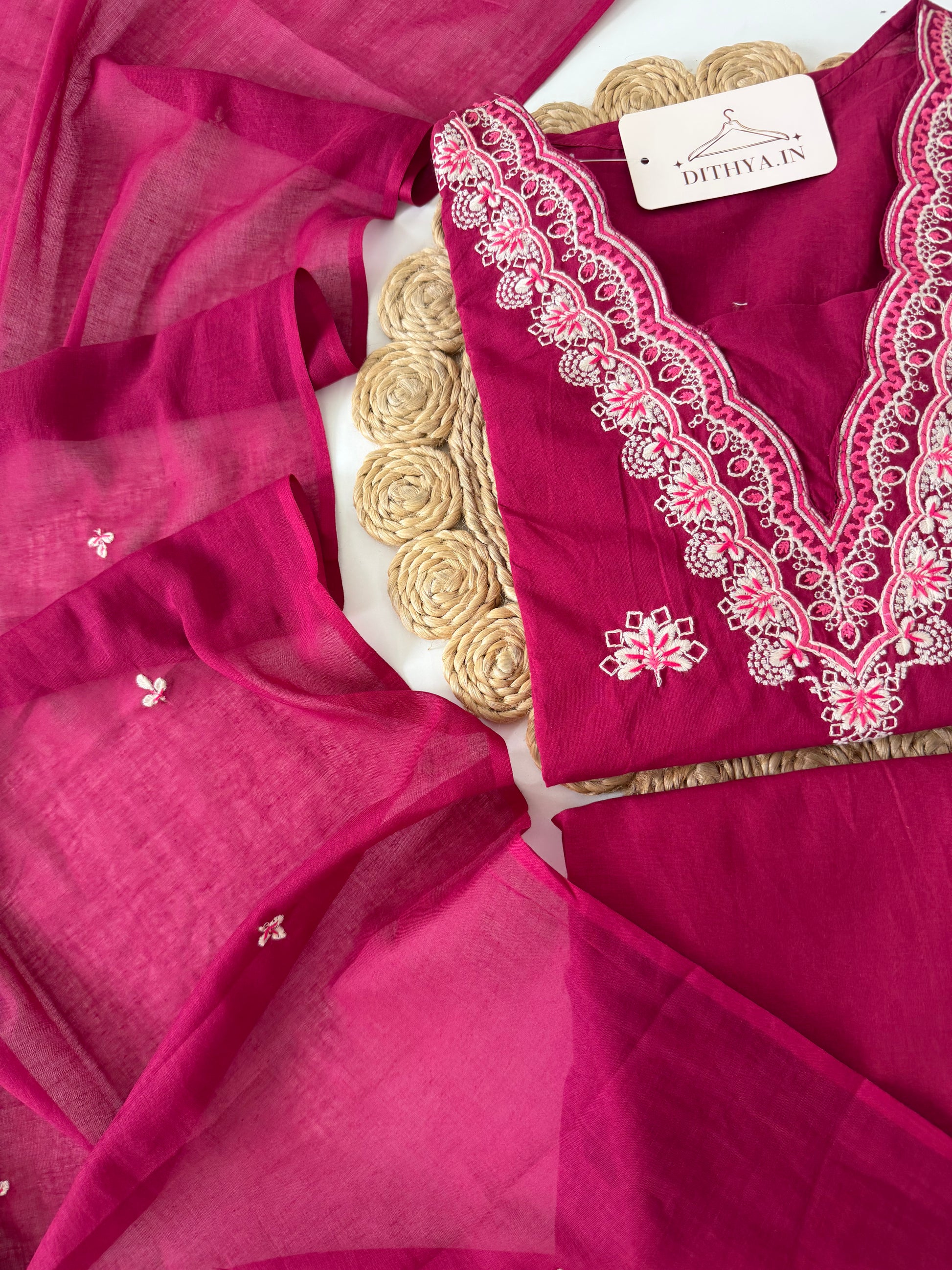 K434 - Mul cotton embroidered Aline Kurti with pants and dupatta