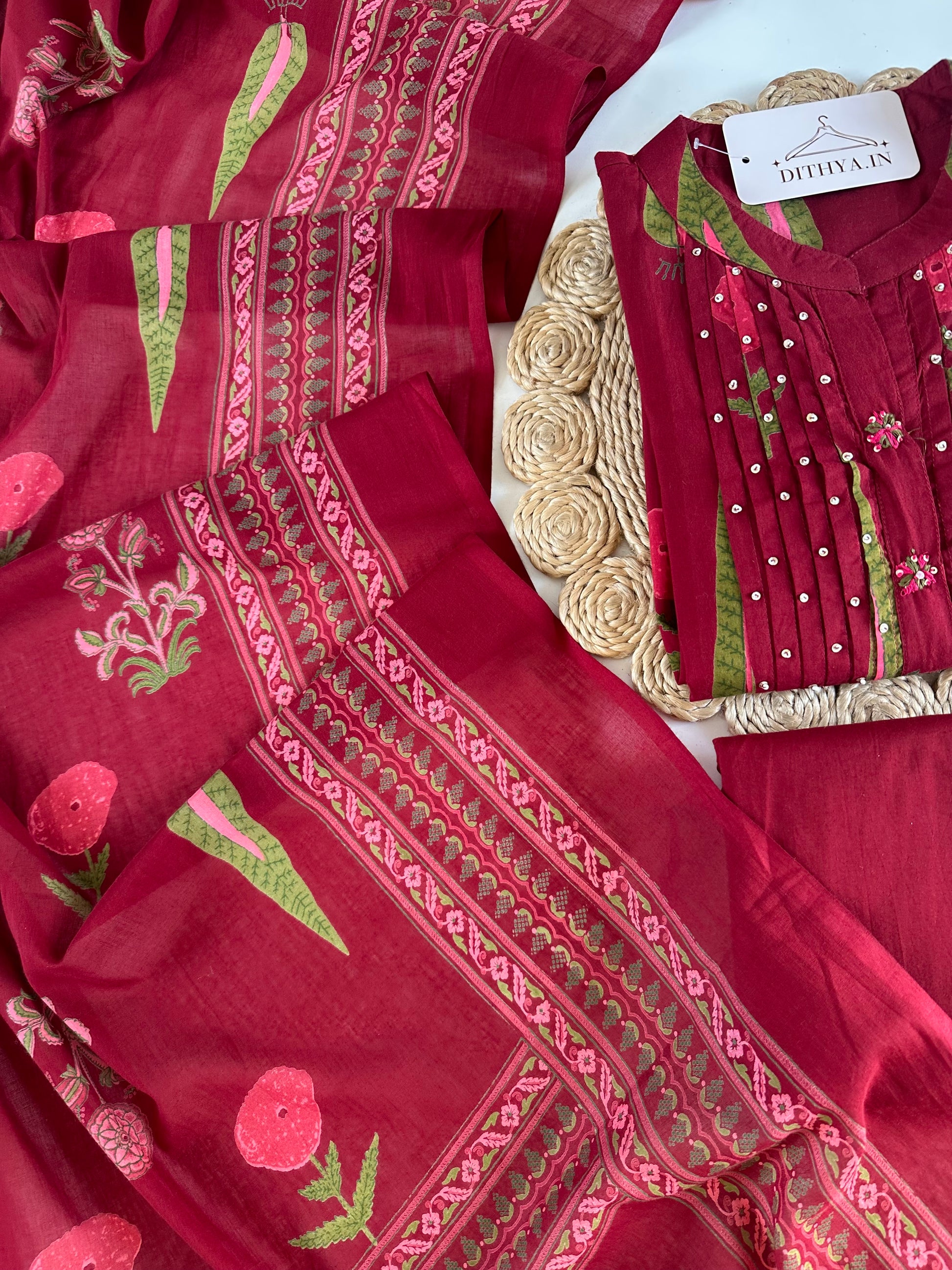 K693 - Mul cotton embroidered Aline Kurti with pants and dupatta