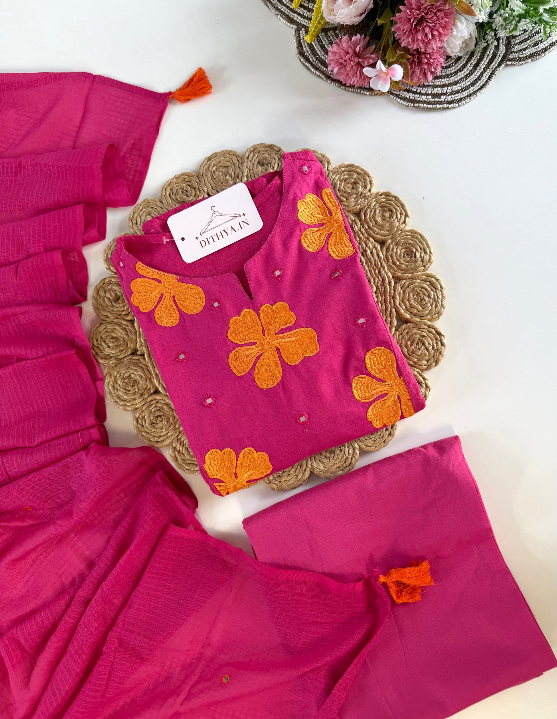 Elevate your ethnic wardrobe with this sophisticated mul cotton ensemble. The Aline kurti features intricate embroidery that adds refined elegance to your everyday look. Crafted from breathable mul cotton, it ensures comfort throughout the day while maintaining its graceful silhouette. The coordinated pants provide a perfect fit, while the matching dupatta completes the traditional aesthetic. Ideal for festive occasions, family gatherings, or casual wear, this three-piece set offers versatility without compromising on style or quality.