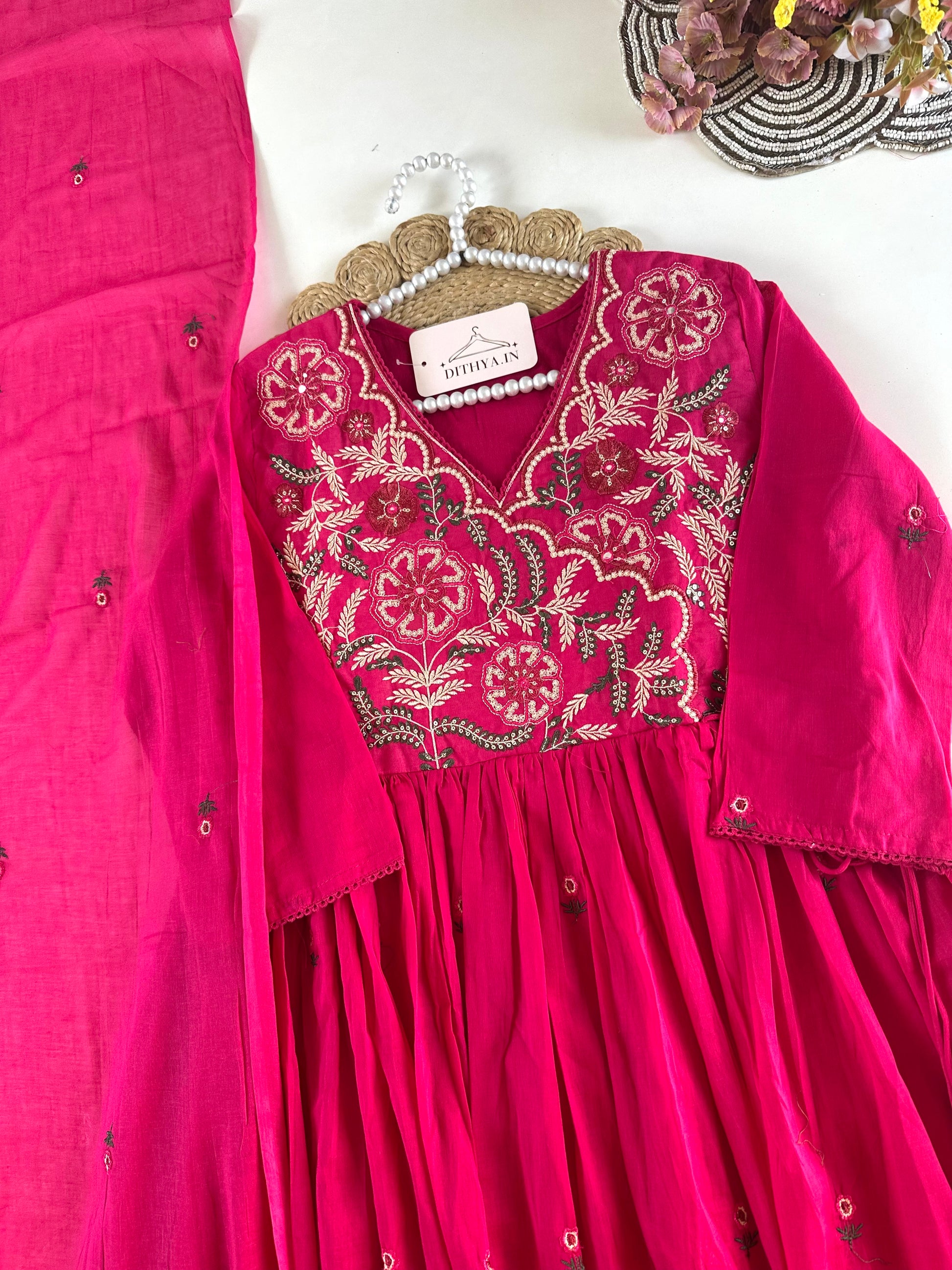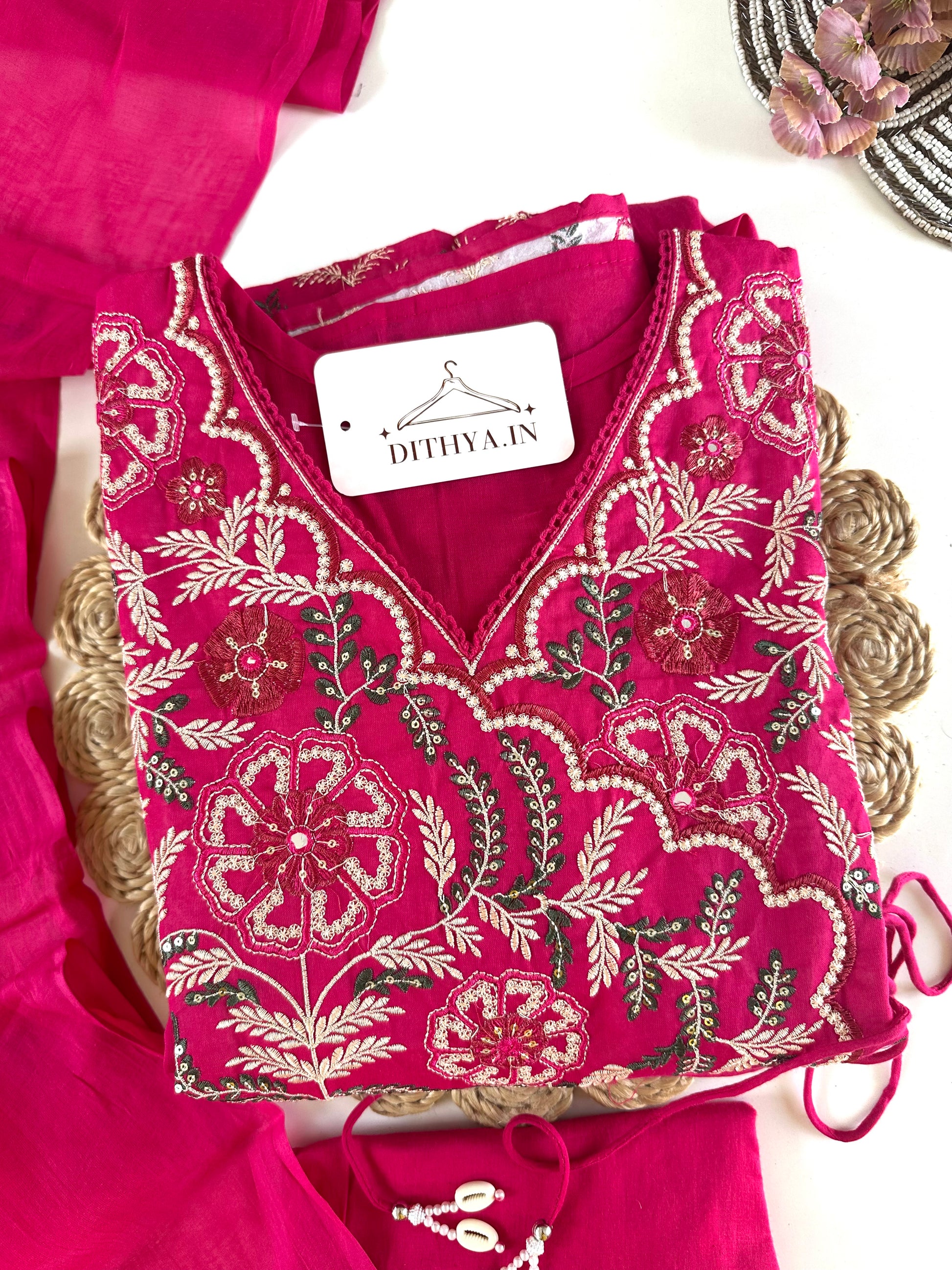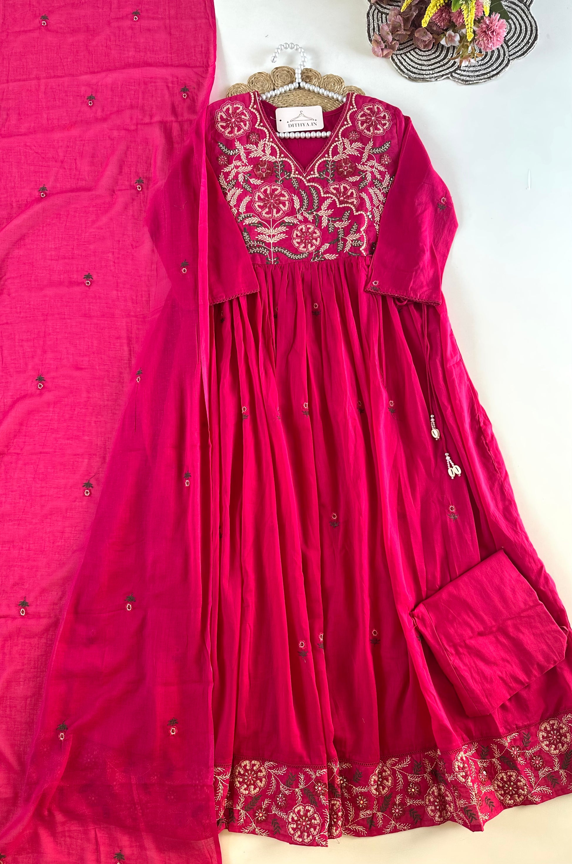 Elevate your ethnic wardrobe with this exquisite mul cotton Anarkali ensemble. Crafted from breathable mul cotton, this three-piece set features intricate embroidery work that showcases traditional artistry. The gracefully flared Anarkali silhouette offers comfortable movement while maintaining an elegant drape, complemented by coordinating pants for a polished fit. The accompanying dupatta adds versatility, allowing you to style it across your shoulders or drape it traditionally. Perfect for festive occasions, celebrations, or everyday wear, this ensemble combines comfort with timeless sophistication. The natural fabric ensures breathability in warm climates, making it an ideal choice for year-round elegance.