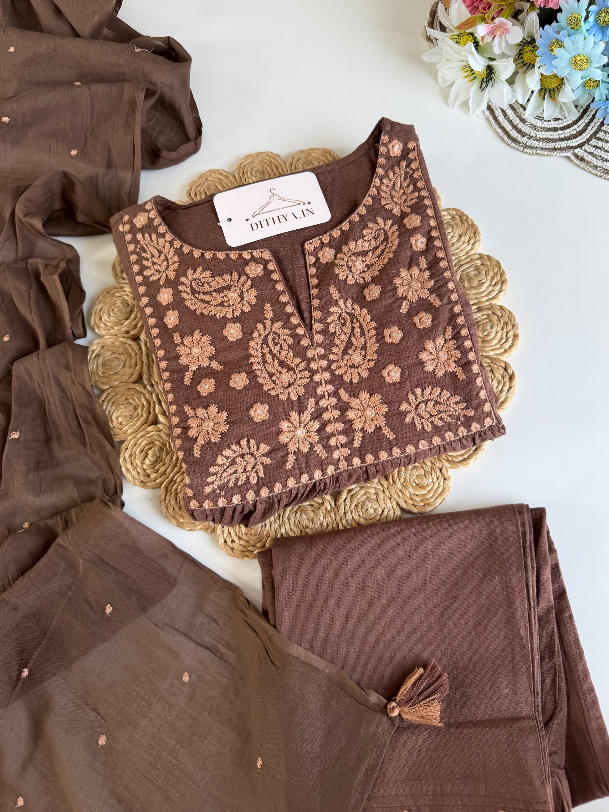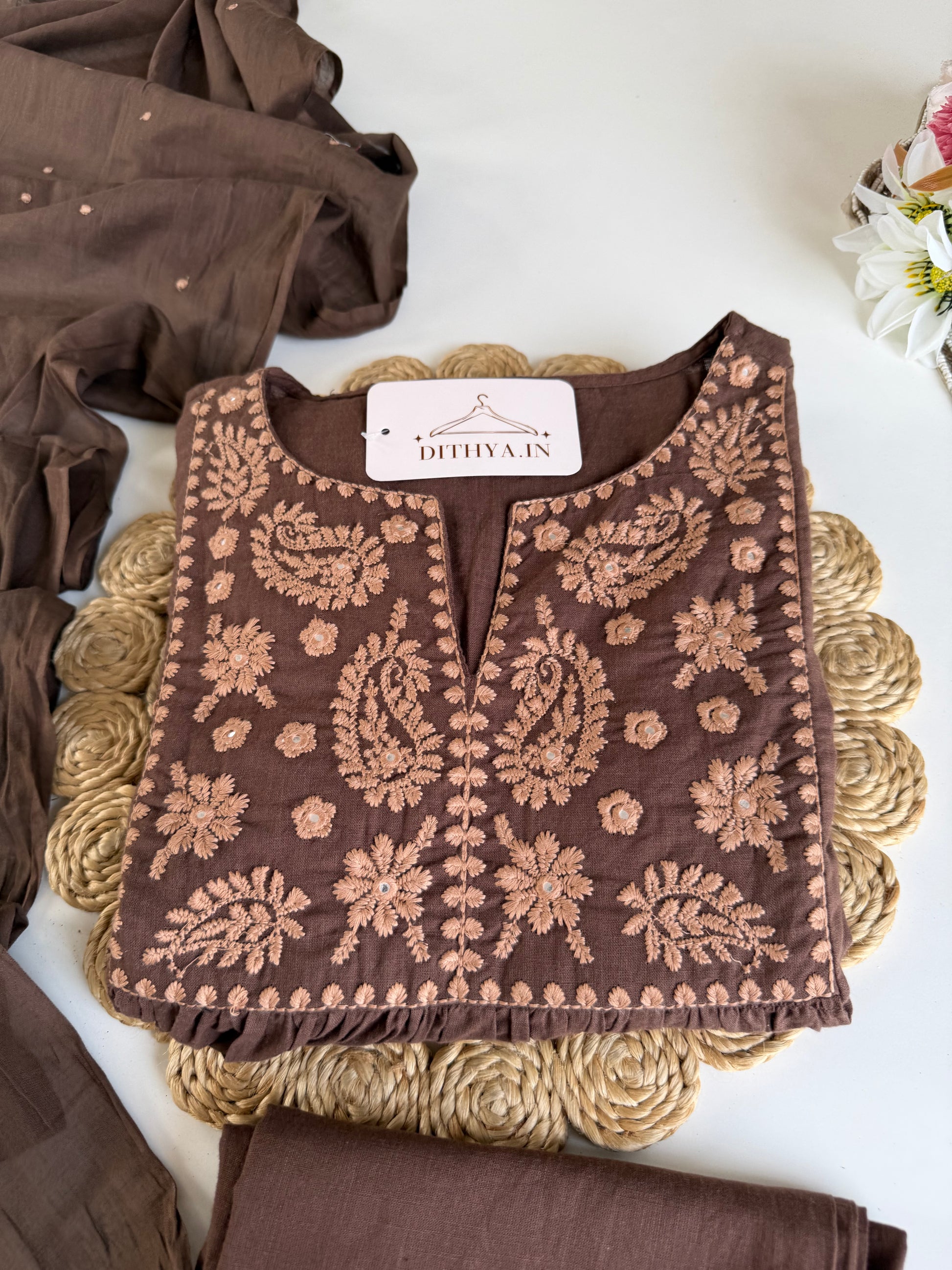 Elevate your ethnic wardrobe with this exquisite mul cotton Anarkali ensemble. Crafted from breathable mul cotton, this three-piece set features intricate embroidery work on the Anarkali kurta, paired with comfortable matching pants and a flowing dupatta. The lightweight fabric ensures all-day comfort, making it ideal for festive occasions, celebrations, or everyday wear. The detailed embroidery adds a touch of sophistication and traditional charm, while the classic Anarkali silhouette flatters all body types. Perfect for those who appreciate quality craftsmanship and timeless ethnic fashion.