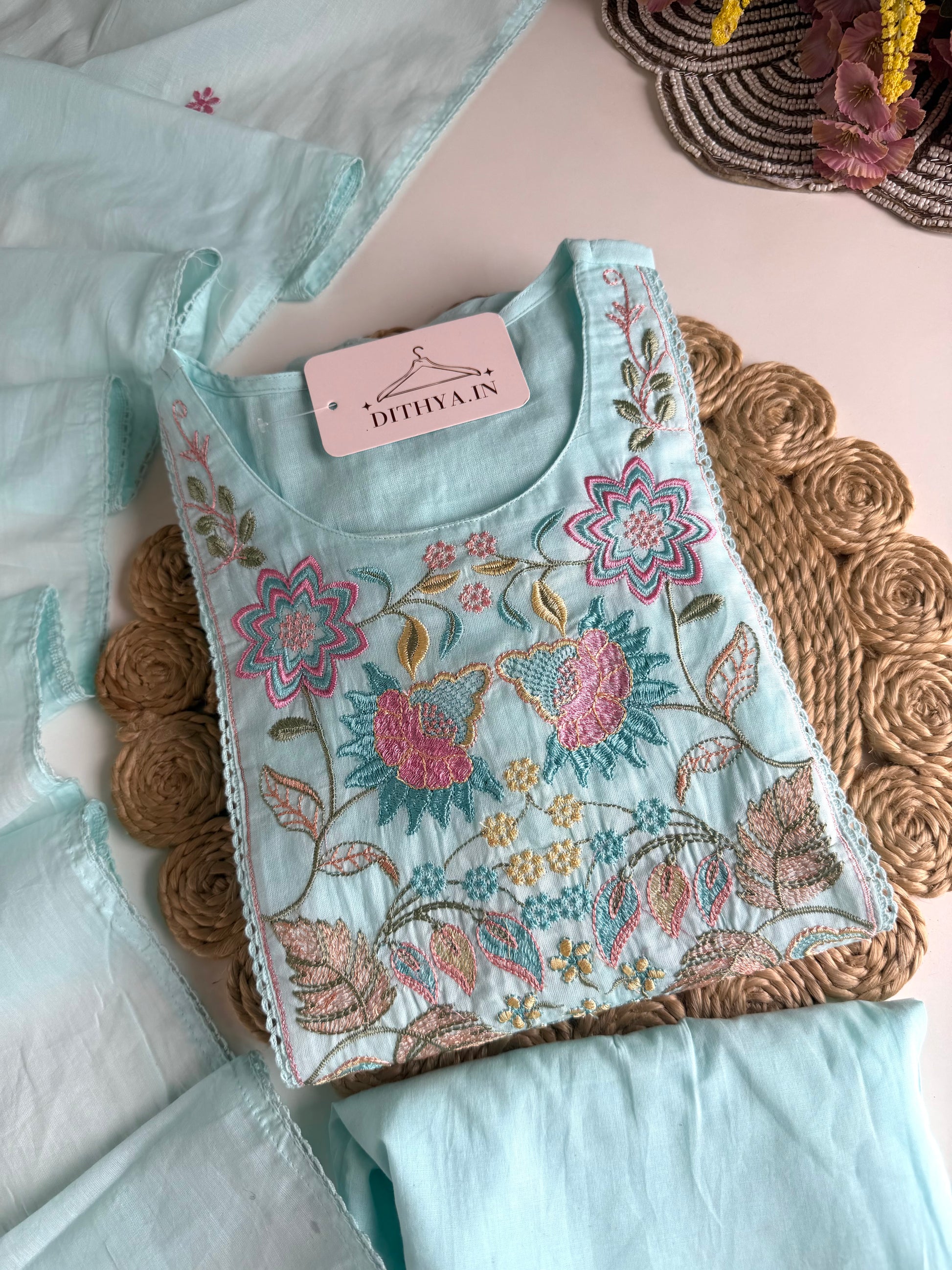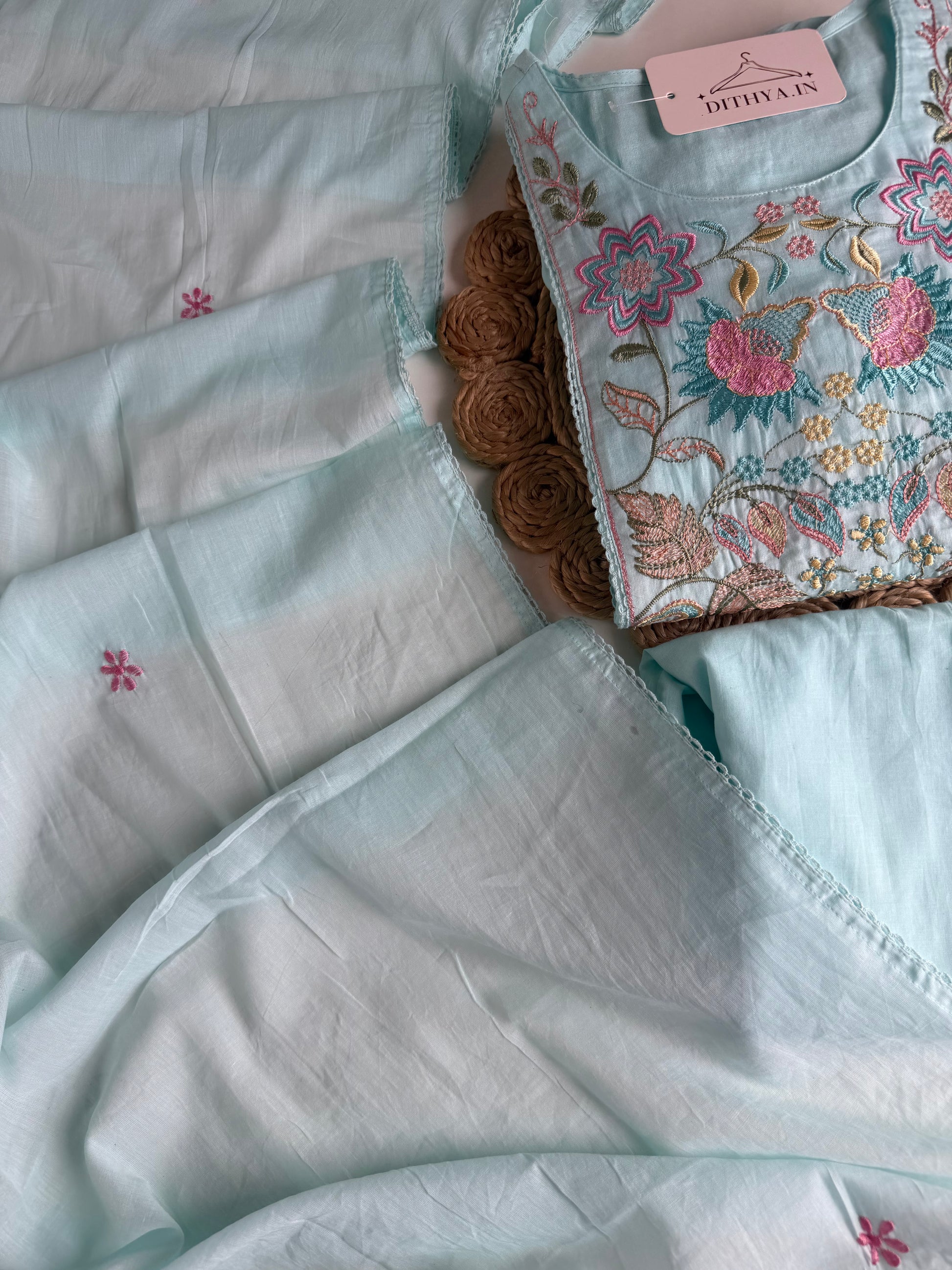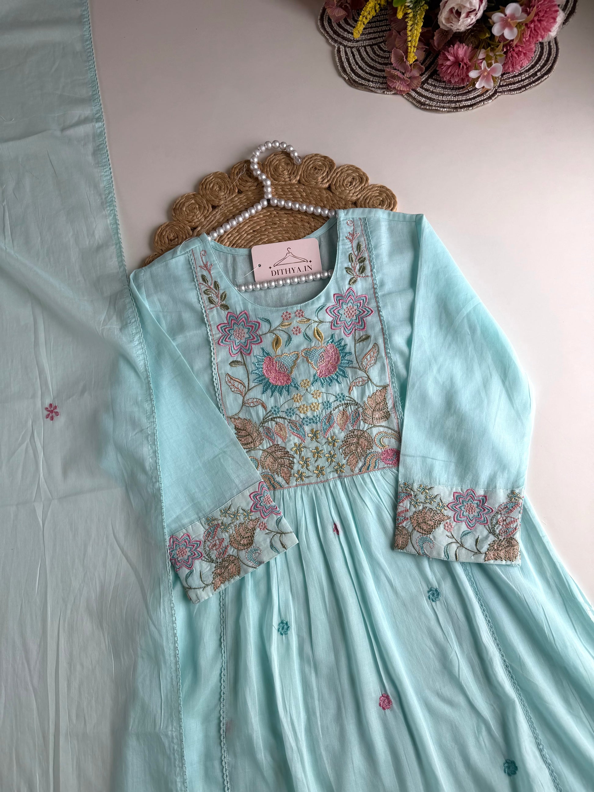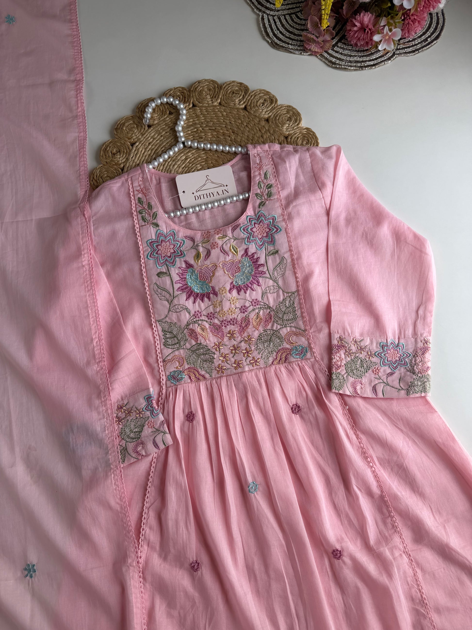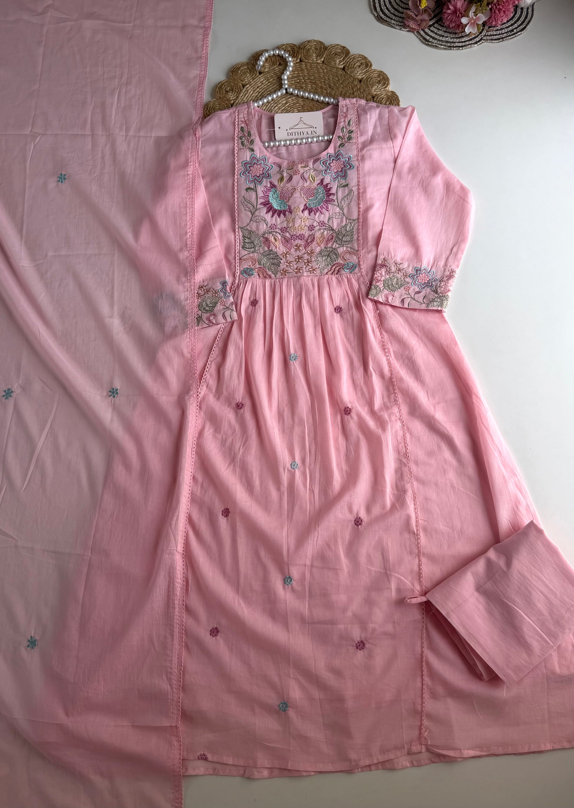 K215 - Mul cotton embroidered Anarkali with pants and dupatta in 2 colours