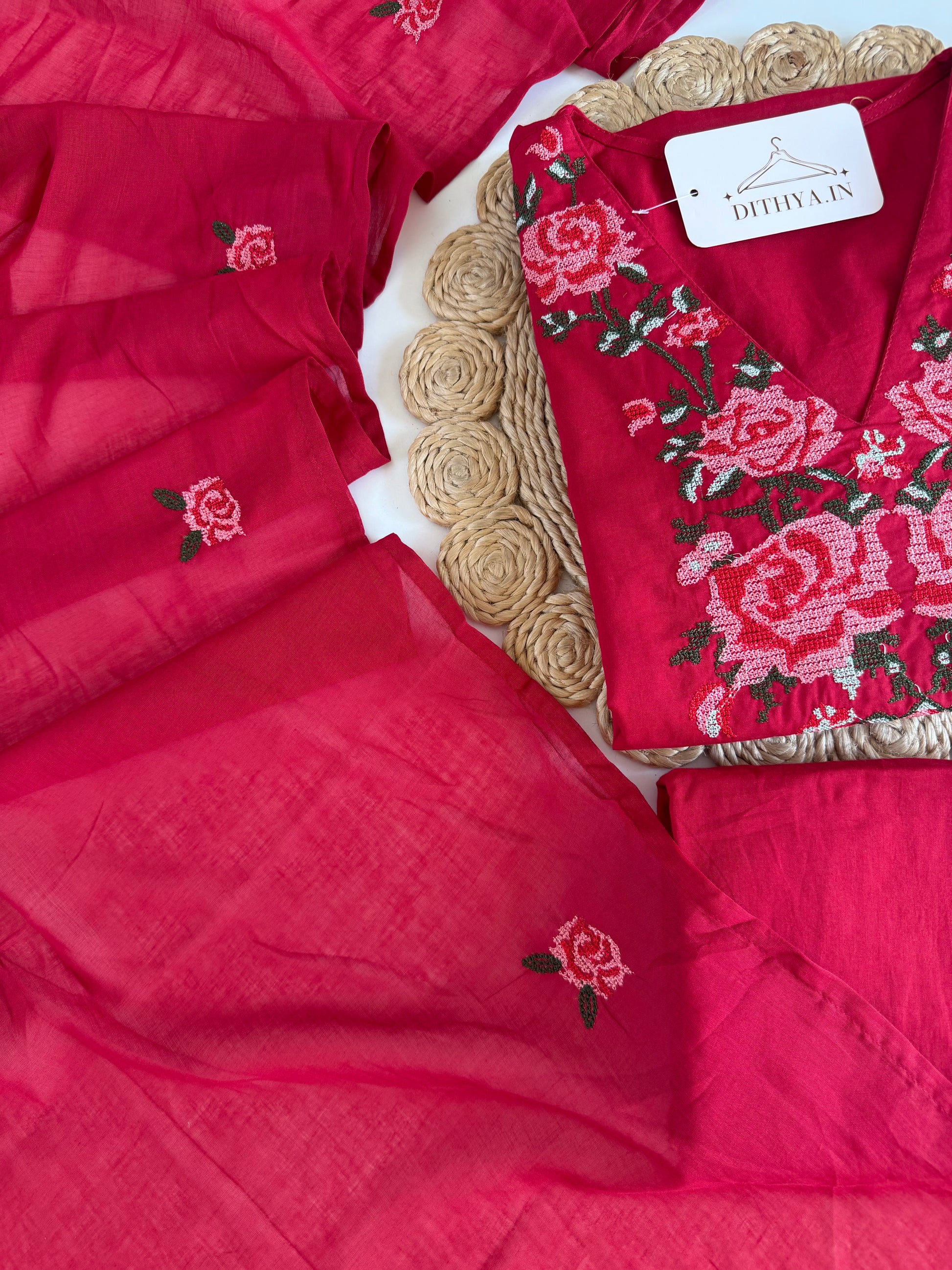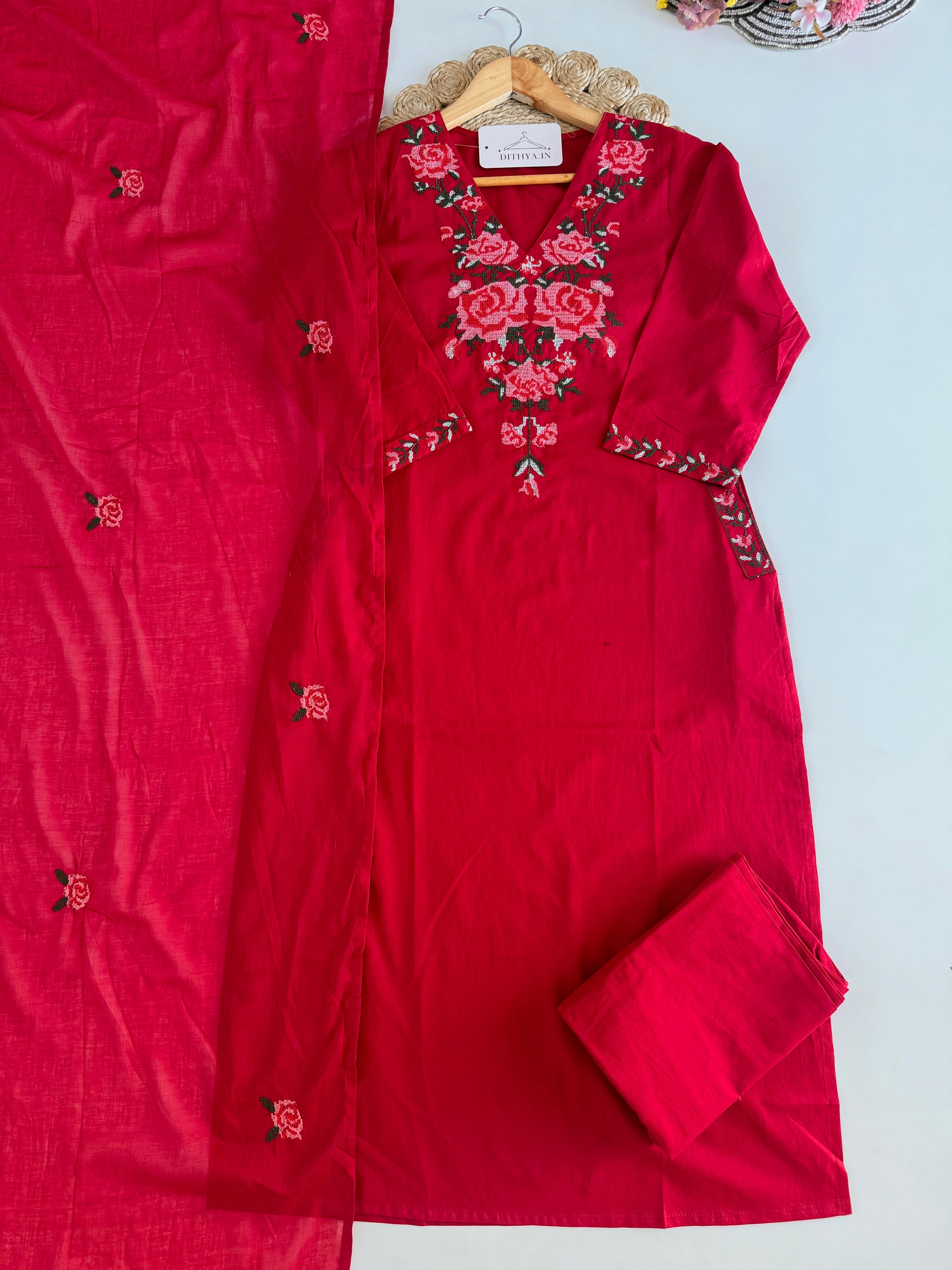K270 - Mul cotton embroidered straight Kurti with pants and dupatta