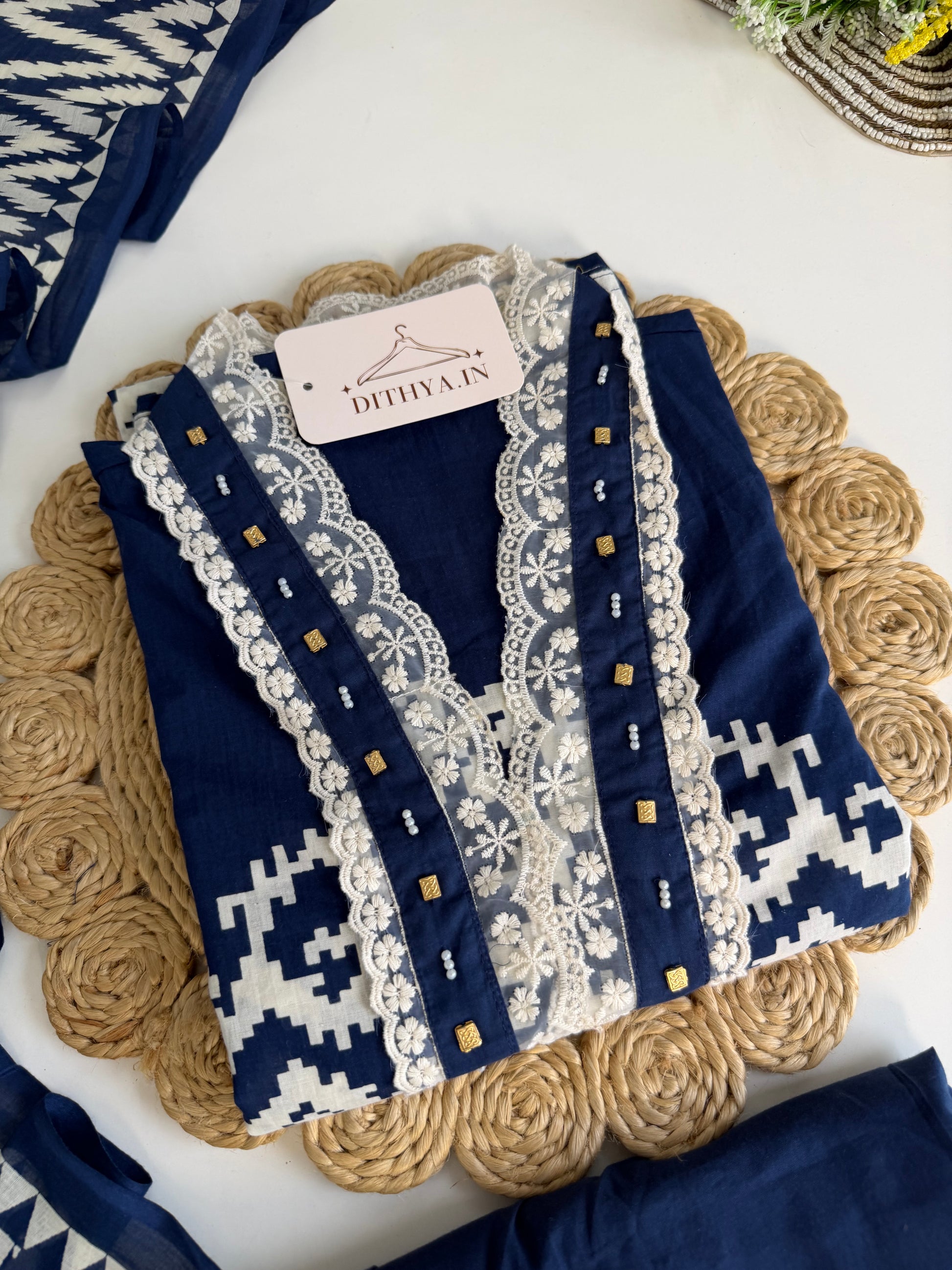 Elevate your ethnic wardrobe with this sophisticated mul cotton ensemble. The straight-cut kurti features intricate embroidery that adds refined elegance to your everyday look. Crafted from breathable mul cotton, this three-piece set includes coordinated pants and a flowing dupatta, offering complete styling versatility. Perfect for casual gatherings, festive occasions, or comfortable home wear, this piece combines traditional craftsmanship with modern silhouettes. The lightweight fabric ensures all-day comfort in warm climates, while the detailed embroidery work showcases quality artisanship. An essential addition for those who appreciate timeless ethnic fashion with contemporary appeal.