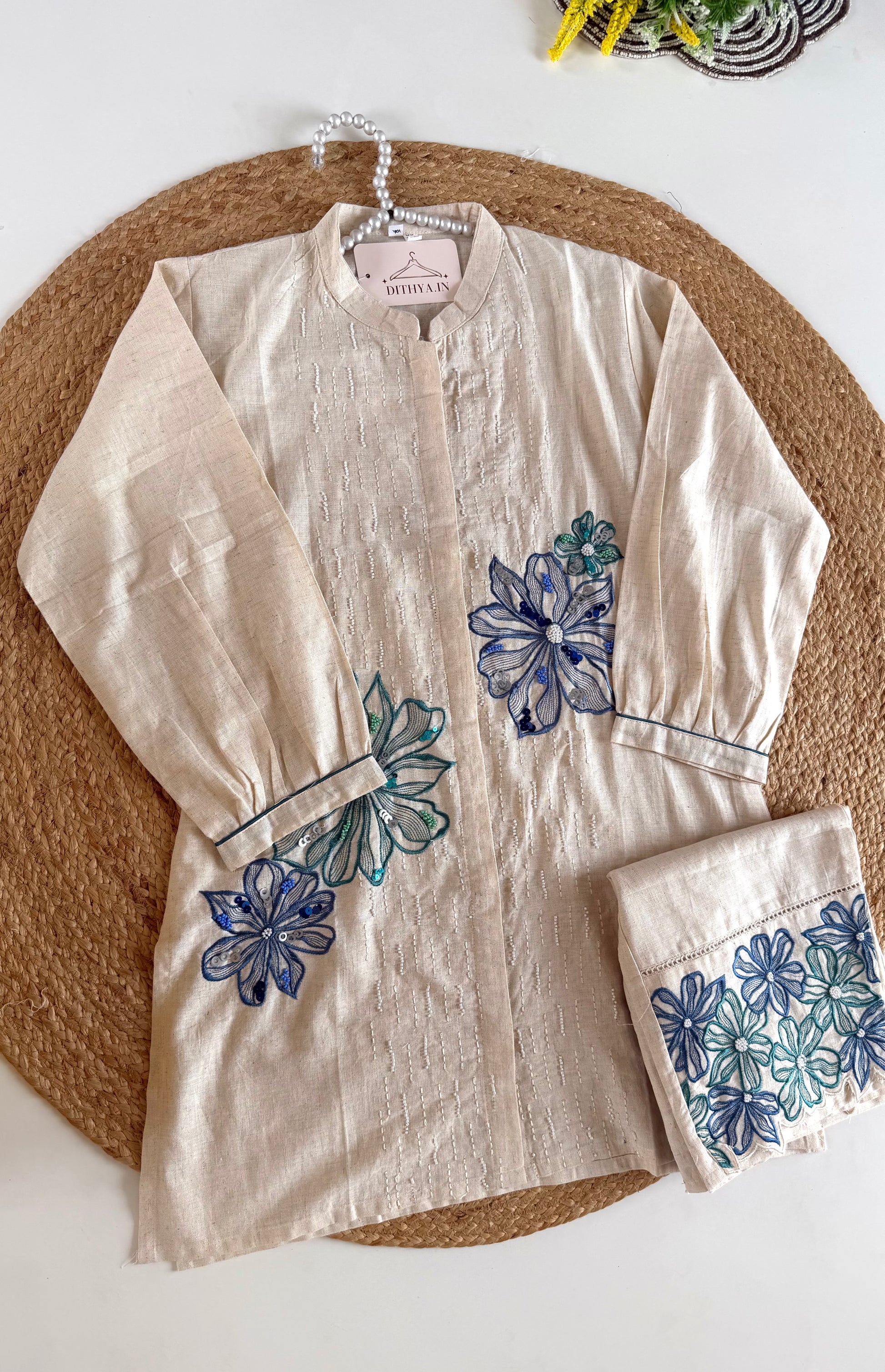 This elegant Mul cotton handwork coord set offers a delicate combination of comfort and style. Made from high-quality Mul cotton, it features intricate handwork details that add a touch of sophistication. Perfect for any occasion, this set is sure to elevate your wardrobe with its timeless appeal.