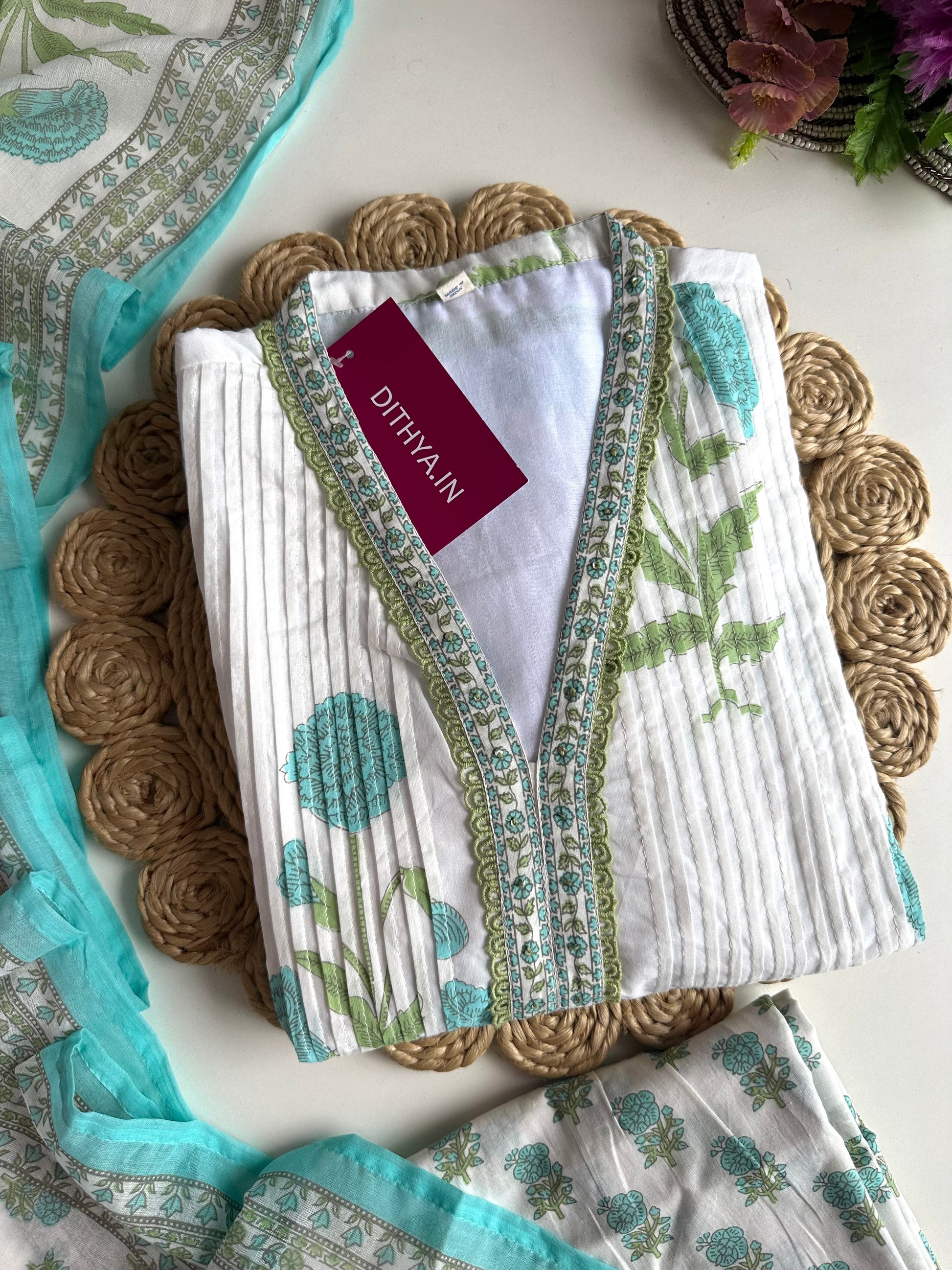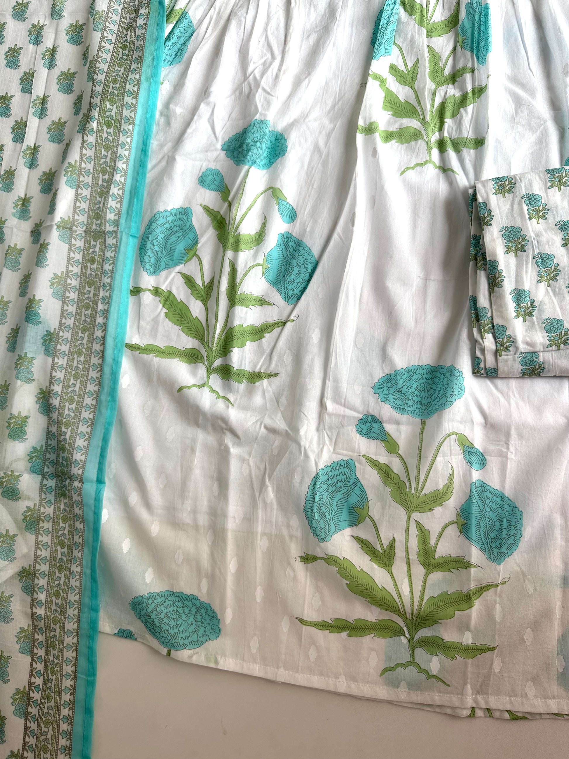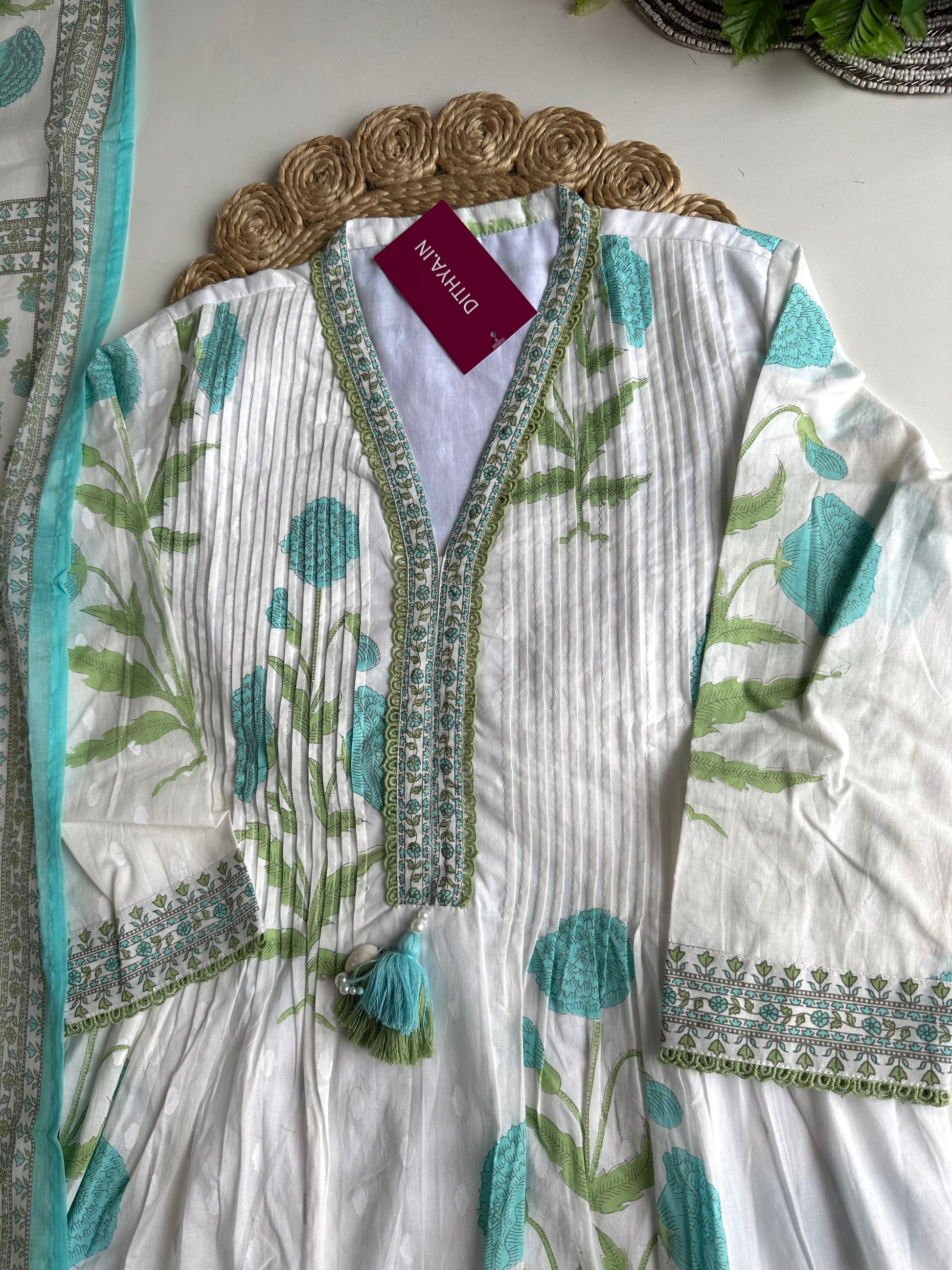 K340 - Mul cotton pintex floral Aline Kurti with pants and dupatta