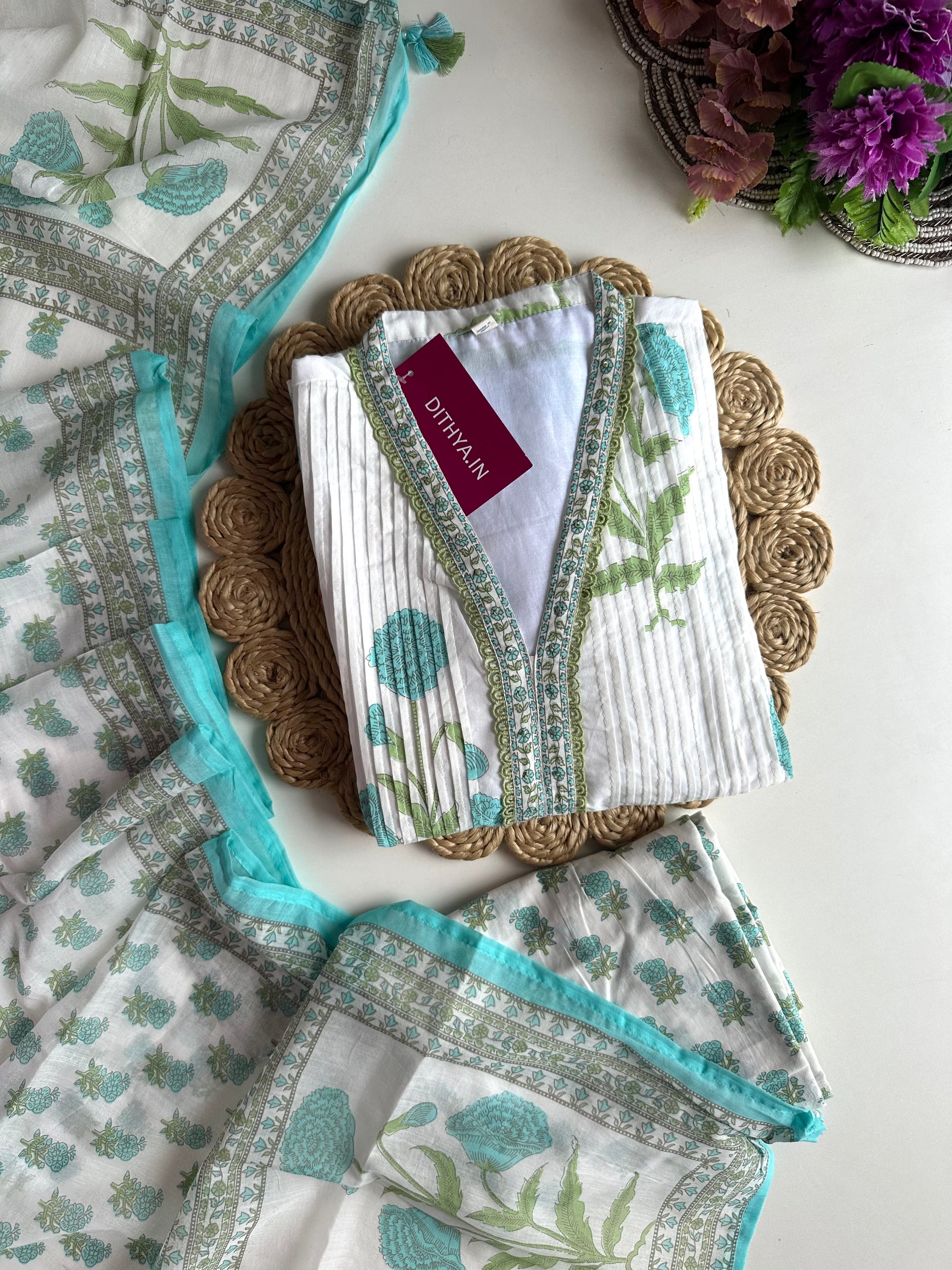 Expertly crafted from Mul cotton, this Aline Kurti features intricate pintex floral detailing. Accompanied by comfortable pants and a matching dupatta, this stylish ensemble offers a versatile and elegant addition to your wardrobe. Perfect for any occasion, it provides both comfort and style in equal measure.