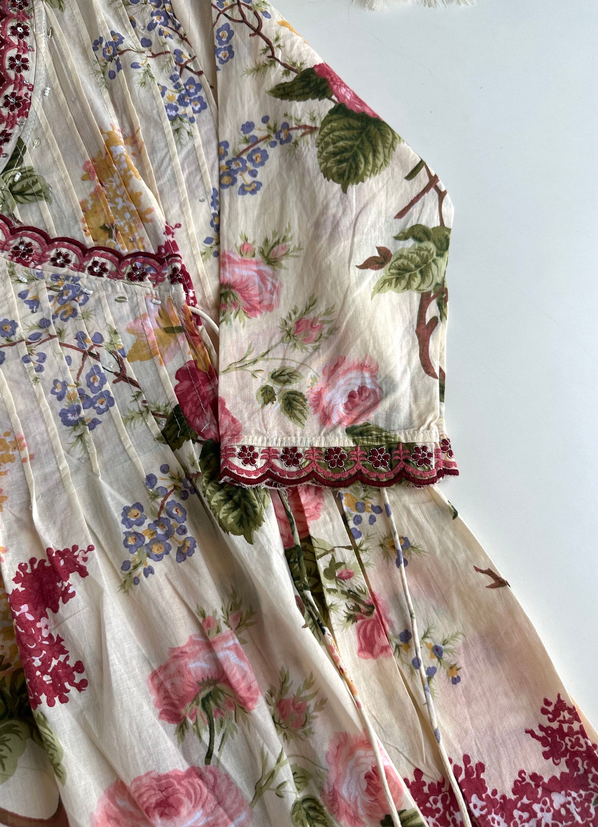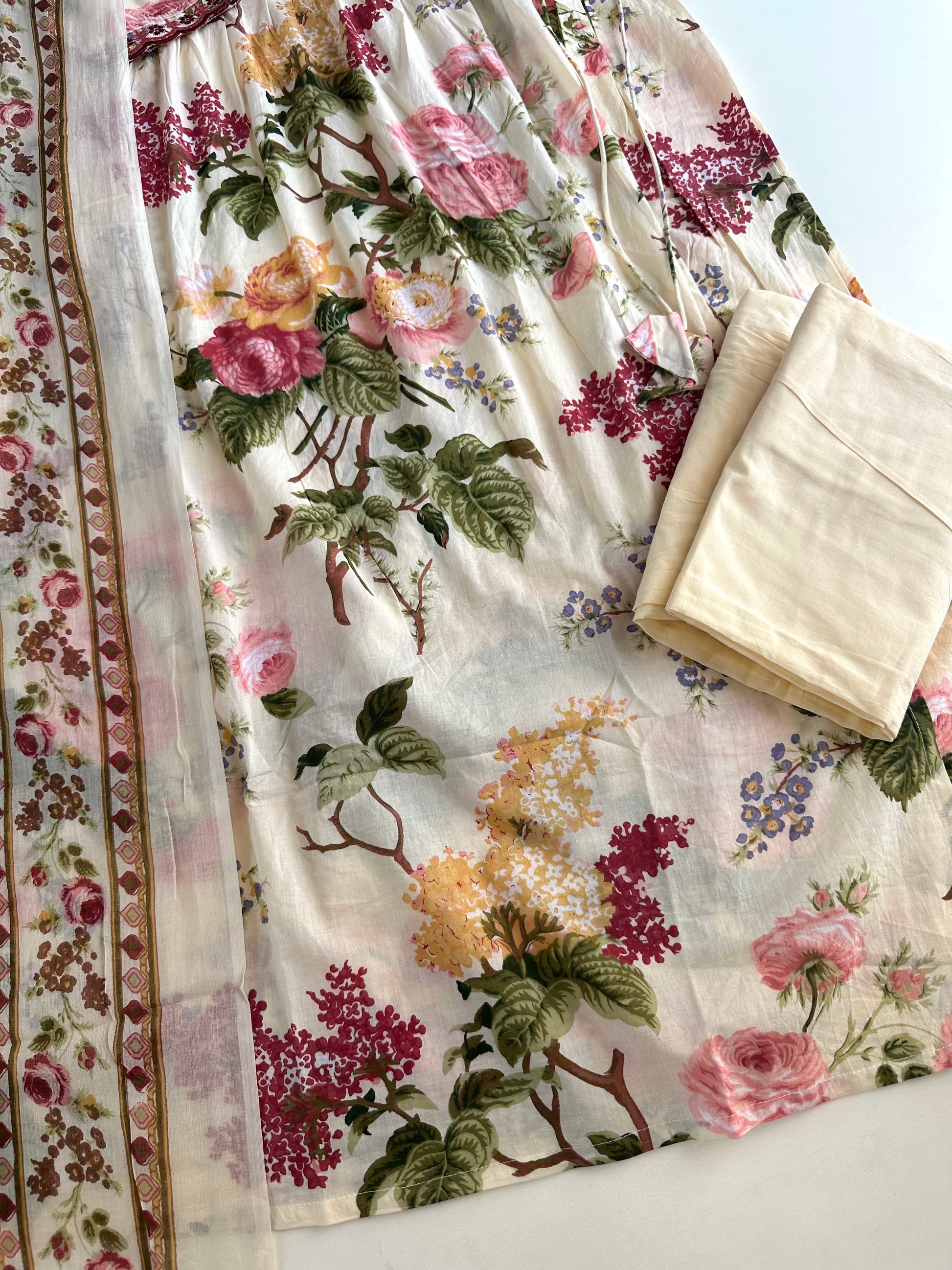 K465 - Mul cotton pleated floral Aline Kurti with pants and dupatta