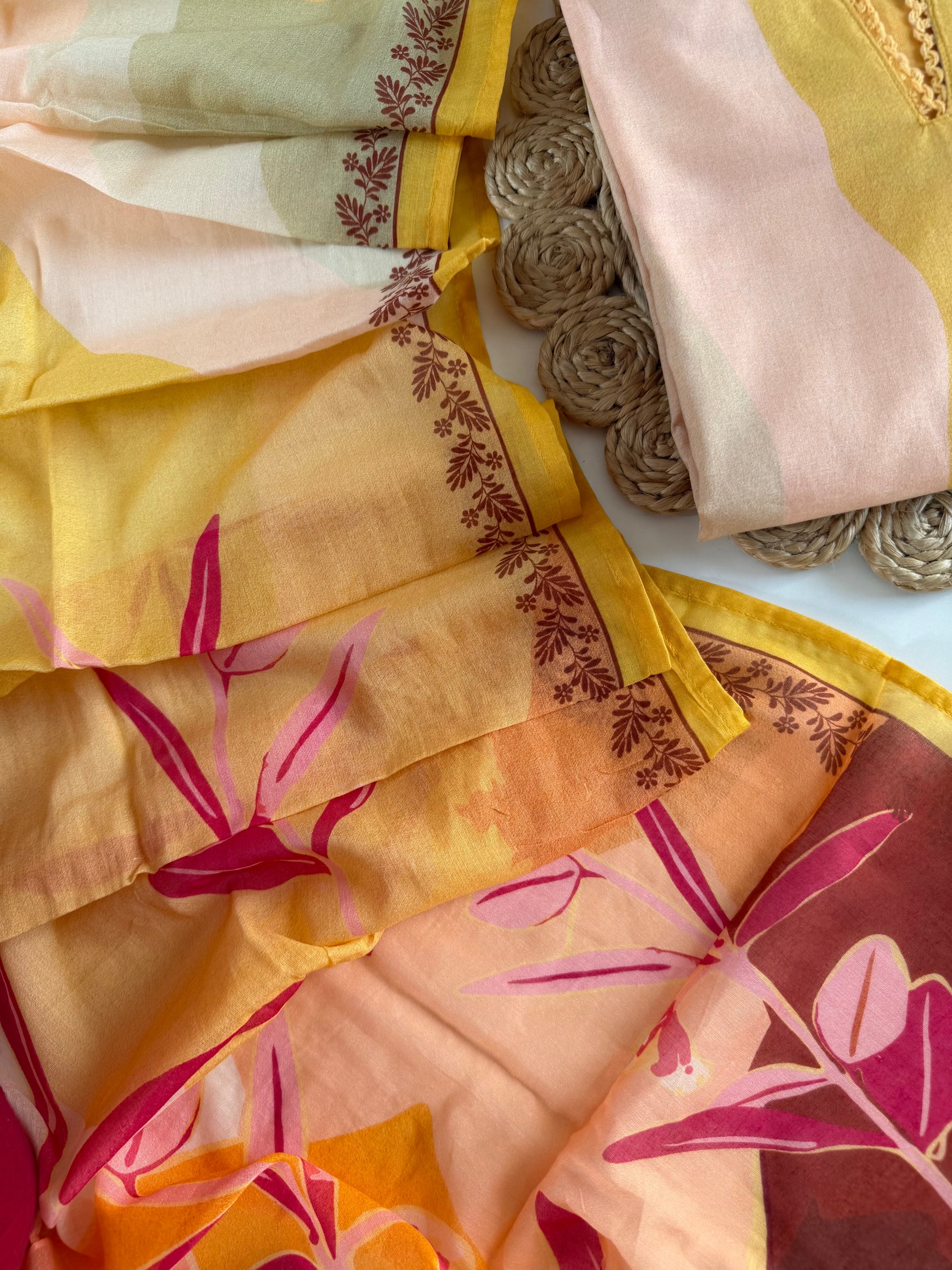 This Kurti is made of Mul cotton fabric, providing a comfortable and breathable fit. The straight cut design offers a simple yet elegant look. The set includes matching pants and dupatta for a complete outfit. Stay stylish and comfortable with this versatile ensemble.