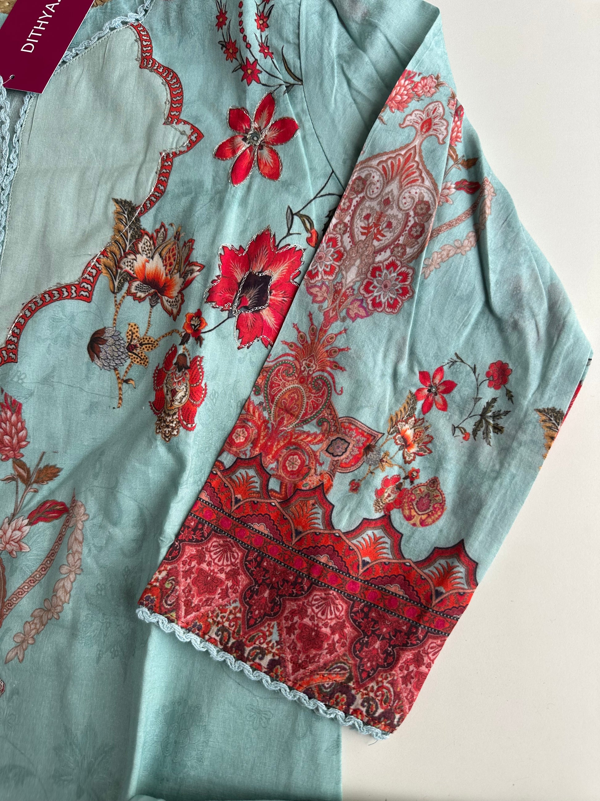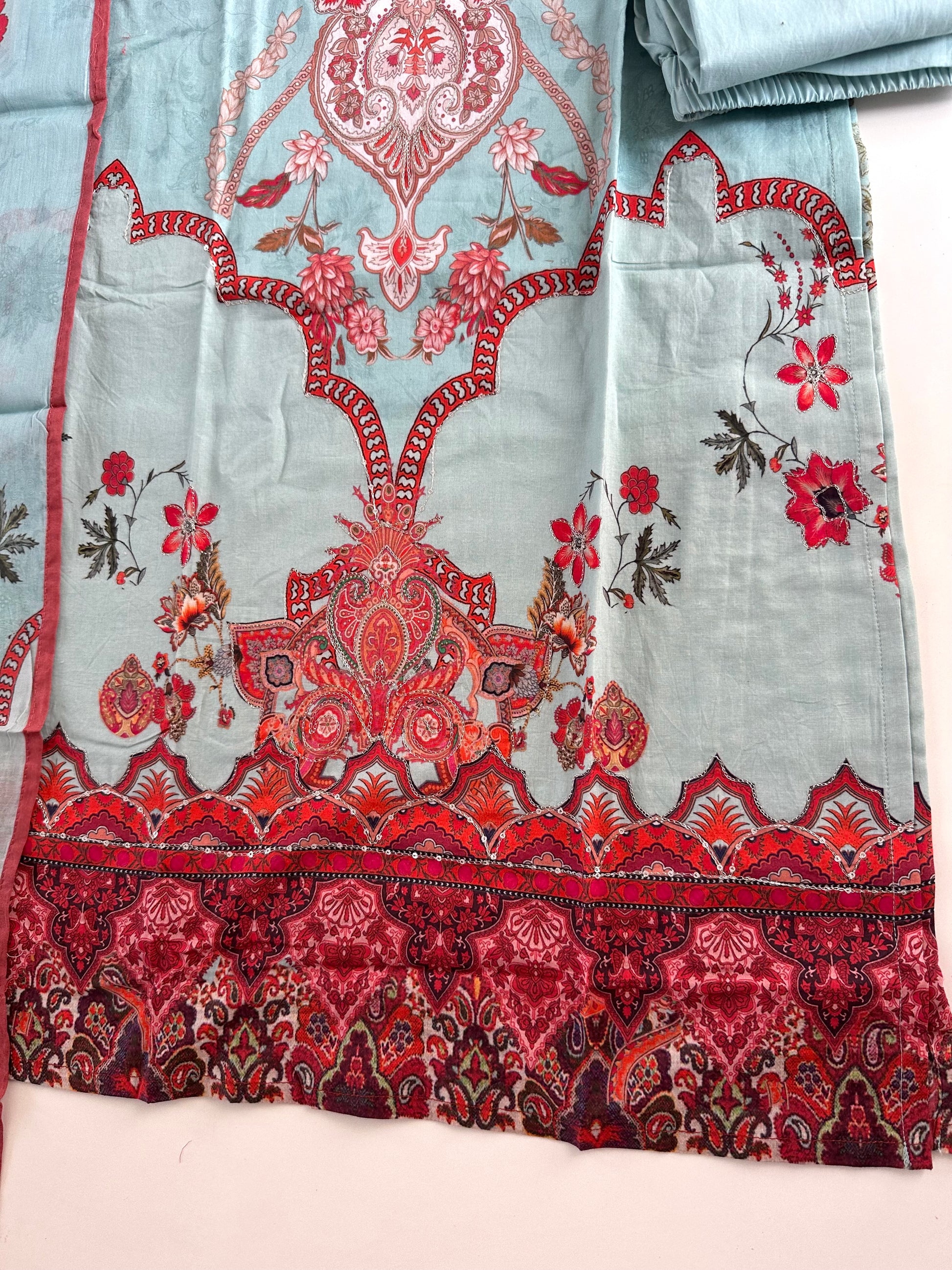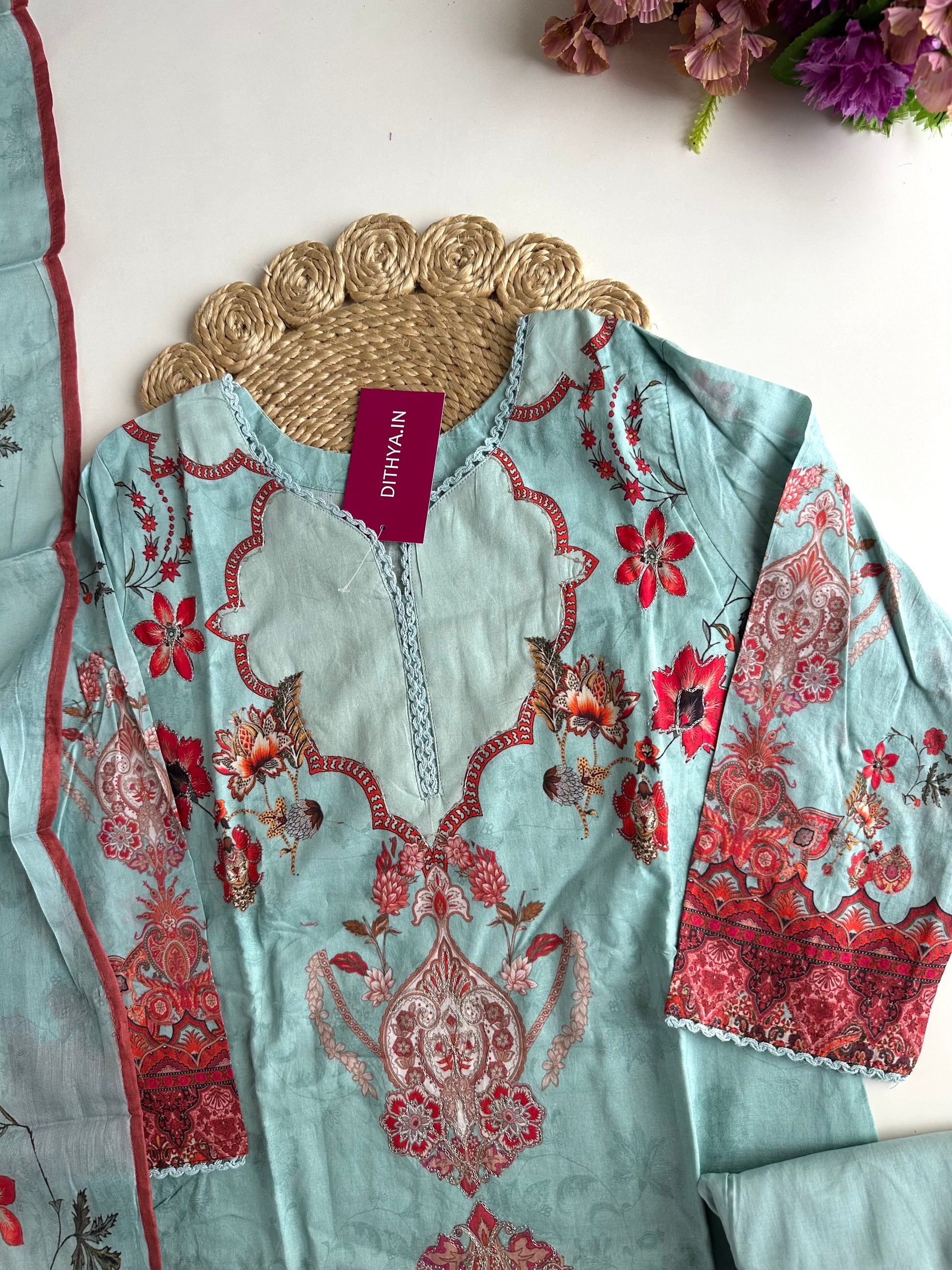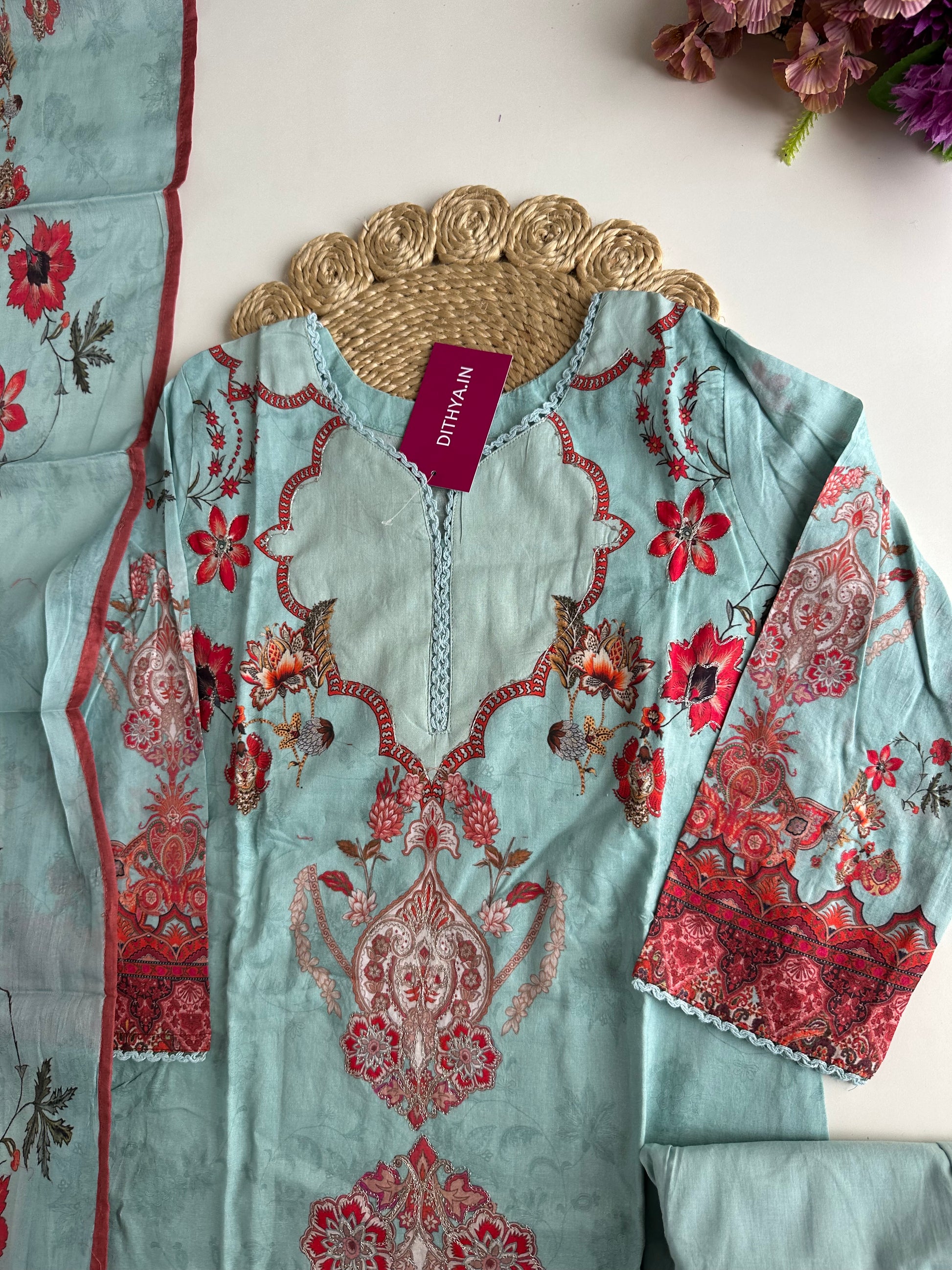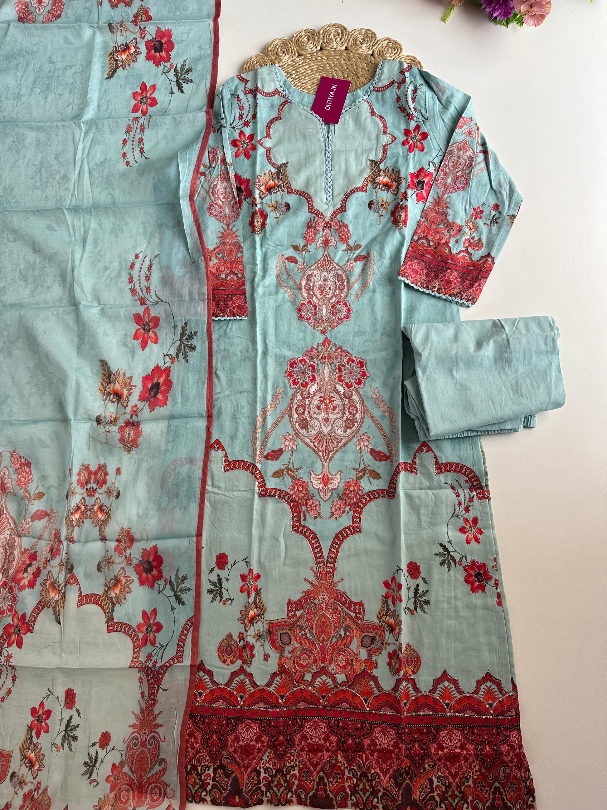 The Mul Cotton straight Kurti comes with matching pants and dupatta, making it a complete outfit. Made with high-quality Mul Cotton, it offers a comfortable fit and a sleek, straight design. Perfect for any occasion, elevate your style with this versatile and elegant ensemble.