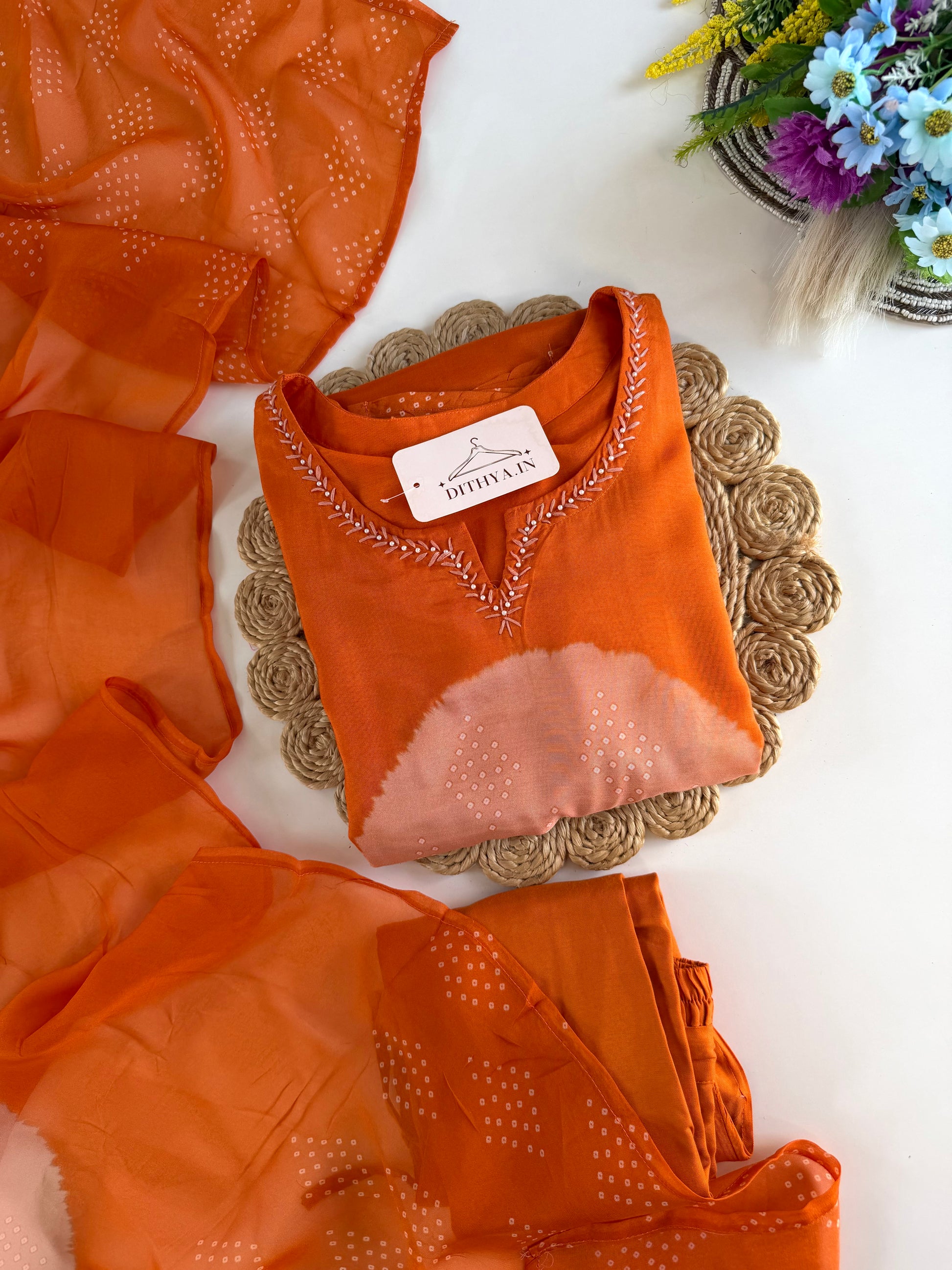 Elevate your ethnic wardrobe with this exquisite muslin bandhini Aline kurti ensemble. Crafted from breathable muslin fabric, the kurti features traditional bandhini tie-dye patterns that add timeless charm and visual interest. The flattering Aline silhouette ensures comfortable movement while maintaining an elegant drape. This complete three-piece set includes coordinated pants and a flowing dupatta, making it perfect for festive occasions, casual gatherings, or everyday wear. The natural texture of muslin keeps you cool and comfortable, while the intricate bandhini work showcases authentic craftsmanship. An versatile piece that seamlessly transitions from day to evening celebrations.