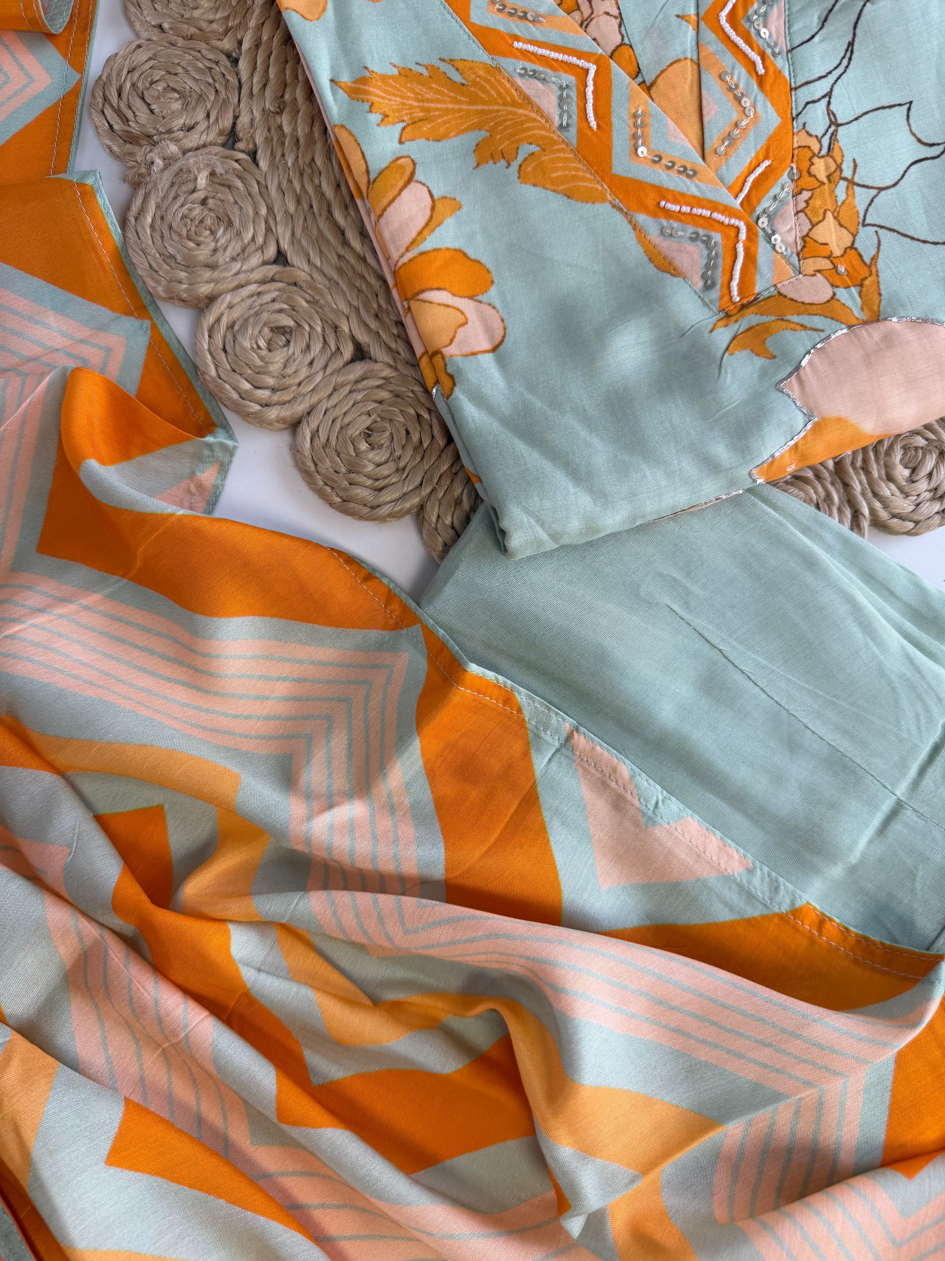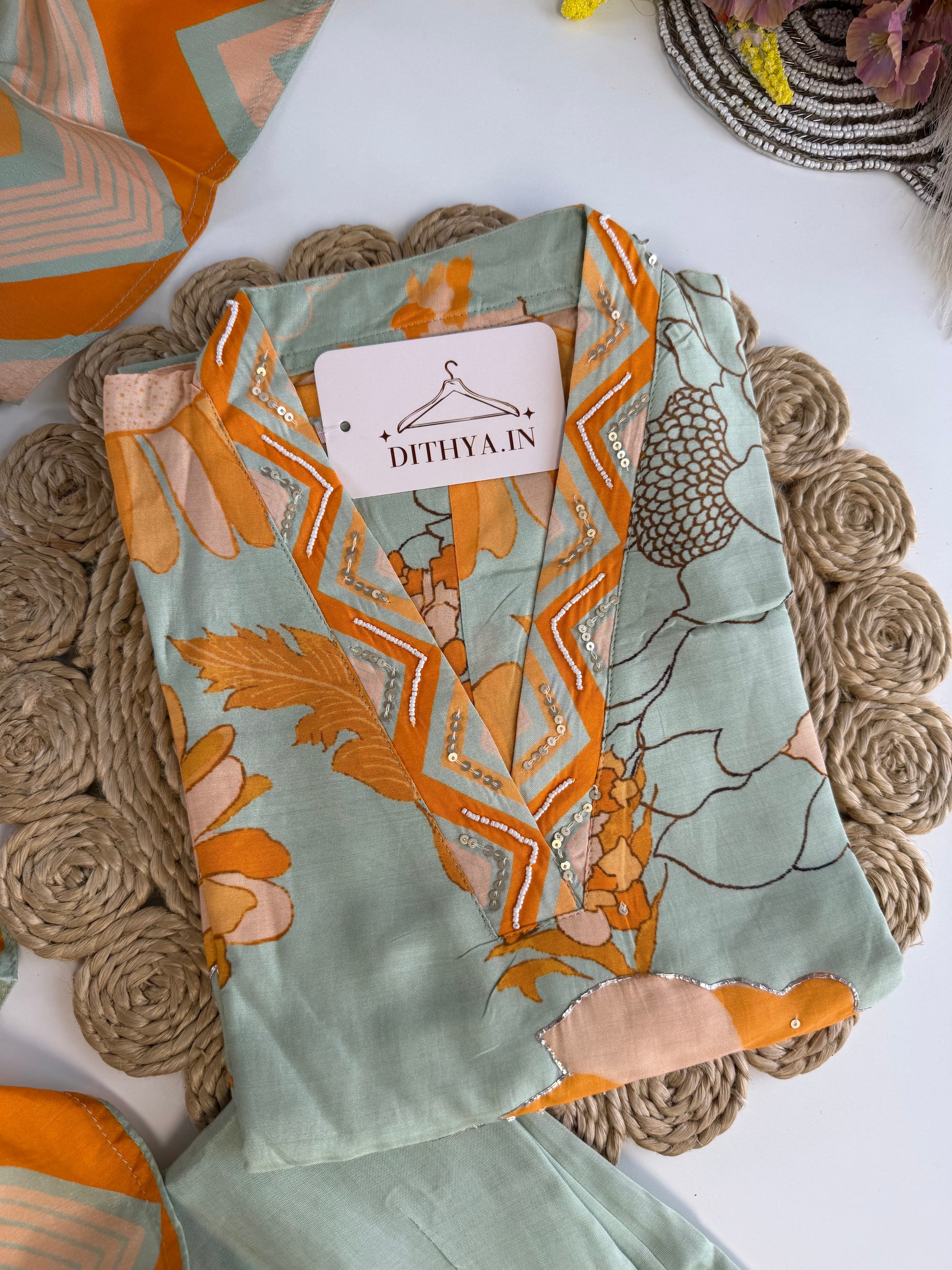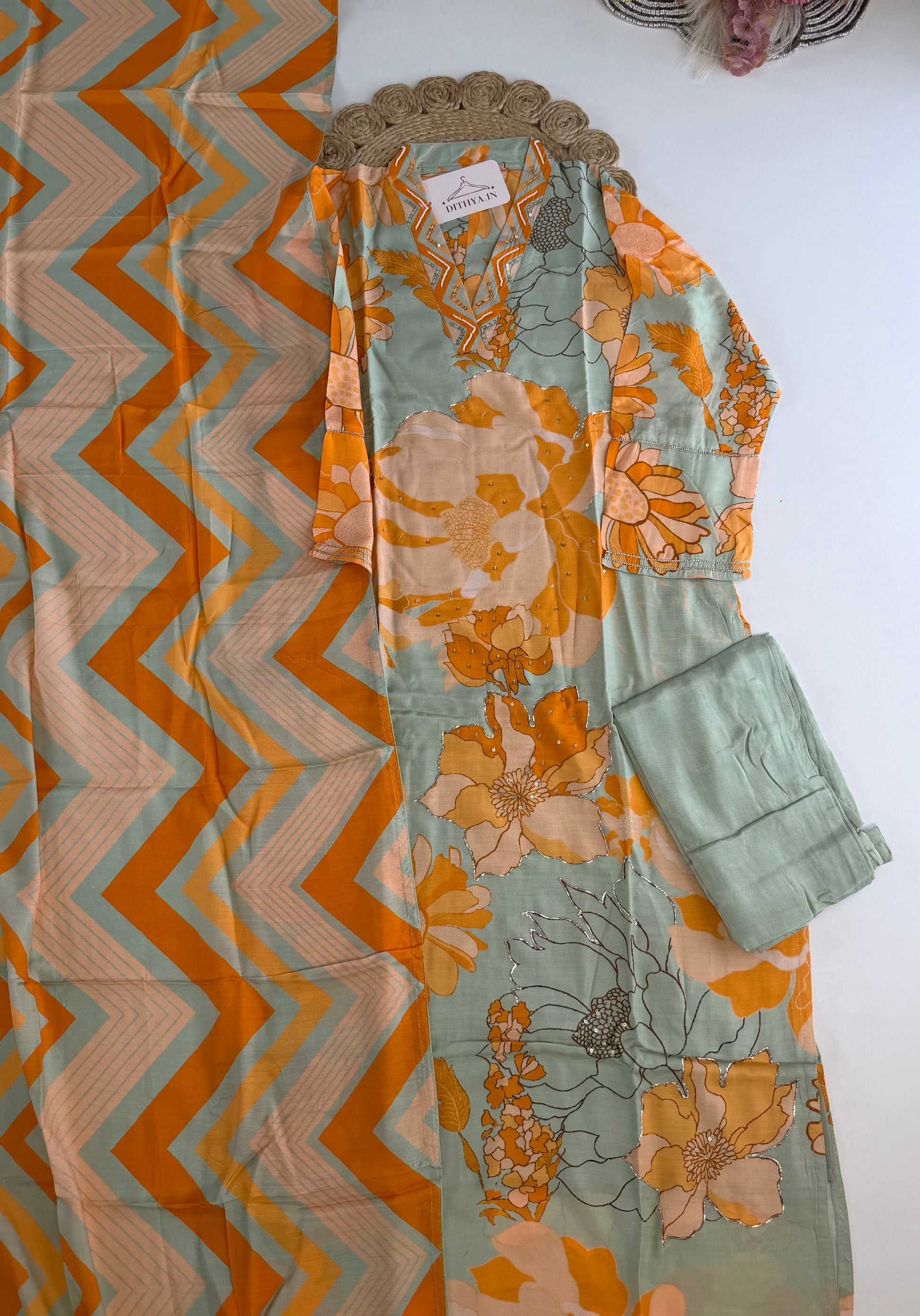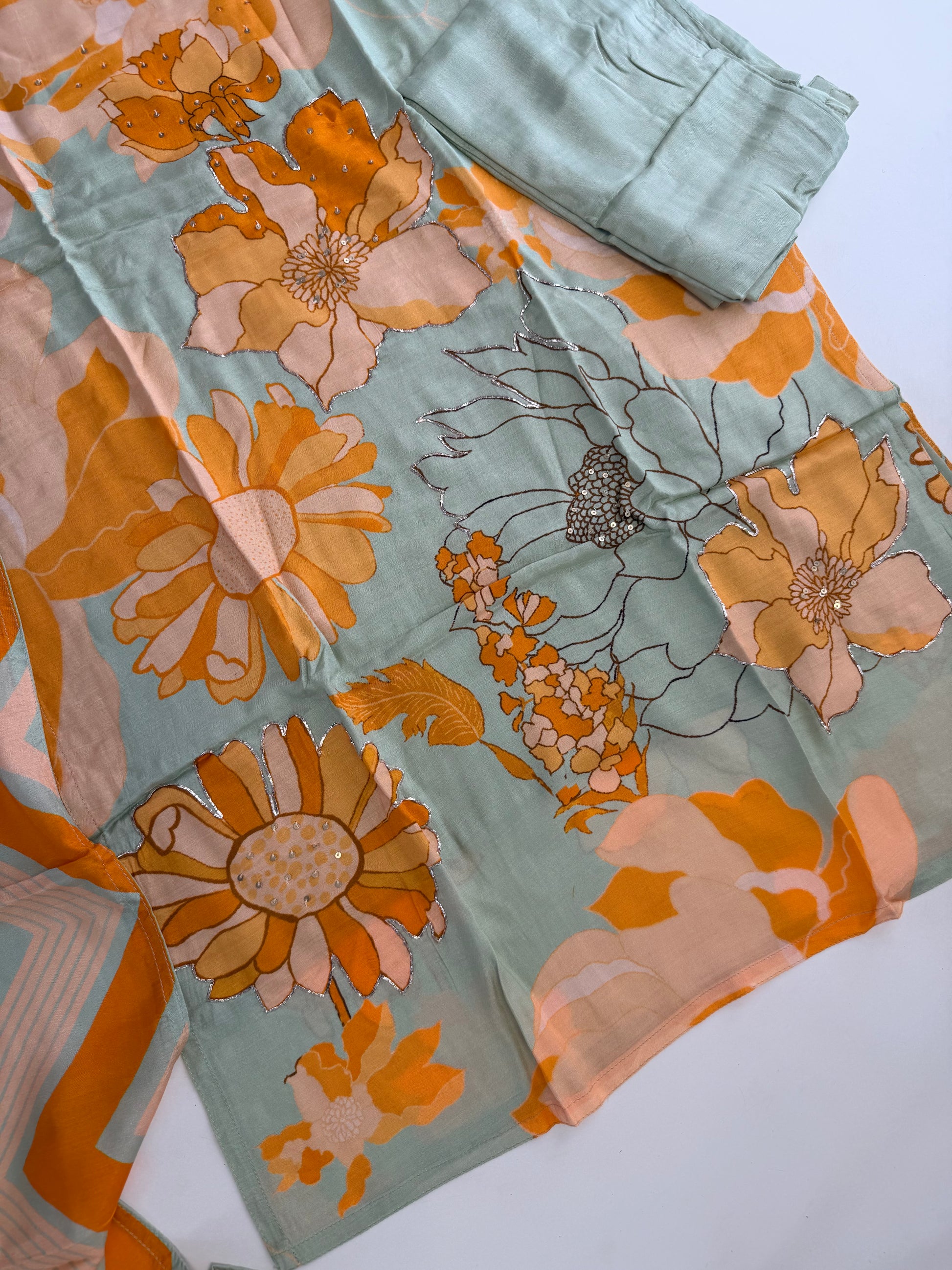 K505 - Muslin handwork floral straight Kurti with pants and dupatta in 2 colours