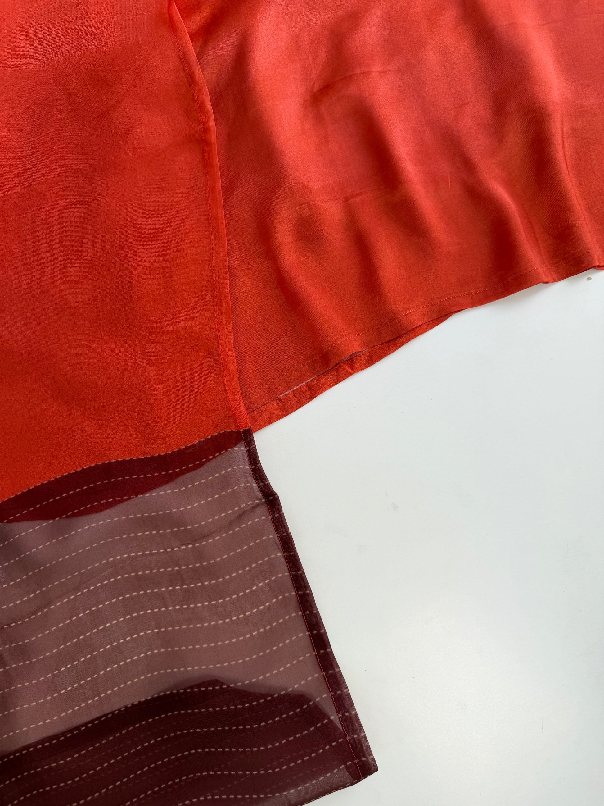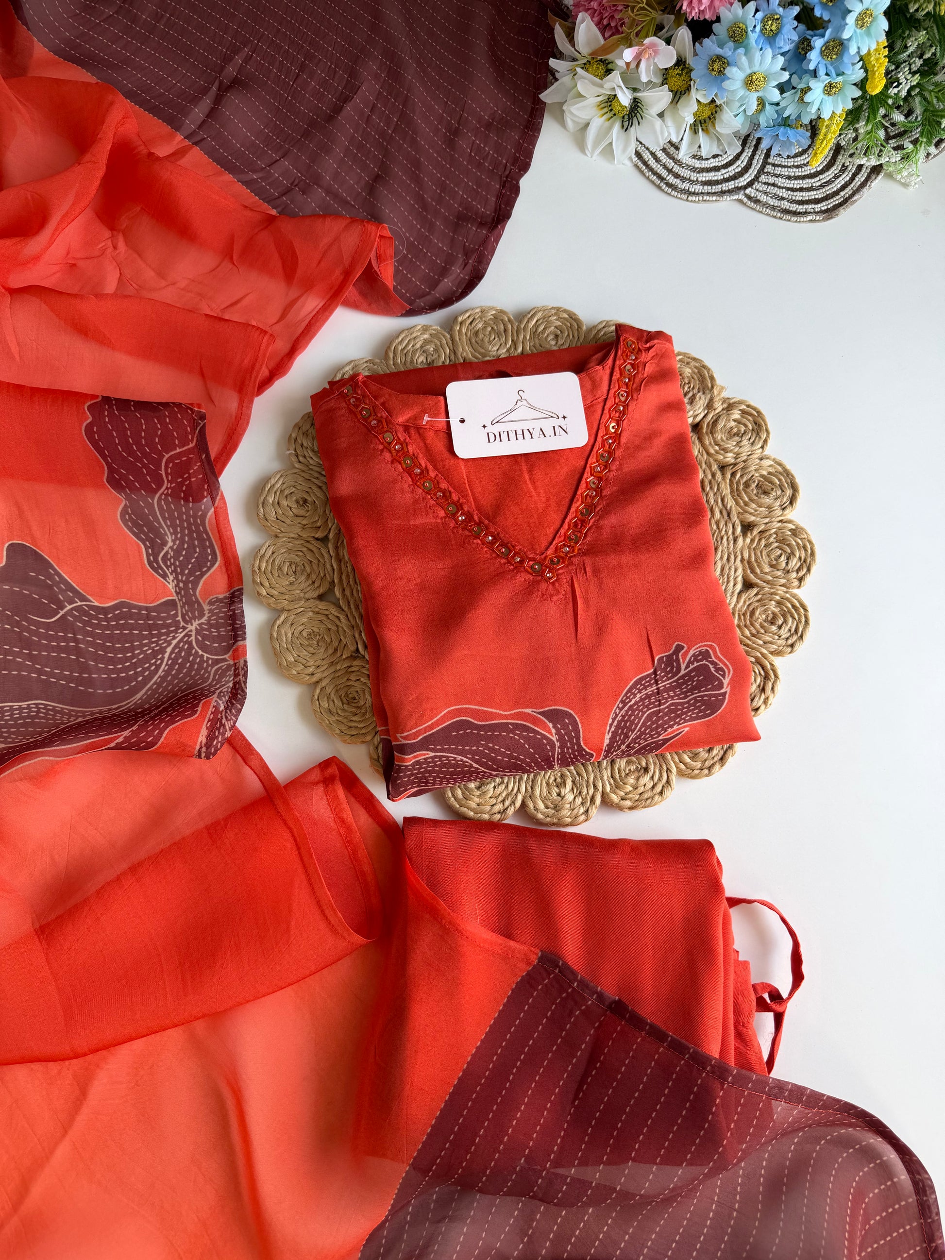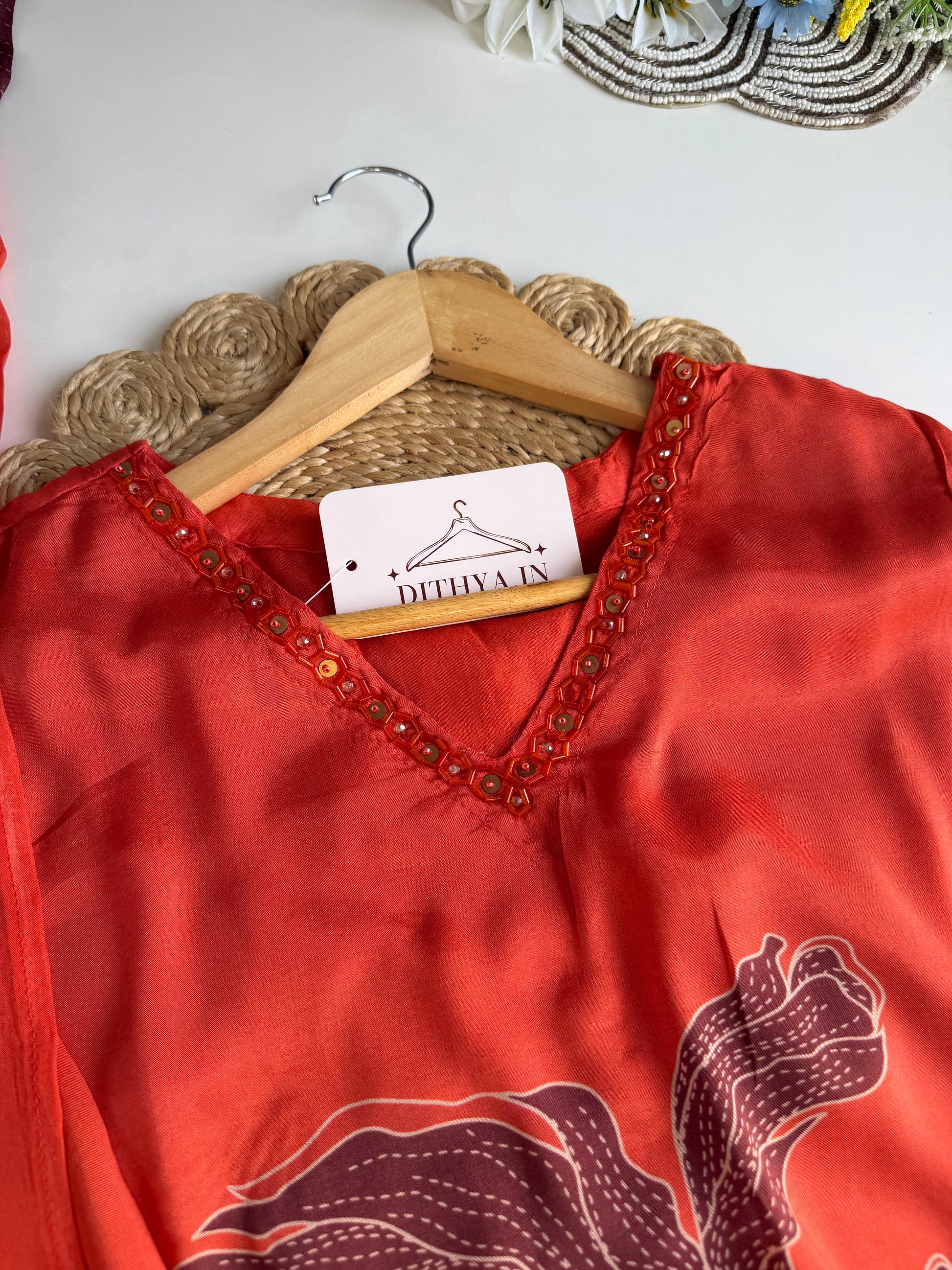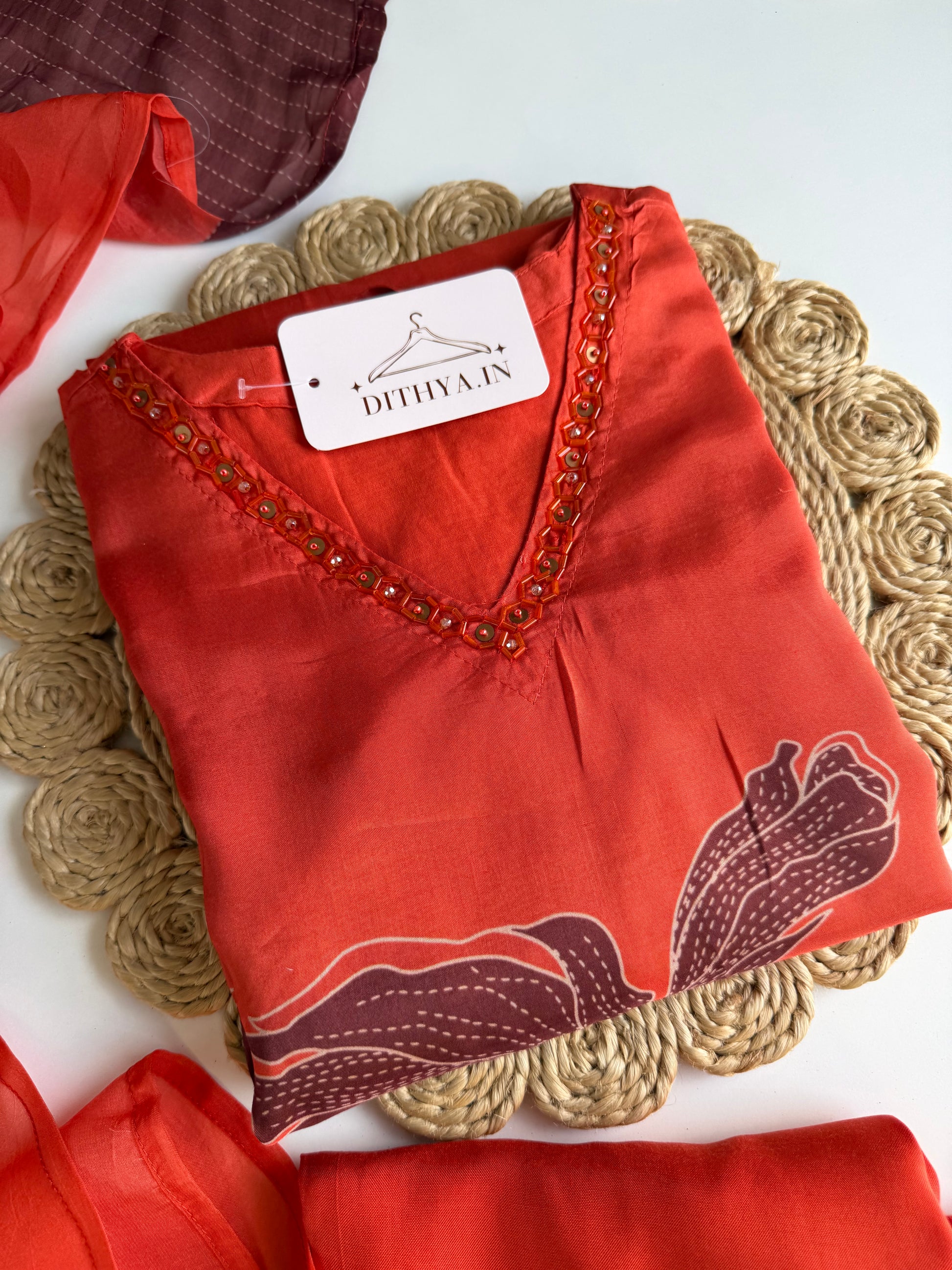 K336 - Muslin silk handwork Aline Kurti with pants and dupatta
