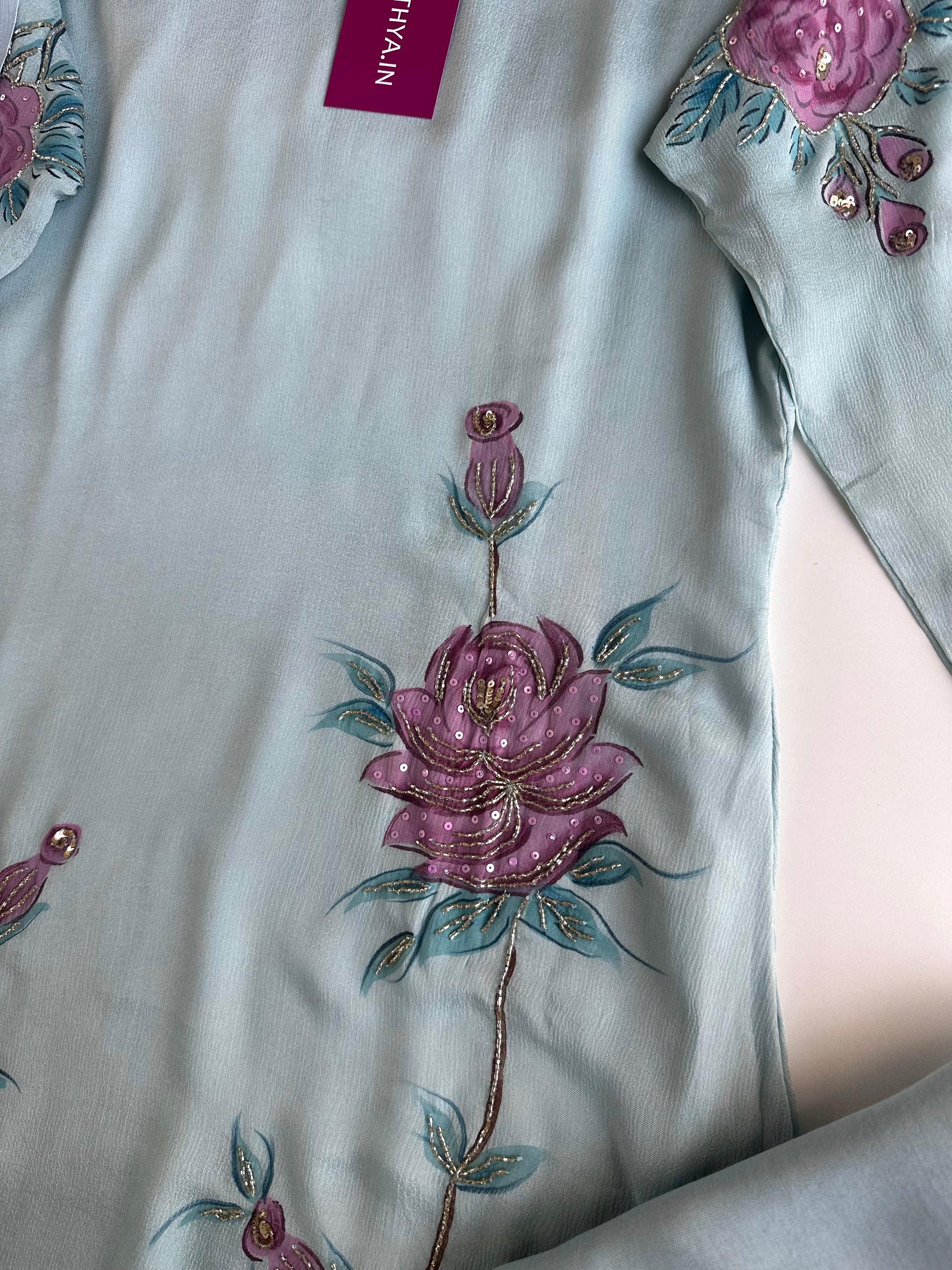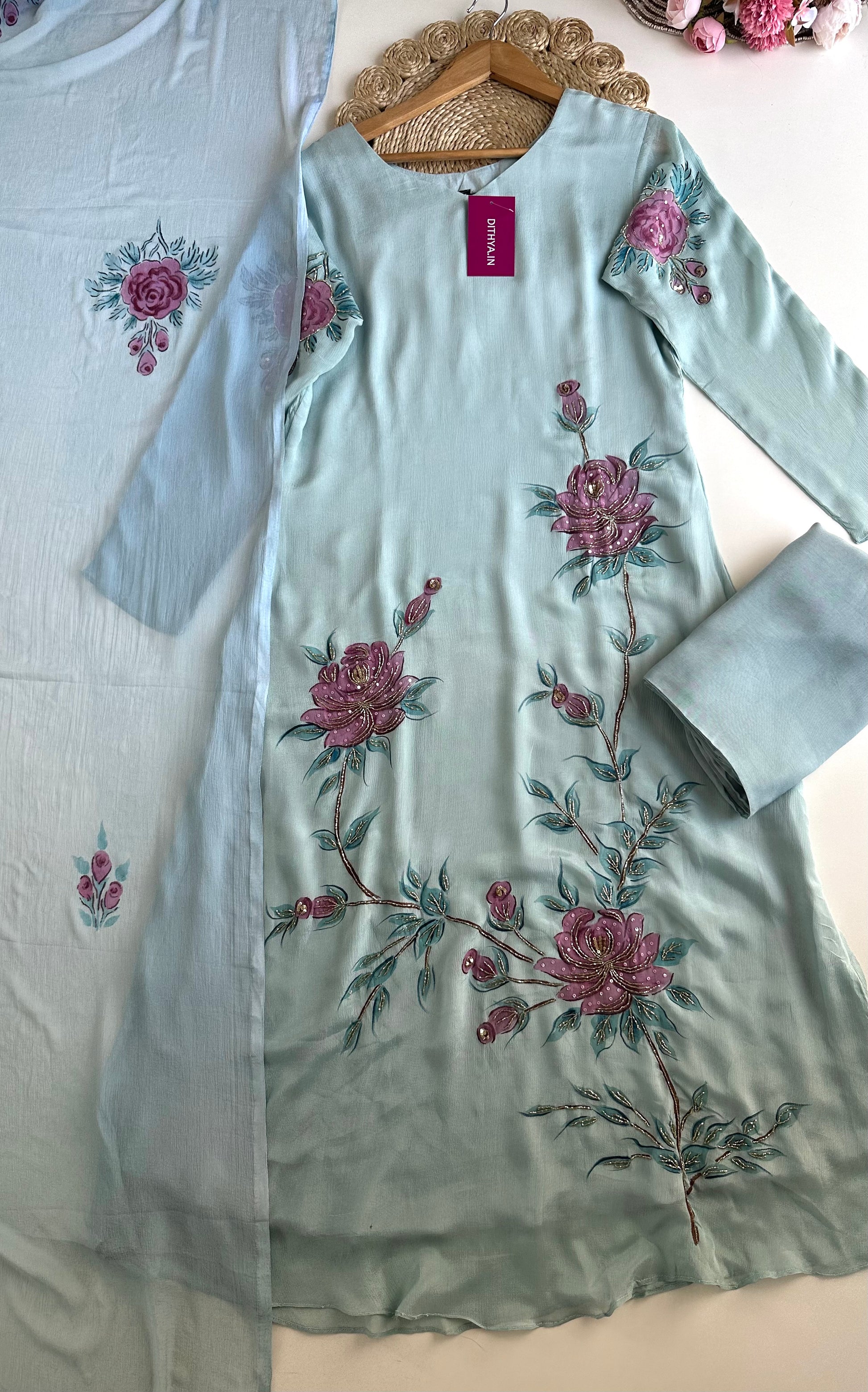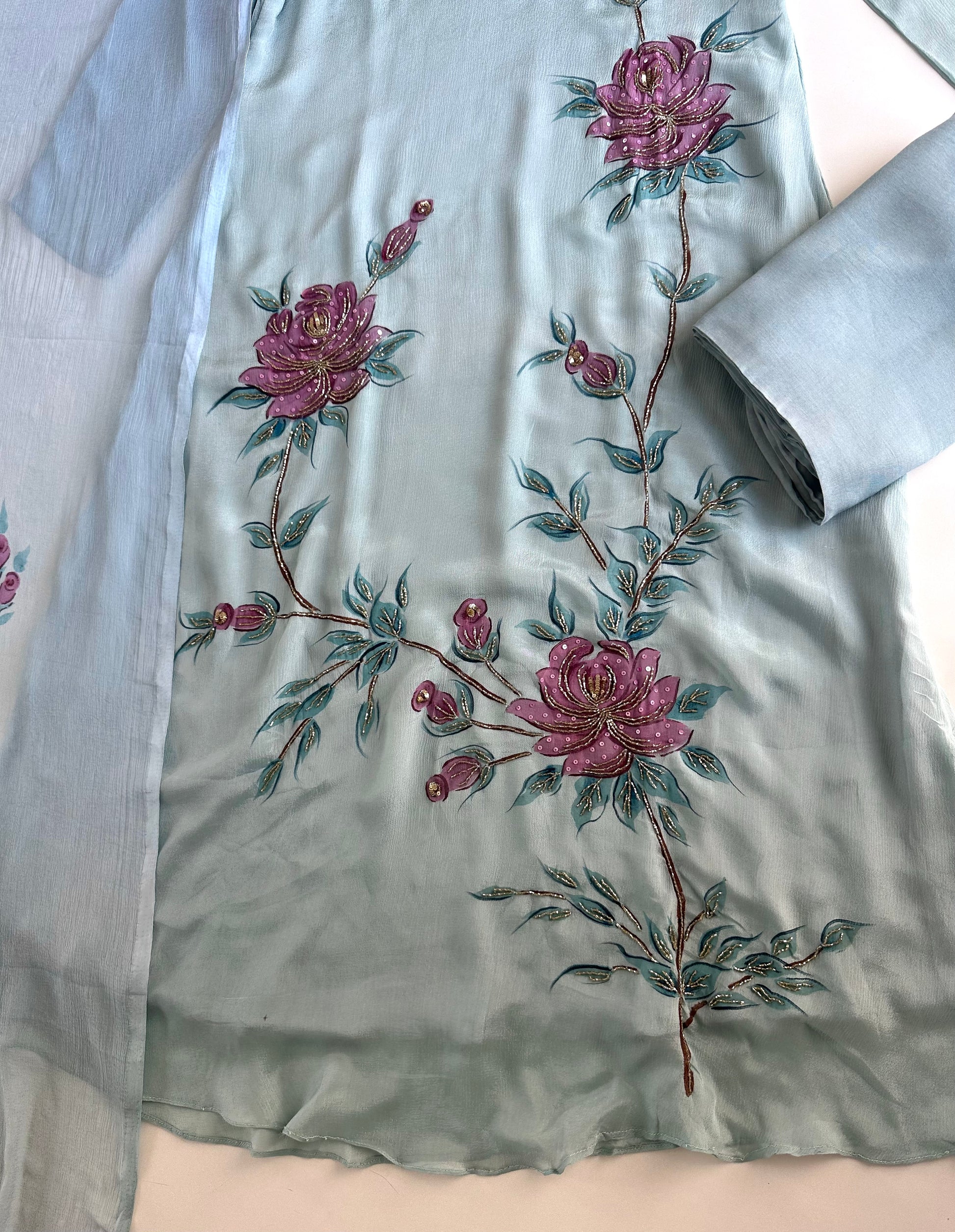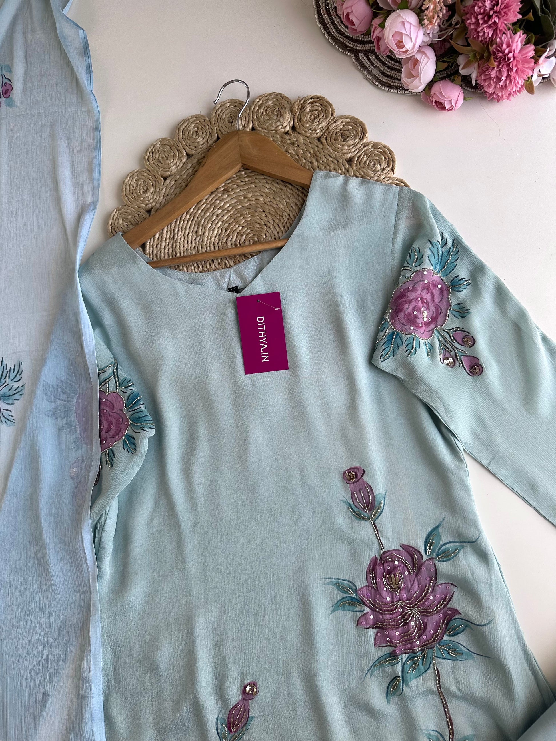 K325 - Pure Chinnon handwork Aline Kurti with pants and dupatta